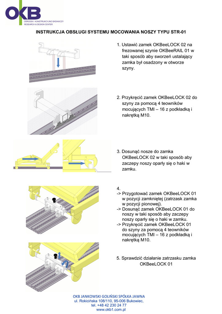INSTRUKCJA OBSŁUGI SYSTEMU MOCOWANIA NOSZY TYPU STR-01 1. Ustawić zamek OKBeeLOCK 02 na frezowanej szynie OKBeeRAIL 01 w taki sposób aby sworzeń ustalający zamka był osadzony w otworze szyny. 2. Przykręcić zamek OKBeeLOCK 02 do szyny za pomocą 4 teowników mocujących TMI – 16 z podkładką i nakrętką M10. 3. Dosunąć nosze do zamka OKBeeLOCK 02 w taki sposób aby zaczepy noszy oparły się o haki w zamku. 4. -> Przygotować zamek OKBeeLOCK 01 w pozycji zamkniętej (zatrzask zamka w pozycji pionowej). -> Dosunąć zamek OKBeeLOCK 01 do noszy w taki sposób aby zaczepy noszy oparły się o haki w zamku. -> Przykręcić zamek OKBeeLOCK 01 do szyny za pomocą 4 teowników mocujących TMI – 16 z podkładką i nakrętką M10. 5. Sprawdzić działanie zatrzasku zamka OKBeeLOCK 01 OKB JANKOWSKI GOLIŃSKI SPÓŁKA JAWNA ul. Rokicińska 108/110, 95-006 Bukowiec, tel. +48 42 230 24 77 www.okb1.com.pl LISTA KOMPONENTÓW SYSTEMU MOCOWANIA NOSZY TYPU STR-01 Zamek stały OKBeeLOCK 02 1 szt. Zamek ruchomy OKBeeLOCK 01 1 szt. Teownik mocujący TMI - 16 8 szt. Podkładka 10 8 szt. Nakrętka M10 8 szt. Normalia UWAGA: SYSTEM MOCOWANIA NOSZY typ STR-01 zbadano na zgodność z wymaganiami normy TSFS 2010:2, Załącznik 3, pkt P2 a wyniki badań zawarto w sprawozdaniu o numerze PL13060025. OKB JANKOWSKI GOLIŃSKI SPÓŁKA JAWNA ul. Rokicińska 108/110, 95-006 Bukowiec, tel. +48 42 230 24 77 www.okb1.com.pl