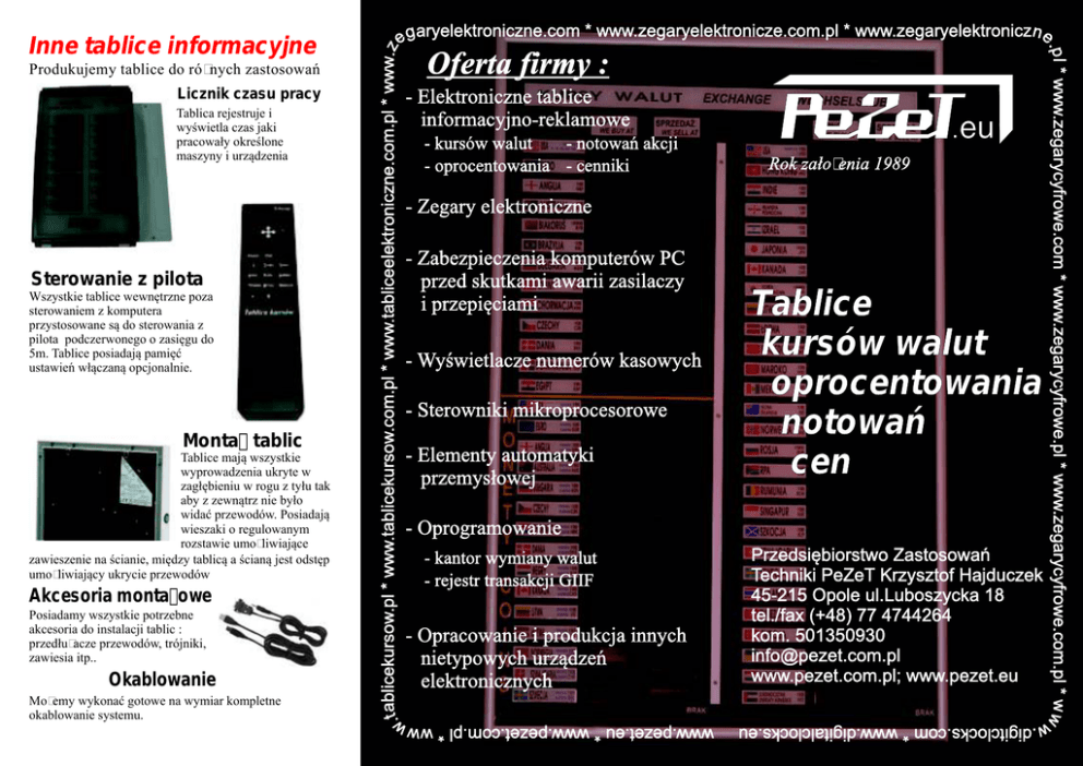 Inne tablice informacyjne Produkujemy tablice do różnych zastosowań np.: Licznik czasu pracy Tablica rejestruje i wyświetla czas jaki pracowały określone maszyny i urządzenia Oferta firmy : - Elektroniczne tablice informacyjno-reklamowe - kursów walut - notowań akcji - oprocentowania - cenniki Rok założenia 1989 - Zegary elektroniczne Sterowanie z pilota Wszystkie tablice wewnętrzne poza sterowaniem z komputera przystosowane są do sterowania z pilota podczerwonego o zasięgu do 5m. Tablice posiadają pamięć ustawień włączaną opcjonalnie. - Zabezpieczenia komputerów PC przed skutkami awarii zasilaczy i przepięciami - Wyświetlacze numerów kasowych - Sterowniki mikroprocesorowe Montaż tablic Tablice mają wszystkie wyprowadzenia ukryte w zagłębieniu w rogu z tyłu tak aby z zewnątrz nie było widać przewodów. Posiadają wieszaki o regulowanym rozstawie umożliwiające zawieszenie na ścianie, między tablicą a ścianą jest odstęp umożliwiający ukrycie przewodów Akcesoria montażowe Posiadamy wszystkie potrzebne akcesoria do instalacji tablic : przedłużacze przewodów, trójniki, zawiesia itp.. Okablowanie Możemy wykonać gotowe na wymiar kompletne okablowanie systemu. - Elementy automatyki przemysłowej Tablice kursów walut oprocentowania notowań cen - Oprogramowanie - kantor wymiany walut - rejestr transakcji GIIF - Opracowanie i produkcja innych nietypowych urządzeń elektronicznych Przedsiębiorstwo Zastosowań Techniki PeZeT Krzysztof Hajduczek 45-215 Opole ul.Luboszycka 18 tel./fax (+48) 77 4744264 kom. 501350930 [email protected] www.pezet.com.pl; www.pezet.eu Produkujemy szeroki asortyment tablic wyświetlających dowolne wartości liczbowe stosowane w biznesie, reklamie i przemyśle. Podstawowe rodzaje tablic : ? tablice kursów walut dla kantorów i banków (kupno - sprzedaż po 5 cyfr na kurs ? tablice kursów walut dla banków (4 kolumny po 5 Podstawowy typoszereg tablic kursów walut Standardowe tablice wykonywane są z wyświetlaczy LED o wysokościach cyfr : 25 mm 20mm cyfr dewizy i pieniądze kupno i sprzedaż) ? tablice kursów kupna walut dla hoteli i innych 14mm punktów w których można płacić w kilku walutach ? tablice oprocentowania ? tablice notowań giełdowych ? tablice cenowe ? tablice wyświetlające wyniki produkcji, czas pracy, wydajność itp. ? tablice wyświetlające wielkości fizyczne z różnych czujników (temperatury, ciśnienia, skład, itp.) ? tablice wyświetlające wielkości elektryczne (pobory mocy, zużycie energii, prąd, napięcie). Charakteryzują się wysoką intensywnością świecenia na wprost i węższym kątem świecenia niż wewnętrzne. Obudowy są przystosowane do pracy w warunkach atmosferycznych. Do tablic dostarczane jest bezpłatnie oprogramowanie umożliwiające zarządzanie pojedyńczą tablicą oraz całymi systemami tablic. Cyfra 57mm Cyfra 25mm Cyfra 20mm Cyfra 14mm Oprogramowanie sterujące do PC Wyświetlanie skupu i sprzedaży pieniędzy i dewiz - przeznaczone głównie dla banków. Możliwość wyświetlania symbolu waluty i pracy w sieci. Tablice zewnętrzne Sterowanie tablicami : W zależności od potrzeb tablice mogą być sterowane za pomocą : ? Pilota IR o zasięgu do 5m ? Pilota radiowego o zasięgu do 100m ? Komputera PC za pośrednictwem portu USB lub Rs232 ? Z internetu za pośrednictwem interfejsu Ethernet ? Bezprzewodowo za pomocą Bluetooth do 100m ? Za pomocą SMS ? Ze sterowników przemysłowych za pośrednictwem interfejsów RS485, CAN, ethernet Przy sterowaniu za pomocą sieci ethernet, RS485, CAN istnieje możliwość sterowania wieloma tablicami na raz. Tablice posiadają funkcję pamięci wyświetlanych wartości oraz mogą dodatkowo być wyposażone w wyświetlanie godziny i daty. Tablice czterokolumnowe Ilość walut 8 12 16 20 24 4 8 12 16 20 4 8 12 16 20 2 4 6 8 10 Wymiary mm 370x400x40 370x510x40 370x640x40 370x760x40 370x890x40 440x315x40 440x490x40 440x665x40 440x840x40 440x1015x40 600x400x40 600x580x40 600x750x40 600x950x40 600x1120x40 1150x590x40 1150x790x40 1150x990x40 1150x1190x40 1150x1390x40 Wykonania specjalne Możemy wykonać dowolne tablice w oparciu o produkowane moduły elektroniki do tablic standardowych