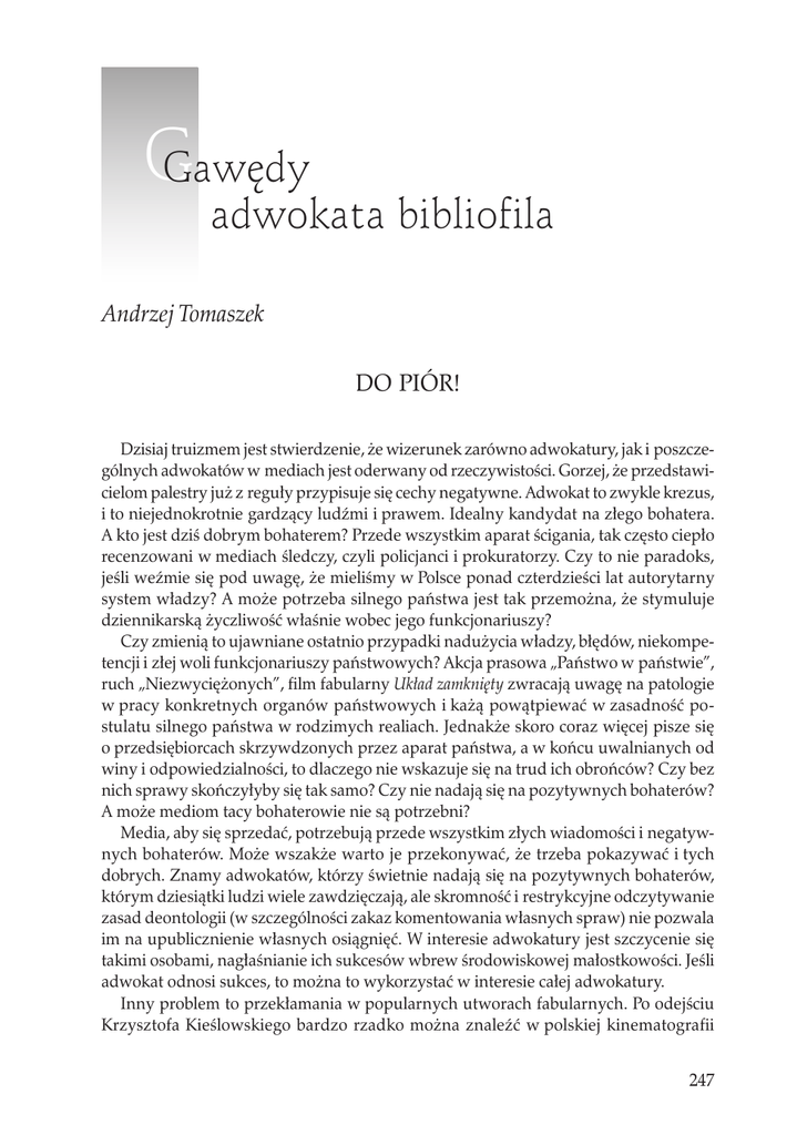 GGawędy adwokata bibliofila Andrzej Tomaszek Do piór! Dzisiaj truizmem jest stwierdzenie, że wizerunek zarówno adwokatury, jak i poszczególnych adwokatów w mediach jest oderwany od rzeczywistości. Gorzej, że przedstawicielom palestry już z reguły przypisuje się cechy negatywne. Adwokat to zwykle krezus, i to niejednokrotnie gardzący ludźmi i prawem. Idealny kandydat na złego bohatera. A kto jest dziś dobrym bohaterem? Przede wszystkim aparat ścigania, tak często ciepło recenzowani w mediach śledczy, czyli policjanci i prokuratorzy. Czy to nie paradoks, jeśli weźmie się pod uwagę, że mieliśmy w Polsce ponad czterdzieści lat autorytarny system władzy? A może potrzeba silnego państwa jest tak przemożna, że stymuluje dziennikarską życzliwość właśnie wobec jego funkcjonariuszy? Czy zmienią to ujawniane ostatnio przypadki nadużycia władzy, błędów, niekompetencji i złej woli funkcjonariuszy państwowych? Akcja prasowa „Państwo w państwie”, ruch „Niezwyciężonych”, film fabularny Układ zamknięty zwracają uwagę na patologie w pracy konkretnych organów państwowych i każą powątpiewać w zasadność postulatu silnego państwa w rodzimych realiach. Jednakże skoro coraz więcej pisze się o przedsiębiorcach skrzywdzonych przez aparat państwa, a w końcu uwalnianych od winy i odpowiedzialności, to dlaczego nie wskazuje się na trud ich obrońców? Czy bez nich sprawy skończyłyby się tak samo? Czy nie nadają się na pozytywnych bohaterów? A może mediom tacy bohaterowie nie są potrzebni? Media, aby się sprzedać, potrzebują przede wszystkim złych wiadomości i negatywnych bohaterów. Może wszakże warto je przekonywać, że trzeba pokazywać i tych dobrych. Znamy adwokatów, którzy świetnie nadają się na pozytywnych bohaterów, którym dziesiątki ludzi wiele zawdzięczają, ale skromność i restrykcyjne odczytywanie zasad deontologii (w szczególności zakaz komentowania własnych spraw) nie pozwala im na upublicznienie własnych osiągnięć. W interesie adwokatury jest szczycenie się takimi osobami, nagłaśnianie ich sukcesów wbrew środowiskowej małostkowości. Jeśli adwokat odnosi sukces, to można to wykorzystać w interesie całej adwokatury. Inny problem to przekłamania w popularnych utworach fabularnych. Po odejściu Krzysztofa Kieślowskiego bardzo rzadko można znaleźć w polskiej kinematografii 247 Andrzej Tomaszek PALESTRA i w telewizyjnych produkcjach fabularnych rzetelne odzwierciedlenie realiów sądowych. Producenci skąpią pieniędzy na prawnicze konsultacje, a scenarzyści wyobrażają sobie sąd, którego tak naprawdę nie znają. I w rezultacie wymyśleni przez nich bohaterowie zachowują się zupełnie inaczej, niż to w rzeczywistości jest możliwe: sędziowie wygłaszają do stron teatralne monologi, a adwokaci zachowują się jak amerykańscy koledzy – np. chodzą w trakcie rozprawy po sali czy zgłaszają sprzeciwy. A widz buduje sobie wyobrażenie na błędnej podstawie… W rodzimej literaturze wciąż brakuje „zwierciadeł chodzących po drodze” polskiej palestry. Adwokaci poza felietonistyką nie piszą, a o adwokaturze nie piszą inni. Więcej dziś możemy poczytać o adwokatach niemieckich niż polskich. Po świetnym zbiorze opowiadań pt. Przestępstwo i słabszym pt. Wina Ferdinand von Schirach proponuje mikropowieść Sprawa Colliniego, gdzie mamy i realia sądowe, i obrończe dylematy. Chociaż polski przekład, dokonany zapewne bez prawnoporównawczej konsultacji, obniża walory utworu, warto po niego sięgnąć, choćby dlatego, że to dobra lektura na wakacyjną podróż. W tej sytuacji naturalny wydaje się postulat: Adwokaci, do piór! Skoro nie piszą o nas, to piszmy sami o sobie! Jest wszakże tyle interesujących tematów. Nawet nasze codzienne życie zawodowe przynosi warte opisania kwestie. A może trzeba ogłosić konkurs na najciekawsze opowiadanie lub scenariusz filmowy z adwokackimi bohaterami? Warto zachęcać adwokatów do własnej twórczości w każdej formie – pamiętników, reportaży, opowiadań, nie tylko powieści. Dla zachęty pozwolę sobie zaproponować dalej własne, oparte na autentycznych faktach mikroopowiadanie, stylem narracji nawiązujące do von Schiracha. Do tytułu nie jestem przywiązany, możemy przyjąć roboczo: Przypowieść o sądzie w B. Nie mam literackich ambicji, gdyż te odrzuciłem dawno temu, decydując się na karierę adwokacką, ale jeszcze parę pomysłów by się w szufladzie znalazło… Krótka przypowieść o sądzie w B. (ku pokrzepieniu adwokackich serc) Czas i miejsce akcji: kwiecień 2013, Polska Czwartek – 11 kwietnia: Rano Producent przysłał w tej sprawie cztery maile z obszernymi załącznikami, a po południu Prawnik Wewnętrzny i Dyrektor Odpowiedzialny za Produkt telefonowali jeszcze po dwa razy. Adwokat rozumiał ich niepokój. Nowy produkt nie spodobał się innym producentom z tej branży. Konkurent z miasta B. oświadczył dziennikarzom, że oznaczenia na opakowaniu wprowadzają konsumentów w błąd i za ten czyn nieuczciwej konkurencji pozwie Producenta do sądu. W lokalnym dodatku do ogólnopolskiej gazety ukazał się opisujący jego zarzuty artykuł wraz z cytatem jego oświadczenia, że jeszcze w tym tygodniu złoży w sądzie przygotowany przez prawników wniosek o zabezpieczenie roszczenia poprzez wydanie zakazu wprowadzenia produktu do obrotu w spornym opakowaniu. Producent przekazał Adwokatowi listę argumentów i dowodów uzasadniających, że 248 5–6/2013 Do piór! tak oznaczone opakowanie nie wprowadza nikogo w błąd, a on nie narusza prawa. Poprosił o niezwłoczne przygotowanie odpowiedzi na wniosek o zabezpieczenie roszczenia. Przed północą pierwszy projekt odpowiedzi był gotowy. Piątek – 12 kwietnia: Projekt się spodobał, Producent nie zaproponował wielu poprawek. Adwokat wytłumaczył Producentowi, że odpowiedź można złożyć dopiero po wpłynięciu wniosku i