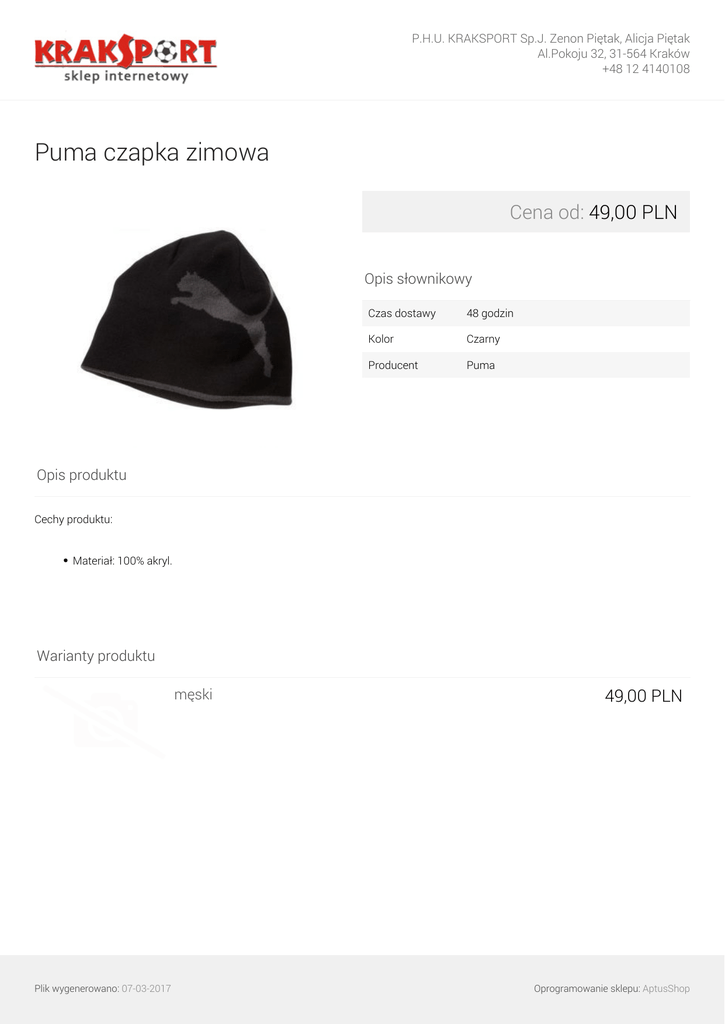 P.H.U. KRAKSPORT Sp.J. Zenon Piętak, Alicja Piętak Al.Pokoju 32, 31-564 Kraków +48 12 4140108 Puma czapka zimowa Cena od: 49,00 PLN Opis słownikowy Czas dostawy 48 godzin Kolor Czarny Producent Puma Opis produktu Cechy produktu: Materiał: 100% akryl. Warianty produktu męski Plik wygenerowano: 07-03-2017 Powered by TCPDF (www.tcpdf.org) 49,00 PLN Oprogramowanie sklepu: AptusShop