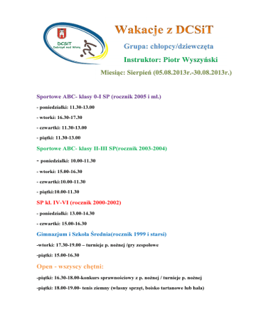Grupa: chłopcy/dziewczęta Instruktor: Piotr Wyszyński Miesiąc: Sierpień (05.08.2013r.-30.08.2013r.) Sportowe ABC- klasy 0-I SP (rocznik 2005 i mł.) - poniedziałki: 11.30-13.00 - wtorki: 16.30-17.30 - czwartki: 11.30-13.00 - piątki: 11.30-13.00 Sportowe ABC- klasy II-III SP(rocznik 2003-2004) - poniedziałki: 10.00-11.30 - wtorki: 15.00-16.30 - czwartki:10.00-11.30 - piątki:10.00-11.30 SP kl. IV-VI (rocznik 2000-2002) - poniedziałki: 13.00-14.30 - czwartki: 15.00-16.30 Gimnazjum i Szkoła Średnia(rocznik 1999 i starsi) -wtorki: 17.30-19.00 – turnieje p. nożnej /gry zespołowe -piątki: 15.00-16.30 Open - wszyscy chętni: -piątki: 16.30-18.00-konkurs sprawnościowy z p. nożnej / turnieje p. nożnej -piątki: 18.00-19.00- tenis ziemny (własny sprzęt, boisko tartanowe lub hala)