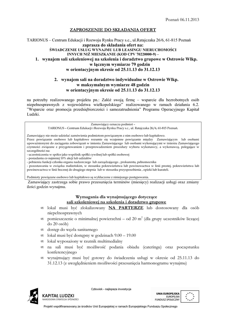 Poznań 06.11.2013 ZAPROSZENIE DO SKŁADANIA OFERT TARIONUS – Centrum Edukacji i Rozwoju Rynku Pracy s.c., ul.Ratajczaka 26/6, 61-815 Poznań zaprasza do składania ofert na: ŚWIADCZENIE USŁUG WYNAJMU LUB LEASINGU NIERUCHOMOŚCI INNYCH NIś MIESZKANIE (KOD CPV 70220000-9) – 1. wynajem sali szkoleniowej na szkolenia i doradztwo grupowe w Ostrowie Wlkp. w łącznym wymiarze 79 godzin w orientacyjnym okresie od 25.11.13 do 31.12.13 2. wynajem sali na doradztwo indywidualne w Ostrowie Wlkp. w maksymalnym wymiarze 48 godzin w orientacyjnym okresie od 25.11.13 do 31.12.13 na potrzeby realizowanego projektu pn.: ZałóŜ swoją firmę – wsparcie dla bezrobotnych osób niepełnosprawnych z województwa wielkopolskiego” realizowanego w ramach działania 6.2. ”Wsparcie oraz promocja przedsiębiorczości i samozatrudnienia” Programu Operacyjnego Kapitał Ludzki. Zamawiający oznacza podmiot – TARIONUS – Centrum Edukacji i Rozwoju Rynku Pracy s.c., ul. Ratajczaka 26/6, 61-815 Poznań. Zamawiający nie moŜe udzielać zamówienia podmiotom powiązanym z nim osobowo lub kapitałowo. Przez powiązanie osobowe lub kapitałowe rozumie się wzajemne powiązanie między Zamawiającym lub osobami upowaŜnionymi do zaciągania zobowiązań w imieniu Zamawiającego lub osobami wykonującymi w imieniu Zamawiającego czynności związane z przygotowaniem i przeprowadzeniem procedury wyboru wykonawcy, a wykonawcą, polegające w szczególności na: - uczestniczeniu w spółce jako wspólnik spółki cywilnej lub spółki osobowej - posiadaniu co najmniej 10% akcji lub udziałów - pełnieniu funkcji członka organu nadzorczego lub zarządzającego , prokurenta, pełnomocnika - pozostawaniu w związku małŜeńskim, w stosunku pokrewieństwa lub powinowactwa w linii prostej, pokrewieństwa lub powinowactwa w linii bocznej do drugiego stopnia lub w stosunku przysposobienia , opieki lub kurateli. Podmioty powiązane osobowo lub kapitałowo są wykluczone z niniejszego postępowania. Zamawiający zastrzega sobie prawo przesunięcia terminów (miesięcy) realizacji usługi oraz zmiany ilości godzin wynajmu. • • • • • • • Wymagania dla wynajmującego dotyczące sali szkoleniowej na szkolenia i doradztwo grupowe lokal musi być zlokalizowany NA PARTERZE lub dostosowany dla osób niepełnosprawnych pomieszczenie o minimalnej powierzchni – od 20 m2 (dla grupy uczestników liczącej do 20 osób) dostęp do węzła sanitarnego lokal musi być dostępny w godzinach 9.00 – 19.00 lokal wyposaŜony w rzutnik multimedialny na sali musi być moŜliwość podania obiadu (cateringu) oraz poczęstunku konferencyjnego wynajmujący musi być gotowy do świadczenia usługi w okresie od 25.11.13 do 31.12.13 (z uwzględnieniem moŜliwości przesunięcia harmonogramu wynajmu) • • • • • Wymagania dla wynajmującego dotyczące sali doradztwo indywidualne lokal musi być zlokalizowany NA PARTERZE lub dostosowany dla osób niepełnosprawnych pomieszczenie o powierzchni umoŜliwiającej przeprowadzenie doradztwa indywidualnego – miejsce dla 2-3 osób dostęp do węzła sanitarnego lokal musi być dostępny w godzinach 9.00 – 19.00 wynajmujący musi być gotowy do świadczenia usługi wynajmujący musi być gotowy do świadczenia usługi w okresie od 25.11.13 do 31.12.13 (z uwzględnieniem moŜliwości przesunięcia harmonogramu wynajmu) ZłoŜona oferta powinna zawierać : 1. nazwę oferenta 2. dokładny adres lokalizacji wynajmowanego lokalu 3. powierzchnię sali szkoleniowej na szkolenia oraz na doradztwo grupowe 4. powierzchnię sali na doradztwo indywidualne 5. cenę brutto za godzinę wynajmu danej sali 6. oświadczenie o braku powiązań – według załącznika nr 1 do zapytania ofertowego Dopuszcza się składanie ofert częściowych. Tylko oferty zawierające wszystkie ww. informacje będą podlegały ocenie. Oferty naleŜy składać w terminie do 22.11.2013, godzina 15.00 na adres: poczty elektronicznej : [email protected] lub adres siedziby:TARIONUS – Centrum Edukacji i Rozwoju Rynku Pracy s.c., ul. Ratajczaka 26/6, 61815 Poznań. Wybór najkorzystniejszej oferty nastąpi w oparciu o następujące kryterium – cena – waga 100 %. Punkty przyznawane za podane kryterium będą liczone wg. następującego wzoru: liczba punktów = (Cmin/Cof) x 100 x waga ; gdzie: Cmin oznacza najniŜszą cenę spośród wszystkich ofert, Cof oznacza cenę podaną w ofercie. OŚWIADCZENIE O BRAKU POWIĄZAŃ – załącznik nr 1 do zapytania ofertowego Oświadczam, Ŝe pomiędzy: TARIONUS – Centrum Edukacji i Rozwoju Rynku Pracy s.c. ul. Ratajczaka 26/6, 61-815 Poznań. a ……………………………………………………………………………………………… nazwa podmiotu, do którego jest składane zapytanie, adres nie występują powiązania osobowe lub kapitałowe rozumiane jako wzajemne powiązanie między Zamawiającym lub osobami upowaŜnionymi do zaciągania zobowiązań w imieniu Zamawiającego lub osobami wykonującymi w imieniu Zamawiającego czynności związane z przygotowaniem i przeprowadzeniem procedury wyboru wykonawcy, a wykonawcą, polegające w szczególności na: - uczestniczeniu w spółce jako wspólnik spółki cywilnej lub spółki osobowej - posiadaniu co najmniej 10% akcji lub udziałów - pełnieniu funkcji członka organu nadzorczego lub zarządzającego, prokurenta, pełnomocnika - pozostawaniu w związku małŜeńskim, w stosunku pokrewieństwa lub powinowactwa w linii prostej, pokrewieństwa lub powinowactwa w linii bocznej do drugiego stopnia lub w stosunku przysposobienia , opieki lub kurateli ………………………………………………….. Podpis ………………………………………………….. data, miejscowość