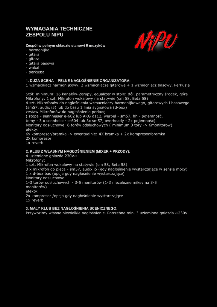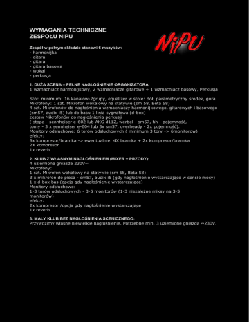 WYMAGANIA TECHNICZNE ZESPOŁU NIPU Zespół w pełnym składzie stanowi 6 muzyków: - harmonijka - gitara - gitara - gitara basowa - wokal - perkusja 1. DUŻA SCENA – PEŁNE NAGŁOŚNIENIE ORGANIZATORA: 1 wzmacniacz harmonijkowy, 2 wzmacniacze gitarowe + 1 wzmacniacz basowy, Perkusja Stół: minimum: 16 kanałów-2grupy, equalizer w stole: dół, parametryczny środek, góra Mikrofony: 1 szt. Mikrofon wokalowy na statywie (sm 58, Beta 58) 4 szt. Mikrofonów do nagłośnienia wzmacniaczy harmonijkowego, gitarowych i basowego (sm57, audix i5) lub do basu 1 linia sygnałowa (d-box) zestaw Mikrofonów do nagłośnienia perkusji ( stopa - sennheiser e-602 lub AKG d112, werbel - sm57, hh - pojemność, tomy - 3 x sennheiser e-604 lub 3x sm57, overheady - 2x pojemność). Monitory odsłuchowe: 6 torów odsłuchowych ( minimum 3 tory -> 6monitorow) efekty: 6x kompresor/bramka -> ewentualnie: 4X bramka + 2x kompresor/bramka 2X kompresor 1x reverb 2. KLUB Z WŁASNYM NAGŁOŚNIENIEM (MIXER + PRZODY): 4 uziemione gniazda 230V~ Mikrofony: 1 szt. Mikrofon wokalowy na statywie (sm 58, Beta 58) 3 x mikrofon do pieca - sm57, audix i5 (gdy nagłośnienie wystarczające w sensie mocy) 1 x d-box bas (opcja gdy nagłośnienie wystarczające) Monitory odsłuchowe: 1-3 torów odsłuchowych - 3-5 monitorów (1-3 niezależne miksy na 3-5 monitorów) efekty: 2x kompresor /opcja gdy nagłośnienie wystarczające 1x reverb 3. MAŁY KLUB BEZ NAGŁOŚNIENIA SCENICZNEGO: Przywozimy własne niewielkie nagłośnienie. Potrzebne min. 3 uziemione gniazda ~230V.