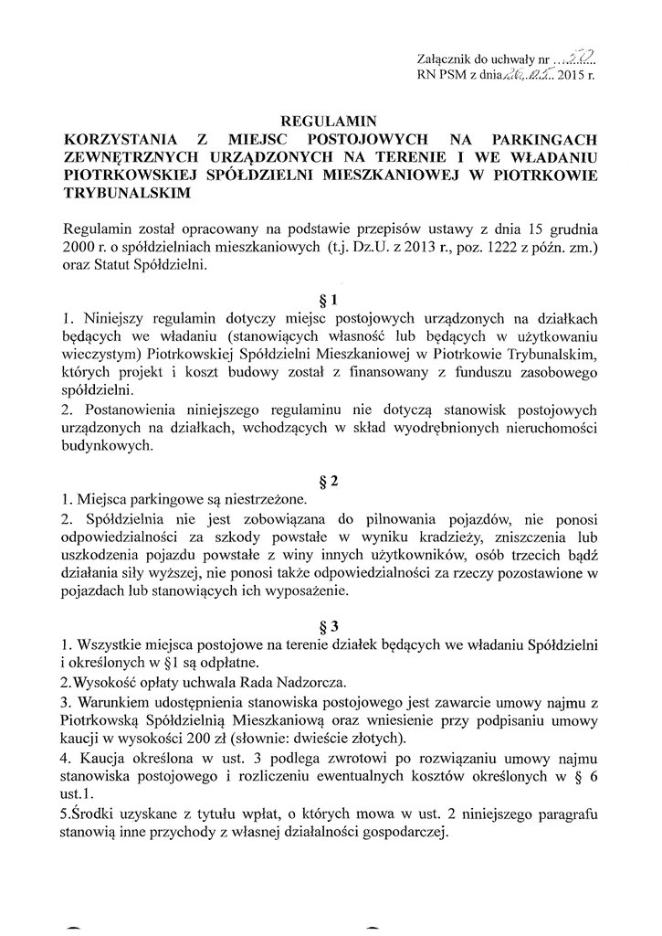 Załącznik do uchwały nr . . ; 2 .(2 .. R N PSM z dnia Ar f e . 2015 r. REGULAMIN KORZYSTANIA Z MIEJSC POSTOJOWYCH NA PARKINGACH ZEWNĘTRZNYCH URZĄDZONYCH NA TERENIE I WE WŁADANIU PIOTRKOWSKIEJ SPÓŁDZIELNI MIESZKANIOWEJ W PIOTRKOWIE TRYBUNALSKIM Regulamin został opracowany na podstawie przepisów ustawy z dnia 15 grudnia 2000 r. o spółdzielniach mieszkaniowych (t.j. Dz.U. z 2013 r., poz. 1222 z późn. zm.) oraz Statut Spółdzielni. §1 1. Niniejszy regulamin dotyczy miejsc postojowych urządzonych na działkach będących we władaniu (stanowiących własność lub będących w użytkowaniu wieczystym) Piotrkowskiej Spółdzielni Mieszkaniowej w Piotrkowie Trybunalskim, których projekt i koszt budowy został z finansowany z funduszu zasobowego spółdzielni. 2. Postanowienia niniejszego regulaminu nie dotyczą stanowisk postojowych urządzonych na działkach, wchodzących w skład wyodrębnionych nieruchomości budynkowych. §2 1. Miejsca parkingowe są niestrzeżone. 2. Spółdzielnia nie jest zobowiązana do pilnowania pojazdów, nie ponosi odpowiedzialności za szkody powstałe w wyniku kradzieży, zniszczenia lub uszkodzenia pojazdu powstałe z winy innych użytkowników, osób trzecich bądź działania siły wyższej, nie ponosi także odpowiedzialności za rzeczy pozostawione w pojazdach lub stanowiących ich wyposażenie. §3 1. Wszystkie miejsca postojowe na terenie działek będących we władaniu Spółdzielni i określonych w § 1 są odpłatne. 2. Wysokość opłaty uchwala Rada Nadzorcza. 3. Warunkiem udostępnienia stanowiska postojowego jest zawarcie umowy najmu z Piotrkowską Spółdzielnią Mieszkaniową oraz wniesienie przy podpisaniu umowy kaucji w wysokości 200 zł (słownie: dwieście złotych). 4. Kaucja określona w ust. 3 podlega zwrotowi po rozwiązaniu umowy najmu stanowiska postojowego i rozliczeniu ewentualnych kosztów określonych w § 6 ust. 1. 5.Środki uzyskane z tytułu wpłat, o których mowa w ust. 2 niniejszego paragrafu stanowią inne przychody z własnej działalności gospodarczej. 1. Wszystkie miejsca postojowe na terenie działek we władaniu Spółdzielni są dostępne w pierwszej kolejności dla członków Spółdzielni. 2. Osoba nie będąca członkiem Spółdzielni może uzyskać dostęp jedynie w sytuacji, gdy członkowie Spółdzielni nie będą tym zainteresowani. 3. Kryterium przydzielenia miejsc ustala się według kolejności złożenia podań. 4. Korzystanie z miejsca postojowego możliwe jest jedynie po podpisaniu umowy najmu oraz wniesieniu kaucji o której mowa w § 3 ust. 3. §5 1. Wolne miejsca parkingowe Zarząd może wynajmować innym osobom do krótkotrwałego, liczonego według stawki godzinowej lub dobowej użytkowania, nie przekraczającego okresu 7 dób. 2. Do sytuacji określonych w ust. 1 nie stosuje się kaucji o której mowa w § 3 ust.3. §6 1. Każdy użytkownik miejsca postojowego zobowiązany jest do pokrycia opłat wynikających z umowy, oraz ewentualnych kosztów wynikających z niewłaściwego użytkowania stanowiska postojowego. 2. Utrzymanie czystości na wynajętym miejscu należy do użytkownika. §7 1. Miejsca postojowe przeznaczone są dla samochodów osobowych i przyczep lekkich mieszczących się w gabarytach stanowiska. 2. Na jednym miejscu postojowym mogą parkować dwa pojazdy jednośladowe. §8 Na terenie parkingu zabronione jest: 1. parkowanie pojazdów poza miejscami do tego wyznaczonymi, 2. dokonywanie napraw pojazdów, 3. mycie pojazdów, 4. tankowanie pojazdów, 5. parkowanie pojazdów z nieszczelnymi układami powodującymi wycieki, 6. zachowanie lub działanie sprzeczne z zasadami współżycia społecznego lub zakłócające innym korzystanie z parkingu. § 9 Użytkownicy miejsc postojowych są zobowiązani do przestrzegania przepisów prawa o ruchu drogowym oraz stosowania się do organizacji ruchu drogowego ustalonego na terenie parkingu, zarówno w trakcie postoju jak i ruchu pojazdów. 1. W przypadku naruszenia przez użytkownika miejsca postojowego postanowień niniejszego Regulaminu, Spółdzielnia może rozwiązać umowę najmu miejsca postojowego w trybie natychmiastowym bez zachowania okresu wypowiedzenia oraz zastosować środki niezbędne dla przywrócenia stanu zgodnego z postanowieniami Regulaminu, w tym również może usunąć pojazd z parkingu na koszt najemcy. 2. Użytkownik miejsca postojowego ponosi odpowiedzialność za wszelkie szkody spowodowane przez pojazd lub powstałe w związku z korzystaniem z parkingu, w szczególności z tytułu zanieczyszczenia powierzchni parkingu na skutek wycieku płynów z pojazdu (wyciek oleju, płynu hamulcowego, płynu chłodniczego itp.). §11 Nadzór nad prawidłowym korzystaniem przez jego użytkowników, dbałość o utrzymanie parkingu w należytym stanie i czystości (a w okresie zimowym dróg dojazdowych) powierza się Administracji Osiedla.. §12 Regulamin wchodzi w życie z dniem zatwierdzenia przez Radę Nadzorczą. Sekretarz Rady Nadzorczej: Przewodniczący Rady Nadzorczej: ł ć Y /.-' Ewa Cieciura M arelcFotrzebo wsk i /