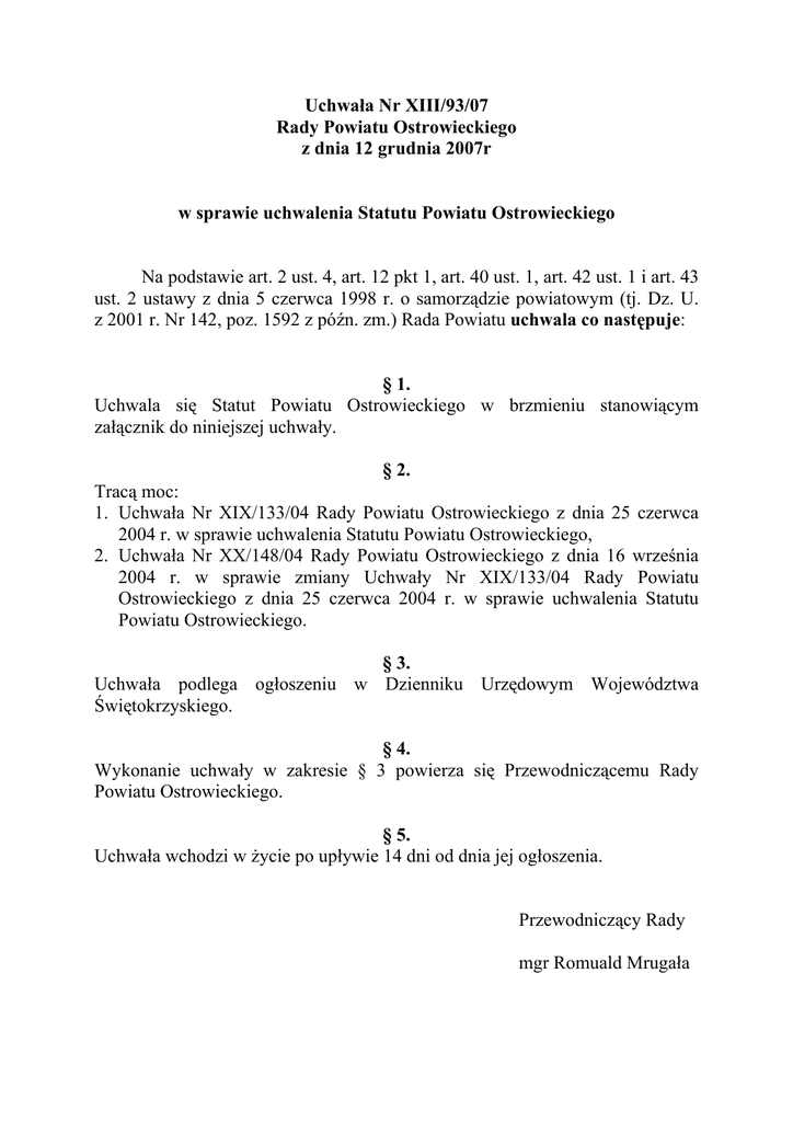 Uchwała Nr XIII/93/07 Rady Powiatu Ostrowieckiego z dnia 12 grudnia 2007r w sprawie uchwalenia Statutu Powiatu Ostrowieckiego Na podstawie art. 2 ust. 4, art. 12 pkt 1, art. 40 ust. 1, art. 42 ust. 1 i art. 43 ust. 2 ustawy z dnia 5 czerwca 1998 r. o samorządzie powiatowym (tj. Dz. U. z 2001 r. Nr 142, poz. 1592 z późn. zm.) Rada Powiatu uchwala co następuje: § 1. Uchwala się Statut Powiatu Ostrowieckiego w brzmieniu stanowiącym załącznik do niniejszej uchwały. § 2. Tracą moc: 1. Uchwała Nr XIX/133/04 Rady Powiatu Ostrowieckiego z dnia 25 czerwca 2004 r. w sprawie uchwalenia Statutu Powiatu Ostrowieckiego, 2. Uchwała Nr XX/148/04 Rady Powiatu Ostrowieckiego z dnia 16 września 2004 r. w sprawie zmiany Uchwały Nr XIX/133/04 Rady Powiatu Ostrowieckiego z dnia 25 czerwca 2004 r. w sprawie uchwalenia Statutu Powiatu Ostrowieckiego. § 3. Uchwała podlega ogłoszeniu w Dzienniku Urzędowym Województwa Świętokrzyskiego. § 4. Wykonanie uchwały w zakresie § 3 powierza się Przewodniczącemu Rady Powiatu Ostrowieckiego. § 5. Uchwała wchodzi w życie po upływie 14 dni od dnia jej ogłoszenia. Przewodniczący Rady mgr Romuald Mrugała