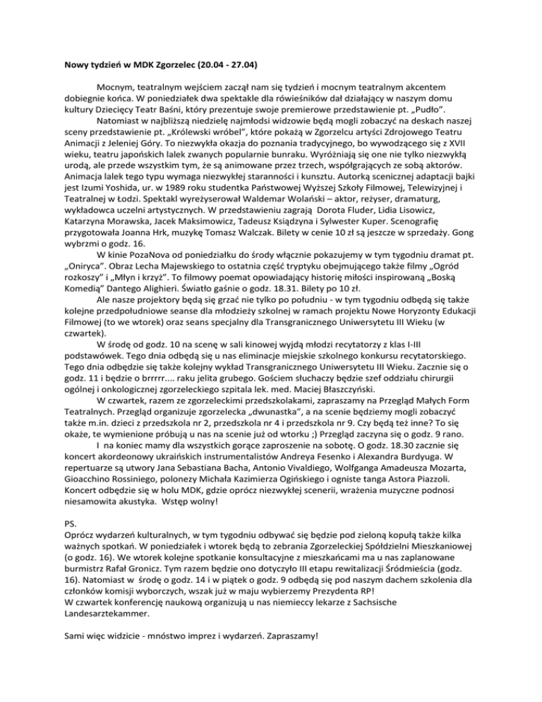 Nowy tydzień w MDK Zgorzelec (20.04 - 27.04) Mocnym, teatralnym wejściem zaczął nam się tydzień i mocnym teatralnym akcentem dobiegnie końca. W poniedziałek dwa spektakle dla rówieśników dał działający w naszym domu kultury Dziecięcy Teatr Baśni, który prezentuje swoje premierowe przedstawienie pt. „Pudło”. Natomiast w najbliższą niedzielę najmłodsi widzowie będą mogli zobaczyć na deskach naszej sceny przedstawienie pt. „Królewski wróbel”, które pokażą w Zgorzelcu artyści Zdrojowego Teatru Animacji z Jeleniej Góry. To niezwykła okazja do poznania tradycyjnego, bo wywodzącego się z XVII wieku, teatru japońskich lalek zwanych popularnie bunraku. Wyróżniają się one nie tylko niezwykłą urodą, ale przede wszystkim tym, że są animowane przez trzech, współgrających ze sobą aktorów. Animacja lalek tego typu wymaga niezwykłej staranności i kunsztu. Autorką scenicznej adaptacji bajki jest Izumi Yoshida, ur. w 1989 roku studentka Państwowej Wyższej Szkoły Filmowej, Telewizyjnej i Teatralnej w Łodzi. Spektakl wyreżyserował Waldemar Wolański – aktor, reżyser, dramaturg, wykładowca uczelni artystycznych. W przedstawieniu zagrają Dorota Fluder, Lidia Lisowicz, Katarzyna Morawska, Jacek Maksimowicz, Tadeusz Ksiądzyna i Sylwester Kuper. Scenografię przygotowała Joanna Hrk, muzykę Tomasz Walczak. Bilety w cenie 10 zł są jeszcze w sprzedaży. Gong wybrzmi o godz. 16. W kinie PozaNova od poniedziałku do środy włącznie pokazujemy w tym tygodniu dramat pt. „Oniryca”. Obraz Lecha Majewskiego to ostatnia część tryptyku obejmującego także filmy „Ogród rozkoszy” i „Młyn i krzyż”. To filmowy poemat opowiadający historię miłości inspirowaną „Boską Komedią” Dantego Alighieri. Światło gaśnie o godz. 18.31. Bilety po 10 zł. Ale nasze projektory będą się grzać nie tylko po południu - w tym tygodniu odbędą się także kolejne przedpołudniowe seanse dla młodzieży szkolnej w ramach projektu Nowe Horyzonty Edukacji Filmowej (to we wtorek) oraz seans specjalny dla Transgranicznego Uniwersytetu III Wieku (w czwartek). W środę od godz. 10 na scenę w sali kinowej wyjdą młodzi recytatorzy z klas I-III podstawówek. Tego dnia odbędą się u nas eliminacje miejskie szkolnego konkursu recytatorskiego. Tego dnia odbędzie się także kolejny wykład Transgranicznego Uniwersytetu III Wieku. Zacznie się o godz. 11 i będzie o brrrrr.... raku jelita grubego. Gościem słuchaczy będzie szef oddziału chirurgii ogólnej i onkologicznej zgorzeleckiego szpitala lek. med. Maciej Błaszczyński. W czwartek, razem ze zgorzeleckimi przedszkolakami, zapraszamy na Przegląd Małych Form Teatralnych. Przegląd organizuje zgorzelecka „dwunastka”, a na scenie będziemy mogli zobaczyć także m.in. dzieci z przedszkola nr 2, przedszkola nr 4 i przedszkola nr 9. Czy będą też inne? To się okaże, te wymienione próbują u nas na scenie już od wtorku ;) Przegląd zaczyna się o godz. 9 rano. I na koniec mamy dla wszystkich gorące zaproszenie na sobotę. O godz. 18.30 zacznie się koncert akordeonowy ukraińskich instrumentalistów Andreya Fesenko i Alexandra Burdyuga. W repertuarze są utwory Jana Sebastiana Bacha, Antonio Vivaldiego, Wolfganga Amadeusza Mozarta, Gioacchino Rossiniego, polonezy Michała Kazimierza Ogińskiego i ogniste tanga Astora Piazzoli. Koncert odbędzie się w holu MDK, gdzie oprócz niezwykłej scenerii, wrażenia muzyczne podnosi niesamowita akustyka. Wstęp wolny! PS. Oprócz wydarzeń kulturalnych, w tym tygodniu odbywać się będzie pod zieloną kopułą także kilka ważnych spotkań. W poniedziałek i wtorek będą to zebrania Zgorzeleckiej Spółdzielni Mieszkaniowej (o godz. 16). We wtorek kolejne spotkanie konsultacyjne z mieszkańcami ma u nas zaplanowane burmistrz Rafał Gronicz. Tym razem będzie ono dotyczyło III etapu rewitalizacji Śródmieścia (godz. 16). Natomiast w środę o godz. 14 i w piątek o godz. 9 odbędą się pod naszym dachem szkolenia dla członków komisji wyborczych, wszak już w maju wybierzemy Prezydenta RP! W czwartek konferencję naukową organizują u nas niemieccy lekarze z Sachsische Landesarztekammer. Sami więc widzicie - mnóstwo imprez i wydarzeń. Zapraszamy!