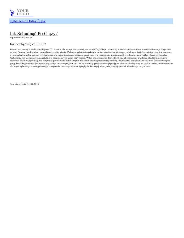 Ogłoszenia Dolny Śląsk Jak Schudnąć Po Ciąży? http://www.osytalia.pl Jak pozbyć się cellulitu? Wielu z nas marzy o atrakcyjnej figurze. To właśnie dla nich przeznaczony jest serwis Osytalia.pl. Na naszej stronie zaprezentowane zostały informacje dotyczące sportu i fitnessu, a także diet i prawidłowego odżywiania. Z dostępnych tutaj artykułów można dowiedzieć się na przykład tego, jakie korzyści przynosi uprawianie wybranych dyscyplin sportowych. Jednocześnie przedstawiamy ćwiczenia pomagające w osiągnięciu upragnionych rezultatów, na przykład płaskiego brzucha. Zachęcamy również do czytania artykułów poruszających temat odżywiania. W ten sposób można dowiedzieć się, jak skutecznie zwalczyć zbędne kilogramy i zachować szczupłą sylwetkę, nie ryzykując problemami zdrowotnymi. Prezentujemy najpopularniejsze diety, na przykład dietę Dukana czy dietę dostosowaną do grupy krwi. Sugerujemy, jak uporać się ze zbyt dużym apetytem oraz które produkty pozytywnie wpływają na zdrowie. Zachęcamy wszystkie osoby zainteresowane zdrowym trybem życia do regularnego korzystania z naszego serwisu i pogłębiania swojej wiedzy dotyczącej sportu i właściwego odżywiania. Date utworzenia: 31-01-2015