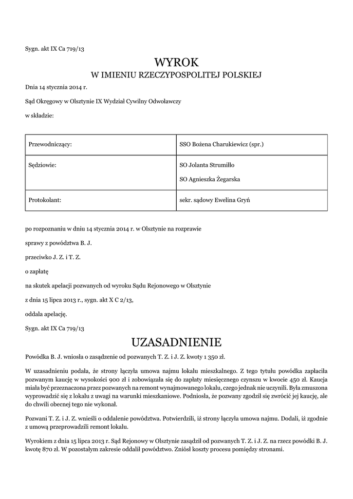 Sygn. akt IX Ca 719/13 WYROK W IMIENIU RZECZYPOSPOLITEJ POLSKIEJ Dnia 14 stycznia 2014 r. Sąd Okręgowy w Olsztynie IX Wydział Cywilny Odwoławczy w składzie: Przewodniczący: SSO Bożena Charukiewicz (spr.) Sędziowie: SO Jolanta Strumiłło SO Agnieszka Żegarska Protokolant: sekr. sądowy Ewelina Gryń po rozpoznaniu w dniu 14 stycznia 2014 r. w Olsztynie na rozprawie sprawy z powództwa B. J. przeciwko J. Z. i T. Z. o zapłatę na skutek apelacji pozwanych od wyroku Sądu Rejonowego w Olsztynie z dnia 15 lipca 2013 r., sygn. akt X C 2/13, oddala apelację. Sygn. akt IX Ca 719/13 UZASADNIENIE Powódka B. J. wniosła o zasądzenie od pozwanych T. Z. i J. Z. kwoty 1 350 zł. W uzasadnieniu podała, że strony łączyła umowa najmu lokalu mieszkalnego. Z tego tytułu powódka zapłaciła pozwanym kaucję w wysokości 900 zł i zobowiązała się do zapłaty miesięcznego czynszu w kwocie 450 zł. Kaucja miała być przeznaczona przez pozwanych na remont wynajmowanego lokalu, czego jednak nie uczynili. Była zmuszona wyprowadzić się z lokalu z uwagi na warunki mieszkaniowe. Podniosła, że pozwany zgodził się zwrócić jej kaucję, ale do chwili obecnej tego nie wykonał. Pozwani T. Z. i J. Z. wnieśli o oddalenie powództwa. Potwierdzili, iż strony łączyła umowa najmu. Dodali, iż zgodnie z umową przeprowadzili remont lokalu. Wyrokiem z dnia 15 lipca 2013 r. Sąd Rejonowy w Olsztynie zasądził od pozwanych T. Z. i J. Z. na rzecz powódki B. J. kwotę 870 zł. W pozostałym zakresie oddalił powództwo. Zniósł koszty procesu pomiędzy stronami. Sąd Rejonowy ustalił, że lokal położony w (...) B stanowi własność J. i M. L. - rodziców pozwanej J. Z.. Od 22 lutego 1994 r. w lokalu zameldowana jest J. L., natomiast zarządzają tym lokalem pozwani. W dniu 17 czerwca 2012 r. pozwani zawarli z B. J. umowę najmu lokalu położonego w (...), umowa ta na piśmie nazwana została umową użyczenia. W myśl § 3 umowy została zawarta na czas oznaczony do dnia 17 czerwca 2013 r. Stosownie do § 5 ust. 2 umowy powódka zobowiązana była do ponoszenia opłat za energię elektryczną i gaz, opłat komunalnych oraz opłat za używanie telefonu. Ustnie natomiast strony uzgodniły miesięczny czynsz w wysokości 450 zł, powódka wpłaciła też kaucję w kwocie 900 zł. Po opuszczeniu przez powódkę wynajmowanego lokalu, pozwany w wysyłanych do niej wiadomościach tekstowych deklarował zamiar zwrotu kaucji w kwocie 870 zł. Jak wynika z dalszych ustaleń Sądu I instancji lokal w G. został wyremontowany przed wynajęciem go powódce. Wymalowano kuchnię, przedpokój i pokoje. W kuchni położone zostały na ścianie płytki, a także wymienione zostały uszkodzone płytki w pozostałych pomieszczeniach. Poprawiono elektrykę, ale kable z instalacji elektrycznej nie zostały przykryte tynkiem. Powódka wprowadziła się do lokalu w dniu 17 czerwca 2012 r. Z uwagi na uciążliwe warunki mieszkaniowe powódka wyprowadziła się z lokalu 10 sierpnia 2012 r. Pomieszczenia w lokalu były małe, przeciekały rury, za ścianą słychać było odgłosy zwierząt. Lokal był zimny. W pobliżu znajdowało się wysypisko śmieci, skąd przychodziły insekty i gryzonie. Powódka wpłaciła pozwanemu T. Z. kaucję w wysokości 900 zł. Czynsz najmu wynosił 450 zł. Pozwany chciał dobrowolnie zwrócić wpłaconą kaucję w wysokości 870 zł, po potrąceniu kwoty 30 zł za zużytą wodę, na co powódka wyraziła zgodę. W tak ustalonym stanie faktycznym Sąd Rejonowy uznał, że roszczenie powódki zasługiwało na uwzględnienie w części. Zdaniem Sądu zawarta przez strony umowa była w rzeczywistości umową najmu, a nie umową użyczenia. Z ustnych ustaleń stron wynikało bowiem, iż powódka miała zapłacić pozwanemu kaucję w wysokości dwukrotności miesięcznego czynszu. Wady lokalu przejawiające się między innymi w nieprzyjemnym zapachu w mieszkaniu, jedynie prowizorycznym zabezpieczeniem instalacji elektrycznej, występowaniem w lokalu gryzoni i owadów uprawniały powódkę do wypowiedzenia umowy najmu bez zachowania terminów wypowiedzenia. W konsekwencji wpłacona przez powódkę kaucja podlegała zwrotowi po potrąceniu nie opłaconych przez powódkę należności za wodę w kwocie 30 zł. Ponieważ powódka zajmowała przedmiotowy lokal przez 2 miesiące, to nie ma podstaw do zwrotu za ten okres kwoty stanowiącej równowartość czynszu. W tym zakresie powództwo podlegało oddaleniu. Powyższy wyrok zaskarżyli apelacją pozwani domagając się zmiany wyroku i oddalenia powództwa oraz zasądzenia od powódki kosztów procesu za obie instancje. Pozwani zarzucili wyrokowi błąd w ustaleniach faktycznych polegający na przyjęciu, że powódce należy się zwrot uiszczonej przez nią kaucji pomimo tego, iż powodowie przeprowadzili remont, do którego zobowiązali się zawierając umowę z dnia 17 czerwca 2012r. W odpowiedzi na apelację powódka wniosła o oddalenie apelacji wskazując w uzasadnieniu na trafność orzeczenia Sądu Rejonowego. Sąd Okręgowy zważył, co następuje: Apelacja nie jest zasadna. Wstępnie odnosząc się do zarzutów apelacji, w ocenie Sądu Okręgowego pozwani nie zakwestionowali skutecznie ustaleń faktycznych dokonanych przez Sąd Rejonowy, a ich zarzuty są chybione. Sąd Okręgowy dokonując we własnym zakresie oceny materiału dowodowego nie znalazł przyczyn i podstaw uzasadniających poczynienie ustaleń odmiennych, niż poczynione przez Sąd I instancji i w konsekwencji uznał je za własne. Bezsporną pozostaje okoliczność, iż strony łączyła umowa najmu. Strony były zgodne, iż zapłacona przez powódkę kwota 900 zł, stanowiąca dwukrotność miesięcznego czynszu, stanowiła kaucję. Odwołując się do treści art. 6. ust 1. ustawy z dnia 21 czerwca 2001 r. o ochronie praw lokatorów, mieszkaniowym zasobie gminy i o zmianie Kodeksu cywilnego ( j.t. Dz.U z 2005 r., Nr 31 poz. 266 ze zm. ) zawarcie umowy najmu moż
