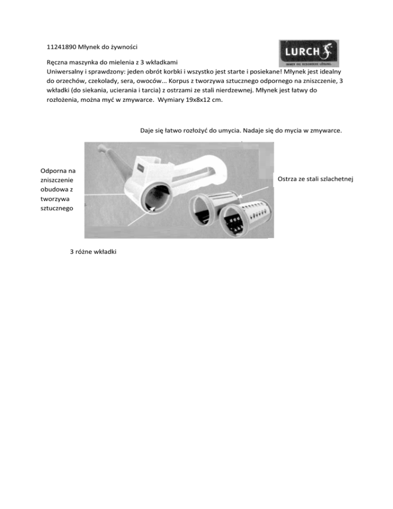 11241890 Młynek do żywności Ręczna maszynka do mielenia z 3 wkładkami Uniwersalny i sprawdzony: jeden obrót korbki i wszystko jest starte i posiekane! Młynek jest idealny do orzechów, czekolady, sera, owoców... Korpus z tworzywa sztucznego odpornego na zniszczenie, 3 wkładki (do siekania, ucierania i tarcia) z ostrzami ze stali nierdzewnej. Młynek jest łatwy do rozłożenia, można myć w zmywarce. Wymiary 19x8x12 cm. Daje się łatwo rozłożyć do umycia. Nadaje się do mycia w zmywarce. Odporna na zniszczenie obudowa z tworzywa sztucznego 3 różne wkładki Ostrza ze stali szlachetnej