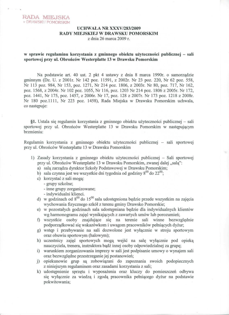RADA MIEJSKA v DRAWSKI; POMORSKIM UCHWAŁA NR XXXV/283/2009 RADY MIEJSKIEJ W DRAWSKU POMORSKIM z dnia 26 marca 2009 r. w sprawie regulaminu korzystania z gminnego obiektu użyteczności publicznej - sali sportowej przy ul. Obrońców Westerplatte 13 w Drawsku Pomorskim Na podstawie art. 40 ust. 2 pkt 4 ustawy z dnia 8 marca 1990r. o samorządzie gminnym (Dz. U. z 2001r. Nr 142 póz. 11591, z 2002r. Nr 23 póz. 220, Nr 62 póz. 558, Nr 113 póz. 984, Nr 153, póz. 1271, Nr 214 póz. 1806, z 2003r. Nr 80, póz. 717, Nr 162, póz. 1568, z 2004r. Nr 102 póz. 1055, Nr 116, póz. 1203 Nr 214 póz. 1806 z 2005r. Nr 172, póz. 1441, Nr 175, póz. 1457, z 2006r. Nr 17, póz. 128 z 2007r. Nr 173 póz. 1218 z 2008r. Nr 180 p o z . l l l l , Nr 223 póz. 1458), Rada Miejska w Drawsku Pomorskim uchwala, co następuje: §1. Ustala się regulamin korzystania z gminnego obiektu użyteczności publicznej - sali sportowej przy ul. Obrońców Westerplatte 13 w Drawsku Pomorskim w następującym brzmieniu: Regulamin korzystania z gminnego obiektu użyteczności publicznej przy ul. Obrońców Westerplatte 13 w Drawsku Pomorskim sali sportowej 1) Zasady korzystania z gminnego obiektu użyteczności publicznej - Sali sportowej przy ul. Obrońców Westerplatte 13 w Drawsku Pomorskim, zwanej dalej „salą": a) salą zarządza dyrektor Szkoły Podstawowej w Drawsku Pomorskim; b) sala czynna jest we wszystkie dni tygodnia od godziny 8 do 22 ; c) korzystać z sali mogą: - grupy szkolne; - inne grupy zorganizowane; - indywidualni klienci. nn nn d) w godzinach od 8 do 15 sala udostępniona będzie przede wszystkim na zajęcia wychowania fizycznego szkół z terenu gminy Drawsko Pomorskie; e) w pozostałych godzinach sala udostępniana będzie dla indywidualnych klientów wg harmonogramu zajęć wynikających z zawartych umów lub porozumień; f) wszystkie osoby znajdujące się na terenie sali winne bezwzględnie podporządkować się wskazówkom i uwagom pracowników pełniących dyżur; g) wstęp i przebywanie na sali dozwolone jest wyłącznie w stroju sportowym oraz obuwiu sportowym (halowym); h) uczestnicy zajęć sportowych mogą wejść na salę wyłącznie pod opieką nauczyciela, trenera, instruktora bądź innej osoby odpowiedzialnej za grupę; i) warunkiem zorganizowania imprezy w sali jest podpisanie umowy o wynajem sali oraz bezwzględne przestrzeganie jej postanowień; j) opiekunowie grup są zobowiązani do zapoznania swoich podopiecznych z niniejszym regulaminem oraz zasadami korzystania z sali; k) udostępnienie sprzętu i wyposażenia oraz kluczy do pomieszczeń odbywa się wyłącznie za wiedzą i zgodą pracownika pełniącego dyżur na podstawie pokwitowania; t\f\ nł\ 1) prowadzący zajęcia obowiązany jest sprawdzić stan techniczny sprzętu i wyposażenia przed przystąpieniem do zajęć; m) korzystający z sali ponoszą odpowiedzialność materialną za zniszczenie sprzętu i dewastację obiektu; n) w całym obiekcie obowiązuje zachowanie porządku, czystości, spokoju oraz zakaz palenie tytoniu, posiadanie broni lub materiałów i narzędzi niebezpiecznych, spożywania i wnoszenia alkoholu, wprowadzania psów i innych zwierząt; o) osoby, których stan wskazuje na spożycie alkoholu lub innych środków oburzających nie będą wpuszczane na teren całego obiektu; p) na terenie płyty głównej sali obowiązuje zakaz wnoszenia i żucia gumy do żucia; q) wszystkich użytkowników obowiązuje bezwzględne przestrzeganie przepisów bhp i ppoż. dla tego typu obiektów; r) z sali mogą korzystać: - dzieci i młodzież szkolna pod nadzorem nauczyciela lub - w przypadku zajęć pod nadzorem pełnoletniego opiekuna, - kluby i stowarzyszenia sportowe pod nadzorem instruktora lub trenera, - zakłady pracy, instytucje, organizacje, - osoby fizyczne, - osoby uczestniczące oraz kibice wyłącznie podczas organizowanych imprez sportowych, z udziałem publiczności; s) osoby korzystające z sali oraz prowadzące zajęcia zobowiązują się do: - punktualnego rozpoczynania i kończenia zajęć, - utrzymania czystości w sali, - zabezpieczenia mienia wartościowego we własnym zakresie, przestrzegania przepisów bhp, ppoż., ewakuacyjnych, ewakuacyjnych, porządkowych, - niezwłocznego opuszczenia sali po zakończeniu zajęć; 2) Zasady wynajmowania sali: a) wynajmowanie sali odbywać się będzie przed wszystkim na rzecz: - organizatorów nieodpłatnych zajęć lekcyjnych oraz sportowo - rekreacyjnych dla uczniów Szkoły Podstawowej, - organizatorów nieodpłatnych uroczystości i zawodów sportowych dla uczniów Szkoły Podstawowej w Drawsku Pomorskim, - organizatorów odpłatnych zajęć sportowych dla klubów i stowarzyszeń sportowych działających na terenie gminy Drawsko Pomorskie, - instytucji podległych Burmistrzowi Miasta i Gminy w Drawsku Pomorskim na organizację odpłatnych zajęć i imprez sportowych, - klubów i stowarzyszeń sportowych, - osób indywidualnych, instytucji czy zakładów pracy na zasadzie odpłatności. b) w celu prawidłowego realizowania priorytetów wynajmu sali oraz uniknięcia nieporozumień w danym roku kalendarzowym, wszystkie kluby sportowe, instytucje podległe Burmistrzowi Miasta i Gminy Drawsko Pomorskie oraz indywidualni klienci winni złożyć podania o najem sali wraz z wykazem wszystkich treningów najpóźniej do końca sierpnia poprzedniego roku w Urzędzie Miasta i Gminy w Drawsku Pomorskim; c) wynajmu sali dokonuje się na podstawie podania skierowanego do Burmistrza Miasta i Gminy Drawsko Pomorskie; d) podanie powinno zawierać w szczególności; - imię i nazwisko osoby wynajmującej; - aktualny adres; - numer dowodu osobistego lub numer w odpowiednim rejestrze; - numer telefonu kontaktowego; - szczegółowy termin wynajmu (dzień, miesiąc, rok); - konkretny dzień lub dni tygodnia, w których odbywać się będą zajęcia oraz godziny tych zajęć; - imię i nazwisko osoby odpowiedzialnej za grupę korzystającą z sali wraz z numerem telefonu