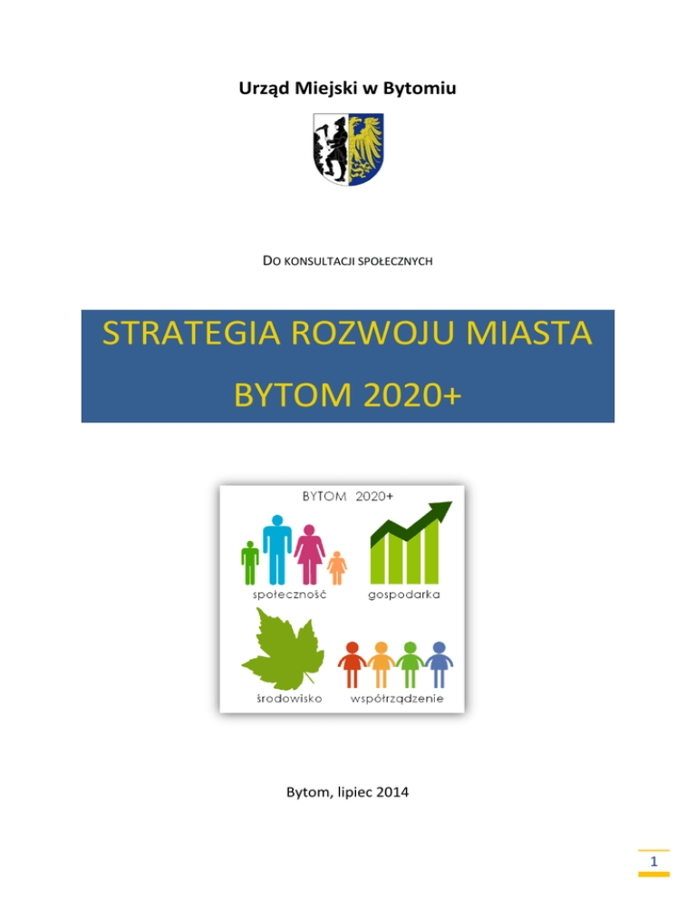 Urząd Miejski w Bytomiu DO KONSULTACJI SPOŁECZNYCH STRATEGIA ROZWOJU MIASTA BYTOM 2020+ Bytom, lipiec 2014 1 Dokument stanowi aktualizację Strategii Rozwoju Bytomia na lata 2009-2020, przyjętej uchwałą nr XLVI/640/09 Rady Miejskiej w Bytomiu z dnia 27 maja 2009 roku w sprawie przyjęcia „Strategii Rozwoju Bytomia na lata 2009 – 2020”. 2 Spis treści 1. GŁÓWNE ZAŁOŻENIA DO PRAC NAD AKTUALIZACJĄ STRATEGII ROZWOJU BYTOMIA ..................................... 4 2. KLUCZOWE WYZWANIA ROZWOJU BYTOMIA ............................................................................................. 9 3. WIZJA ROZWOJU BYTOMIA 2020+ ........................................................................................................ 12 4. DZIEDZINY PRIORYTETOWE STRATEGII ROZWOJU BYTOMIA .................................................................... 18 5. CELE STRATEGICZNE I KIERUNKI DZIAŁAŃ .............................................................................................. 21 6. BILANS STRATEGICZNY DLA DZIEDZIN PRIORYTETOWYCH ....................................................................... 29 7. SYSTEM WDRAŻANIA STRATEGII ............................................................................................................ 41 7.1. Założenia dotyczące systemu wdrażania strategii................................................................... 41 7.2. Mechanizm monitoringu i ewaluacji oraz wskaźniki realizacji celów strategicznych ........... 42 7.3. Podmioty wdrażania strategii................................................................................................... 52 7.4. Partnerski system wdrażania strategii ..................................................................................... 53 7.5. Władze lokalne w procesie wdrażania strategii....................................................................... 54 7.6. Przedsięwzięcia partnerskie wdrażające zaktualizowaną strategię ...................................... 55 7.7. Otwartość i elastyczność strategii ............................................................................................. 60 7.8. Kryteria wyboru projektów strategicznych .............................................................................. 62 7.9. Syntetyczna lista zasad wdrażania strategii ............................................................................ 63 8. RELACJE MIĘDZY ZAKTUALIZOWANYMI CELAMI STRATEGICZNYMI BYTOMIA A CELAMI STRATEGICZNYMI WOJEWÓDZTWA ŚLĄSKIEGO ...................................................................................................................... 68 9. PRZEBIEG PRAC NAD AKTUALIZACJĄ STRATEGII ROZWOJU BYTOMIA ........................................................ 73 10. UCZESTNICY PROCESU AKTUALIZACJI STRATEGII ................................................................................... 74 3 1. GŁÓWNE ZAŁOŻENIA DO PRAC NAD AKTUALIZACJĄ STRATEGII ROZWOJU BYTOMIA Aktualizacja „Strategii rozwoju Bytomia na lata 2009-2020” związana jest z wystąpieniem szeregu przesłanek wewnętrznych i zewnętrznych oddziałujących na zakres i sposób wdrażania obowiązującego dokumentu. Do głównych przesłanek uwzględnionych w procesie aktualizacji strategii należy zaliczyć: nowy okres programowania w UE i wiążącą się z tym zmianę kierunków polityki oraz zakresu i reguł wsparcia dla podmiotów lokalnych, nowe dokumenty i instrumenty wiążące się z tworzeniem i wdrażaniem na poziomie europejskim i krajowym polityki miejskiej, w tym Zintegrowane Inwestycje Terytorialne oraz Obszary Strategicznej Interwencji Państwa, aktualizacje dokumentów krajowych i regionalnych, a także stworzenie nowych dokumentów wyznaczających cele i kierunki polityki regionalnej oraz możliwości pozyskiwania wsparcia dla polityk realizowanych na szczeblu lokalnym, zmiany w politykach lokalnych realizowanych przez inne jednostki terytorialne, w szczególności przez miasta Aglomeracji Górnośląskiej, zmiany w wewnętrznych i zewnętrznych uwarunkowaniach decydujących o możliwościach kształtowania rozwoju miasta, możliwe do wykorzystania doświadczenia związane z procesem wdrażania dotychczasowych dokumentów strategicznych, szczególnie strategii oraz programów rewitalizacji. Poczynione z menedżerami lokalnymi oraz władzami miasta ustalenia wyjściowe do aktualizacji strategii objęły następujące założenia: potraktowanie aktualnej strategii jako wizji długofalowej oraz wyselekcjonowanie z niej celów i aktywności do realizacji w horyzoncie: krótkim – 2016/2017, średnim – 2020, stworzenie systemu wdrażania strategii, na który złożą się konkretne projekty, w szczególności inicjowane przez podmioty lokalne, ograniczenie „warstwy wdrożeniowej” strategii do projektów, które władze miasta i podmioty lokalne chcą z pełną determinacją realizować, powiązanie projektów z podmiotami i wykreowanie liderów wdrażających strategię, traktowanie strategii jako swego rodzaju partnerskiego kontraktu władz lokalnych i podmiotów lokalnych (co wspólnie chcemy zrobić w mieście i dla miasta?), wzbogacenie potencjału strategicznego miasta o wykorzystanie podmiotów i zasobów w otoczeniu – szczególnie w Aglomeracji Górnośląskiej, uwzględnieniu wszystkich wymiarów zintegrowanego podejścia do rozwoju miasta, tj. społecznego, gospodarczego, środowiskowego i współzarządzania oraz relacji między nimi. 4 Jako fundamentalne rozstrzygnięcia wyznaczające zakres i tryb prac nad aktualizacją przyjęto następujące stwierdzenia: dokument „Strategia rozwoju Bytomia na lata 2009-2020” jest opracowaniem stworzonym w sposób profesjonalny od strony metodologicznej i adekwatny do sytuacji miasta1; w szczególności, za ważną wartość dokumentu należy uznać jego opracowanie w trybie partnersko-eksperckim z udziałem różnych środowisk lokalnych, wypracowane w ramach „Strategi