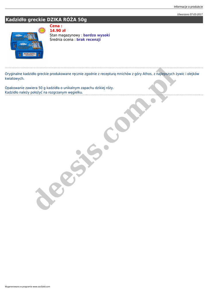 Informacje o produkcie Utworzono 07-03-2017 Kadzidło greckie DZIKA RÓŻA 50g Cena : 14.90 zł Stan magazynowy : bardzo wysoki Średnia ocena : brak recenzji m .p l Oryginalne kadzidło greckie produkowane ręcznie zgodnie z recepturą mnichów z góry Athos, z najlepszych żywic i olejków kwiatowych. de es is .c o Opakowanie zawiera 50 g kadzidła o unikalnym zapachu dzikiej róży. Kadzidło należy położyć na rozgrzanym węgielku. Wygenerowano w programie www.oscGold.com