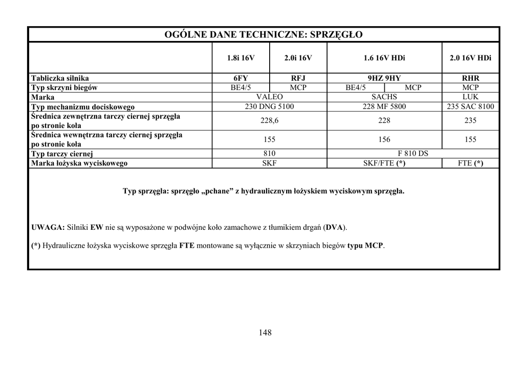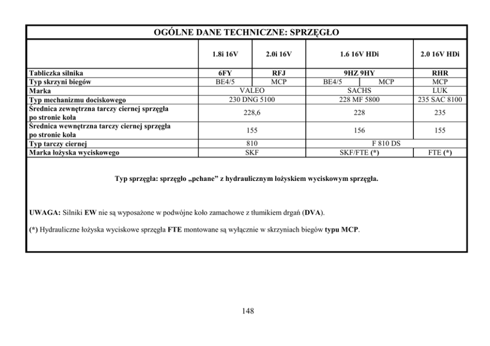 OGÓLNE DANE TECHNICZNE: SPRZĘGŁO Tabliczka silnika Typ skrzyni biegów Marka Typ mechanizmu dociskowego Średnica zewnętrzna tarczy ciernej sprzęgła po stronie koła Średnica wewnętrzna tarczy ciernej sprzęgła po stronie koła Typ tarczy ciernej Marka łoŜyska wyciskowego 1.8i 16V 2.0i 16V 6FY BE4/5 RFJ MCP 1.6 16V HDi 2.0 16V HDi 9HZ 9HY VALEO 230 DNG 5100 SACHS 228 MF 5800 RHR MCP LUK 235 SAC 8100 228,6 228 235 155 156 155 BE4/5 810 SKF MCP F 810 DS SKF/FTE (*) Typ sprzęgła: sprzęgło „pchane” z hydraulicznym łoŜyskiem wyciskowym sprzęgła. UWAGA: Silniki EW nie są wyposaŜone w podwójne koło zamachowe z tłumikiem drgań (DVA). (*) Hydrauliczne łoŜyska wyciskowe sprzęgła FTE montowane są wyłącznie w skrzyniach biegów typu MCP. 148 FTE (*) OGÓLNE DANE TECHNICZNE: SPRZĘGŁO Dane szczegółowe Skrzynia biegów MCP Sprzęgło sterowane jest za pomocą kalkulatora mechanicznej sterowanej skrzyni biegów. Hydrauliczne łoŜysko wyciskowe sprzęgła jest koncentryczne i posiada czujnik połoŜenia. Kalkulator mechanicznej sterowanej skrzyni biegów posiada licznik cykli uŜycia sprzęgła. Po zamontowaniu sprzęgła lub hydraulicznego łoŜyska wyciskowego, za pomocą przyrządu diagnostycznego naleŜy: Przywrócić ciśnienie i odpowietrzyć układ hydrauliczny. Wyzerować licznik cykli uŜycia sprzęgła (wyłącznie w przypadku wymiany mechanizmu dociskowego sprzęgła na nowy). Procedura uczenia punktu styku sprzęgła. Sprzęgła typu luk (sac). Elementy cierne sprzęgła LUK nie są wyposaŜone w piasty amortyzujące. Filtrowanie hałasów generowanych przez skrzynię biegów zapewnia podwójne koło zamachowe z tłumikiem drgań (DVA), a nie piasta tarczy sprzęgła. Mechanizm dociskowy sprzęgła LUK zawiera układ automatycznego kasowania luzu, który wymaga specjalnych narzędzi podczas montaŜu. (1) układ automatycznego kasowania luzu. (2) spręŜyny kompensujące. UWAGA: podczas montaŜu ustawić tarczę sprzęgła stroną, na której umieszczony jest Nr PSA 96 XXX XXX 80 od strony skrzyni biegów. B2BP2PYD 149