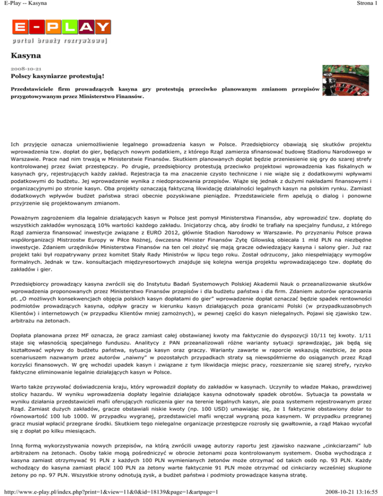 E-Play -- Kasyna Strona 1 Kasyna 2008-10-21 Polscy kasyniarze protestują! Przedstawiciele firm prowadzących kasyna gry protestują przeciwko planowanym zmianom przepisów przygotowywanym przez Ministerstwo Finansów. Ich przyjęcie oznacza uniemożliwienie legalnego prowadzenia kasyn w Polsce. Przedsiębiorcy obawiają się skutków projektu wprowadzenia tzw. dopłat do gier, będących nowym podatkiem, z którego Rząd zamierza sfinansować budowę Stadionu Narodowego w Warszawie. Prace nad nim trwają w Ministerstwie Finansów. Skutkiem planowanych dopłat będzie przeniesienie się gry do szarej strefy kontrolowanej przez świat przestępczy. Po drugie, przedsiębiorcy protestują przeciwko projektowi wprowadzenia kas fiskalnych w kasynach gry, rejestrujących każdy zakład. Rejestracja ta ma znaczenie czysto techniczne i nie wiąże się z dodatkowymi wpływami podatkowymi do budżetu. Jej wprowadzenie wynika z niedopracowania przepisów. Wiąże się jednak z dużymi nakładami finansowymi i organizacyjnymi po stronie kasyn. Oba projekty oznaczają faktyczną likwidację działalności legalnych kasyn na polskim rynku. Zamiast dodatkowych wpływów budżet państwa straci obecnie pozyskiwane pieniądze. Przedstawiciele firm apelują o dialog i ponowne przyjrzenie się projektowanym zmianom. Poważnym zagrożeniem dla legalnie działających kasyn w Polsce jest pomysł Ministerstwa Finansów, aby wprowadzić tzw. dopłatę do wszystkich zakładów wynoszącą 10% wartości każdego zakładu. Inicjatorzy chcą, aby środki te trafiały na specjalny fundusz, z którego Rząd zamierza finansować inwestycje związane z EURO 2012, głównie Stadion Narodowy w Warszawie. Po przyznaniu Polsce prawa współorganizacji Mistrzostw Europy w Piłce Nożnej, ówczesna Minister Finansów Zytę Gilowską obiecała 1 mld PLN na niezbędne inwestycje. Zdaniem urzędników Ministerstwa Finansów na ten cel złożyć się mają gracze odwiedzający kasyna i salony gier. Już raz projekt taki był rozpatrywany przez komitet Stały Rady Ministrów w lipcu tego roku. Został odrzucony, jako niespełniający wymogów formalnych. Jednak w tzw. konsultacjach międzyresortowych znajduje się kolejna wersja projektu wprowadzającego tzw. dopłatę do zakładów i gier. Przedsiębiorcy prowadzący kasyna zwrócili się do Instytutu Badań Systemowych Polskiej Akademii Nauk o przeanalizowanie skutków wprowadzenia proponowanych przez Ministerstwo Finansów przepisów i dla budżetu państwa i dla firm. Zdaniem autorów opracowania pt. „O możliwych konsekwencjach objęcia polskich kasyn dopłatami do gier” wprowadzenie dopłat oznaczać będzie spadek rentowności podmiotów prowadzących kasyna, odpływ graczy w kierunku kasyn działających poza granicami Polski (w przypadkuzasobnych Klientów) i internetowych (w przypadku Klientów mniej zamożnych), w pewnej części do kasyn nielegalnych. Pojawi się zjawisko tzw. arbitrażu na żetonach. Dopłata planowana przez MF oznacza, że gracz zamiast całej obstawianej kwoty ma faktycznie do dyspozycji 10/11 tej kwoty. 1/11 staje się własnością specjalnego funduszu. Analitycy z PAN przeanalizowali różne warianty sytuacji sprawdzając, jak będą się kształtować wpływy do budżetu państwa, sytuacja kasyn oraz graczy. Warianty zawarte w raporcie wskazują niezbicie, że poza scenariuszem nazwanym przez autorów „naiwny” w pozostałych przypadkach straty są niewspółmierne do osiąganych przez Rząd korzyści finansowych. W grę wchodzi upadek kasyn i związane z tym likwidacja miejsc pracy, rozszerzanie się szarej strefy, ryzyko faktyczne eliminowanie legalnie działających kasyn w Polsce. Warto także przywołać doświadczenia kraju, który wprowadził dopłaty do zakładów w kasynach. Uczyniły to władze Makao, prawdziwej stolicy hazardu. W wyniku wprowadzenia dopłaty legalnie działające kasyna odnotowały spadek obrotów. Sytuacja ta powstała w wyniku działania przedstawicieli mafii oferujących rozliczenia gier na terenie legalnych kasyn, ale poza systemem rejestrowanym przez Rząd. Zamiast dużych zakładów, gracze obstawiali niskie kwoty (np. 100 USD) umawiając się, że 1 faktycznie obstawiony dolar to równowartość 100 lub 1000. W przypadku wygranej, przedstawiciel mafii wręczał wygraną poza kasynem. W przypadku przegranej gracz musiał wpłacić przegrane środki. Skutkiem tego nielegalne organizacje przestępcze rozrosły się gwałtownie, a rząd Makao wycofał się z dopłat po kilku miesiącach. Inną formą wykorzystywania nowych przepisów, na którą zwrócili uwagę autorzy raportu jest zjawisko nazwane „cinkciarzami” lub arbitrażem na żetonach. Osoby takie mogą pośredniczyć w obrocie żetonami poza kontrolowanym systemem. Osoba wychodząca z kasyna zamiast otrzymywać 91 PLN z każdych 100 PLN wymienianych żetonów może otrzymać od takich osób np. 93 PLN. Każdy wchodzący do kasyna zamiast płacić 100 PLN za żetony warte faktycznie 91 PLN może otrzymać od cinkciarzy wcześniej skupione żetony po np. 97 PLN. Wszystkie strony odnotują zysk, a budżet państwa i podmioty prowadzące kasyna stratę. http://www.e-play.pl/index.php?print=1&view=11&0&id=18139&page=1&artpage=1 2008-10-21 13:16:55 E-Play -- Kasyna Strona 2 żetony po np. 97 PLN. Wszystkie strony odnotują zysk, a budżet państwa i podmioty prowadzące kasyna stratę. Dodatkowym obciążeniem zauważonym przez analityków PAN, jakie będą musiały ponieść kasyna będzie dostosowanie automatów do gier dostępnych w każdym kasynie. Taka procedura będzie oznaczać konieczność wydatkowania kilku milionów złotych na opracowanie i wdrożenie nowego oprogramowania umożliwiającego liczenie środków należnych Państwu z żetonów wrzucanych do automatów. Drugim problemem zagrażającym istnieniu kasyn jest znajdujący się w Sejmie przygotowany przez Rząd projekt ustawy o zmianie ustawy o podatku od towarów i usług oraz n