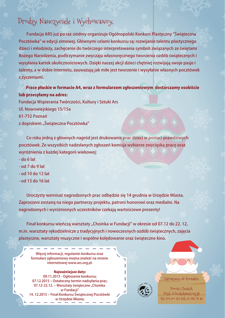 Drodzy Nauczyciele i Wychowawcy, Fundacja ARS ju po raz siódmy organizuje Ogólnopolski Konkurs Plastyczny wi teczna Pocztówka w edycji zimowej. Głównymi celami konkursu s : rozwijanie talentu plastycznego dzieci i młodzie y, zach cenie do twórczego interpretowania symboli zwi zanych ze wi tami Bo ego Narodzenia, podtrzymanie zwyczaju własnor cznego tworzenia ozdób wi tecznych i wysyłania kartek okoliczno ciowych. Dzi ki naszej akcji dzieci ch tniej rozwijaj swoje pasje i talenty, a w dobie Internetu, zauwa aj jak miłe jest tworzenie i wysyłanie własnych pocztówek z yczeniami. Prace płaskie w formacie A4, wraz z formularzem zgłoszeniowym dostarczamy osobi cie lub przesyłamy na adres: Fundacja Wspierania Twórczo ci, Kultury i Sztuki Ars Ul. Nowowiejskiego 15/15a 61-732 Pozna z dopiskiem „ wi teczna Pocztówka Co roku jedn z głównych nagród jest drukowanie prac dzieci w postaci prawdziwych pocztówek. Ze wszystkich nadesłanych zgłosze komisja wybierze zwyci sk prac oraz wyró nienia z ka dej kategorii wiekowej: - do 6 lat - od 7 do 9 lat - od 10 do 12 lat - od 13 do 16 lat Uroczysty wernisa nagrodzonych prac odb dzie si 14 grudnia w Urz dzie Miasta. Zaproszeni zostan na niego partnerzy projektu, patroni honorowi oraz medialni. Na nagrodzonych i wyró nionych uczestników czekaj warto ciowe prezenty! Finał konkursu wie cz warsztaty „Choinka w Fundacji w okresie od 07.12 do 22. 12, m.in. warsztaty r kodzielnicze z tradycyjnych i nowoczesnych ozdób wi tecznych, zaj cia plastyczne, warsztaty muzyczne i wspólne kol dowanie oraz wi teczne kino. Wi cej informacji, regulamin konkursu oraz formularz zgłoszeniowy mo na znale na stronie internetowej www.ars.org.pl. Zapraszamy do kontaktu: Kultury i S ci z ki tu ARS F dacja Wspi un ia Twórcz an o er Najwa niejsze daty: 09.11.2015 - Ogłoszenie konkursu; 07.12.2015 ‒ Ostateczny termin nadsyłania prac; 07.12-22.12. ‒ Warsztaty wi teczne „Choinka w Fundacji 14. 12.2015 ‒ Finał Konkursu wi tecznej Pocztówki w Urz dzie Miasta; Dorota Chudzik Mail: [email protected] Tel: 509 600 403 lub 61 855 25 45