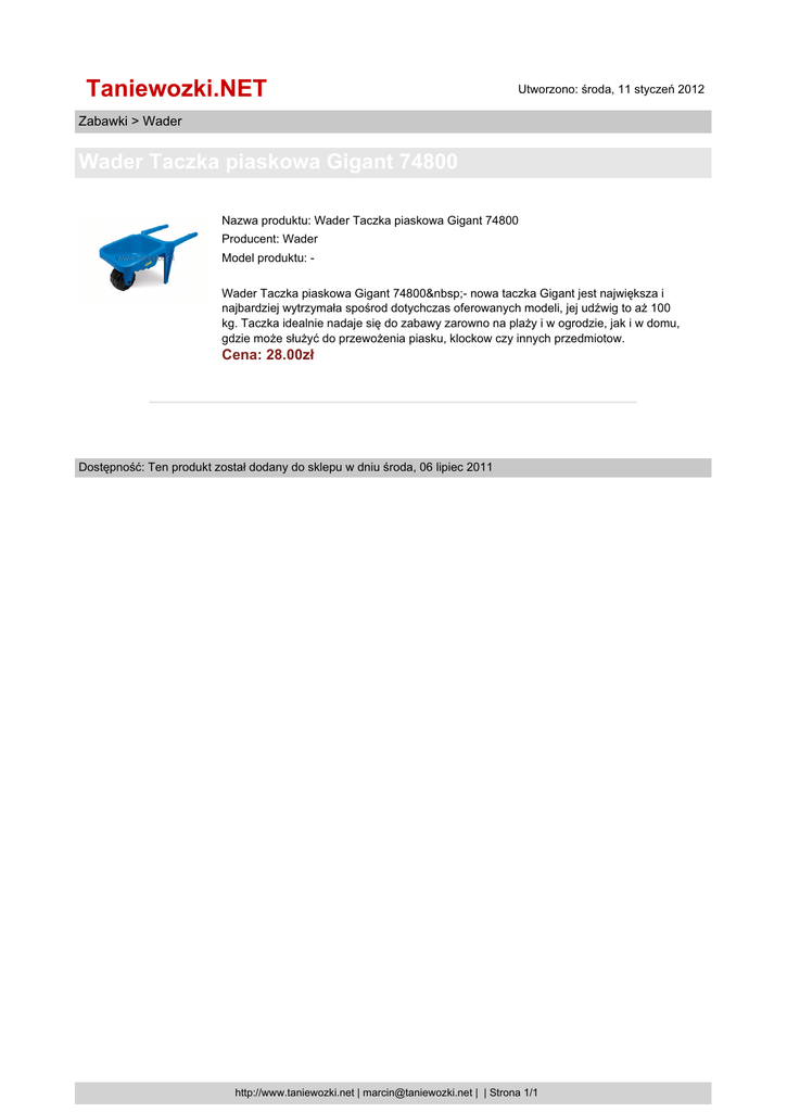 Taniewozki.NET Utworzono: środa, 11 styczeń 2012 Zabawki > Wader Wader Taczka piaskowa Gigant 74800 Nazwa produktu: Wader Taczka piaskowa Gigant 74800 Producent: Wader Model produktu: Wader Taczka piaskowa Gigant 74800 - nowa taczka Gigant jest największa i najbardziej wytrzymała spośrod dotychczas oferowanych modeli, jej udźwig to aż 100 kg. Taczka idealnie nadaje się do zabawy zarowno na plaży i w ogrodzie, jak i w domu, gdzie może służyć do przewożenia piasku, klockow czy innych przedmiotow. Cena: 28.00zł Dostępność: Ten produkt został dodany do sklepu w dniu środa, 06 lipiec 2011 http://www.taniewozki.net | [email protected] | | Strona 1/1