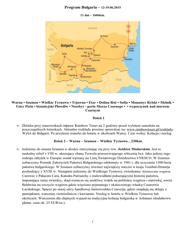 Program Bułgaria – 12-19.06.2015 11 dni – 1604km. Warna • Szumen • Wielkie Tyrnowo • Trjawna • Etar • Dolina RóŜ • Sofia • Monastyr Rylski • Melnik • Góry Pirin • bizantyjski Płowdiw • Nesebyr - perła Morza Czarnego • • wypoczynek nad morzem Czarnym Dzień 1 • Zbiórka przy stanowiskach odpraw Rainbow Tours na 2 godziny przed wylotem samolotu na poszczególnych lotniskach. Aktualne rozkłady prosimy sprawdzać na: www.rainbowtours.pl/rozklady. Wylot do Bułgarii. Po przylocie transfer do hotelu w okolicach Warny. Czas wolny. Kolacja i nocleg. Dzień 2 – Warna – Szumen – Wielkie Tyrnowo…230km. • Jedziemy do miasta Szumen w drodze zatrzymując się przy tzw. Jeźdźcu Madarskim. Jest to naskalny relief z VIII w. ukazujący chana Terwela przeszywającego włócznią lwa. Jako jedyny tego rodzaju zabytek w Europie został wpisany na Listę Światowego Dziedzictwa UNESCO. W Szumen zobaczymy Pomnik ZałoŜycieli Państwa Bułgarskiego odsłonięty w 1981 r. dla uczczenia 1300-lecia państwa bułgarskiego. W Szumen zobaczymy równieŜ największy meczet w kraju Tombuł-DŜamija pochodzący z XVIII w. Następnie jedziemy do Wielkiego Tyrnowa, zwiedzamy: historyczne wzgórze Carewec z Pałacem Cara, Katedra Patriarchy z malowidłami pokazującymi historię państwa, imponujące ruiny twierdzy, skąd roztacza się urokliwy widok na pobliskie wzgórza i starówkę, wieŜa Baldwina na szczycie wzgórza gdzie więziono pojmanego i okaleczonego władcę Cesarstwa Łacińskiego. Spacer po starej ulicy handlowej Samowodska Czarszija, gdzie znajdują się sklepy z pamiątkami, warsztaty rzemieślnicze i kawiarnie. Nocleg w hotelu w Wielkim Tyrnowie lub okolicach. Wieczorem dla chętnych wyjazd na tradycyjna kolację bułgarską w Arbanasi (dodatkowo płatne, cena ok. 25 EUR/os.). 1 Dzień 3 – Wielkie Tyrnowo – Trjawna – Etar – Szipka – Kazanłyk – Wielkie Tyrnowo….206km. • Udamy się do Trjawny, jednej z architektonicznych perełek Bułgarii. Znajdują się tu doskonałe przykłady budownictwa i rzemiosła czasów odrodzenia narodowego. • Następnie jedziemy zwiedzić wieś-skansen Etar - słynne muzeum na otwartym powietrzu składające się z domów o typowej architekturze bułgarskiego odrodzenia narodowego z XVIII i XIX w. Poznają Państwo w niej bułgarski folklor i sekrety pracy rozlicznych rzemieślników, którzy prowadzą tam swoje warsztaty otwarte dla zwiedzających. • Jedziemy w kierunku Kazanłyku. Po drodze zwiedzanie cerkwi Narodzenia Pańskiego w Szipce. • DojeŜdŜamy do miasta Kazanłyk, czyli stolicy Doliny RóŜ. Odkryjemy tam tajniki uprawy róŜy damasceńskiej i produkcji znanego i cenionego na całym świecie olejku róŜanego. Jest on uŜywany do tworzenia wielu słynnych perfum i doskonałych kosmetyków. Do uzyskania 1 kg. olejku róŜanego wysokiej jakości potrzebne jest ponad 3 ton w specjalny sposób zebranych płatków róŜ. W pierwszy weekend czerwca w Kazanłyk odbywa się Święto RóŜ połączony z wyborem „carycy róŜ” , pochodem, zabawą. Zwiedzamy Kazanłyk, który jest określany równieŜ jako stolica „Doliny Trackich Królów”. Poznamy historię tych terenów i zaskakujące odkrycia w kurhanach trackich władców. Następnie zwiedzimy kopię słynnego, kazanłyckiego grobowca, który został wpisany na Listę Światowego Dziedzictwa UNESCO. • Powrót do Wielkiego Tyrnowa na obiadokolację. Dzień 4 – Wielkie Tyrnowo – Koprivshtitsa - Sofia …293km. • Udajemy się do stolicy Bułgarii – Sofii. Po drodze zwiedzamy kolorową tradycyjną wioskę muzeum – Koprivshtitsa. Sofia - zapoznamy się z historyczna częścią stolicy, gdzie zobaczymy m.in. Sobór Ew. Aleksandra Newskiego - największą cerkiew na Bałkanach z pozłacanymi kopułami oraz 12 cięŜkimi dzwonami, upiększona freskami i ikonami najznakomitszych rosyjskich i bułgarskich artystów przełomu XIX i XX w., wysoki na 14 metrów posag Aleksandra II zwanego Carem Oswobodzicielem, który przyczynił się do odzyskania niepodległości przez Bułgarów, przedstawionego przez włoskiego rzeźbiarza Arnoldo Zocchi na koniu, Cerkiew Ew. Zofii – świątynię zbudowaną za panowania bizantyjskiego cesarza Justyniana w VI w., Cerkiew Ew. Mikołaja, Narodową Galerię Sztuk Pięknych znajdującą się w dawnym pałacu carskim, Narodowe Muzeum Historyczne w dawnym pałacu prezydenckim Teodora śiwkowa, Muzeum Archeologiczne w Wielkim Meczecie z XV w (większość obiektów oglądana z zewnątrz). Spacer ulicami Sofii zakończymy przy Cerkwi p.w. Św. Jerzego – najstarszym budynku stolicy - w okolicy Meczetu Bania Baszi i Hali Targowej. Przejazd na nocleg i kolację w hotelu w Sofii lub okolicach. Dzień 5 – Sofia – Monastyr Rylski – Melnik…242km. • Opuszczamy Sofię. Jedziemy w kierunku Melnika. Po drodze zwiedzamy Monastyr Rylski. Ten najsłynniejszy i największy klasztor w Bułgarii jest licznie odwiedzany zarówno przez pielgrzymów, jak i turystów. Stanowi on pomnik kultury i jest wpisany na Listę Światowego Dziedzictwa UNESCO. Najświętsze miejsce dla Bułgarów, słynące z cudów, wielokrotnie niszczone przez wrogów i odradzające się jak feniks z popiołów, aby od wieków stać na straŜy tradycji i kultury bułgarskiej. Klasztor połoŜony malowniczo w górach Riła, otoczony lasami, zaskakuje zarówno swym wyglądem z zewnątrz grube, surowe, wysokie mury, natomiast wewnątrz dziedzińce z kruŜgankami w stylu odrodzenia bułgarskiego - jak i atmosfera skupienia i modlitwy. • Udajemy się do miejscowości Melnik – przepięknie połoŜonego, górskiego miasteczka, w słynnym regionie winiarskim, gdzie nowoczesność przeplata się z tradycją. Wieczorem dla chętnych (o ile czas 2 na to pozwoli) wyjazd na kolację z bułgarskimi winami (dodatkowo płatne, ok. 35 EUR/os.). Nocleg w Melnik lub okolicach. Dzień 6 – Melnik – Pamporovo – Bachkovski manastyr – Płowdiw…258km. • J