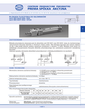 SPÓ ŁKA AKCYJNA ul. Wapiennikowa 90, 25-101 KIELCE, tel. 041 361-95-24, fax. 0-41 361-91-08 www.prema.pl e-mail: [email protected] BLOKADA TŁOCZYSKA DO SIŁOWNIKÓW serii ISO 6432 D20 i D25 serii ISO 6431 D32 ÷ D125 1 ZASTOSOWANIE Blokada pneumatyczna stosowana jest do siłowników serii ISO 6431 oraz ISO 6432 i służy do mechanicznego zatrzymywania tłoczyska siłownika w dowolnym miejscu skoku. Siła blokująca tłoczysko jest zawsze większa od siły z jaką działa siłownik zasilany sprężonym powietrzem o ciśnieniu 1.0 MPa. Blokada może służyć do dokładnego pozycjonowania tłoczyska siłownika pneumatycznego bez uszkodzenia powierzchni zewnętrznej tłoczyska. Zalecane sposoby sterowania siłownikiem pneumatycznym z blokadą przedstawiono na rysunkach. 2 3 4 1 5 2 1 3 DANE TECHNICZNE Minimalne ciśnienie zasilania blokady: - 0.25 MPa przy zasilaniu siłownika powietrzem o ciśnieniu 0 ÷ 0.7 MPa - 0.30 MPa przy zasilaniu siłownika powietrzem o ciśnieniu 0.7 ÷ 10 Mpa Maksymalne ciśnienie zasilania blokady: 0.6 Mpa Zakres temperatur pracy: od -5 do +80 °C Typ blokady: mechaniczna Pozycja pracy: dowolna Stan blokady bez podłączonego zasilania: zablokowana (tłoczysko unieruchomione) Siły utrzymujące tłoczysko siłownika: Średnica siłownika 20 Siła utrzymująca tłoczysko [N] 490 25 32 40 50 63 80 100 125 490 790 1240 1930 3060 5400 7700 12040 Sposób zasilania: przewodowo sprężonym powietrzem o maksymalnej wielkości cząstek stałych 10 μm (nie wymaga smarowania) lub sprężonym powietrzem o maksymalnej wielkości cząstek stałych 40 μm, smarowanym mgłą olejową 2 ÷ 5 kropli/m. Materiały konstrukcyjne: Obudowa - stop aluminium anodowany Uszczelnienia - guma olejoodporna NBR 1.037.1 WYMIARY Blokada do siłowników ISO 6432 D20-D25 S D C A B Ø BE L M F G H T Wymiary [mm] Średnica siłownika [mm] A Masa [kg] C D F G H L M S T* 20 34 35 M22x1,5 13 B ØBE 54 22 24 27 5 M5 69 45 0,190 25 34 35 M22x1,5 13 54 22 28 27 5 M5 73 45 0,190 Blokada do siłowników ISO 6431 D32-D125 UWAGA: Blokada montowana jest na siłowniku z tłoczyskiem wydłużonym o wymiar T w stosunku do siłownika standardowego. Oznaczenie „B” na końcu nr zamówieniowego siłownika. S WH P G C TG E Q 4×M ØB R 4×M TG E D T F Średnica siłownika [mm] ØBE11 C 32 30 6 35 40 50 63 80 100 125 6 Wymiary [mm] D E 20 47 20 54 M G F P Q R S T* TG WH 4 × M6 G1/8 67.5 33.5 9 8 86 60 32.5 26 4 × M6 G1/8 9 8 100 70 80 42.5 38 30 Masa [kg] 0.4 0.6 40 8 24 65 4 × M8 G1/8 100 58 12.5 12 127 90 46.5 37 1.1 45 8 24 75 4 × M8 G1/8 100 59 17.5 12 127 90 56.5 37 1.5 45 12 32 95 4 × M10 G1/4 120 69 17.5 6 156 110 72 46 2.6 55 60 12 20 32 114 4 × M10 G1/4 120 69 27 16 161 110 89 51 45 138 4 × M12 G1/4 156 84,5 19 20 205 140 110 65 3.5 6.5 UWAGA: Blokada montowana jest na siłowniku z tłoczyskiem wydłużonym o wymiar T w stosunku do siłownika standardowego. Oznaczenie „B” na końcu nr zamówieniowego siłownika. SPOSÓB MONTAŻU NA SIŁOWNIKU PNEUMATYCZNYM Montaż blokady pneumatycznej na siłowniku odbywa się przy pomocy 4 śrub wkręconych w otwór gwintowany wykonany w nakrętce specjalnej skręcającej siłownik. Wymaganą długość śrub podano w tabeli. Montaż na siłowniku polega na podłączeniu zasilania ok. 0.3 MPa do przyłącza blokady, nasunięciu blokady na tłoczysko siłownika i wystające końce śrub mocujących a następnie na zablokowaniu S1 nakrętkami. Średnica siłownika 32 40 50 63 80 100 125 S1 12 12 16 16 22 22 32 1.037.2 SPOSÓB BUDOWY NUMERU ZAMÓWIENIOWEGO 10. 037 F. kod średnicy C - średnica D- średnica E- średnica F- średnica G- średnica H- średnica J- średnica K- średnica L - średnica D20 D25 D32 D40 D50 D63 D80 D100 D125 SPOSÓB ZAMAWIANIA Uwaga! Siłownik do montażu z blokadą tłoczyska powinien zawierać na końcu numeru zamówieniowego oznaczenie literą „B”. ”W zamówieniu należy podać: nazwę, średnicę nominalną siłownika do którego będzie stosowana blokada, numer zamówieniowy oraz ilość sztuk np: 1. Blokada pneumatyczna do siłownika ISO D63 10.037H - 15 szt. 2. Siłownik D63 x 100 Nr 10.016H.0100AB - 15 szt. 1.037.3