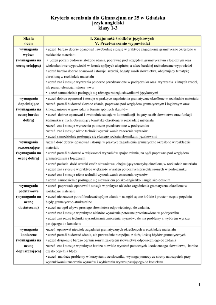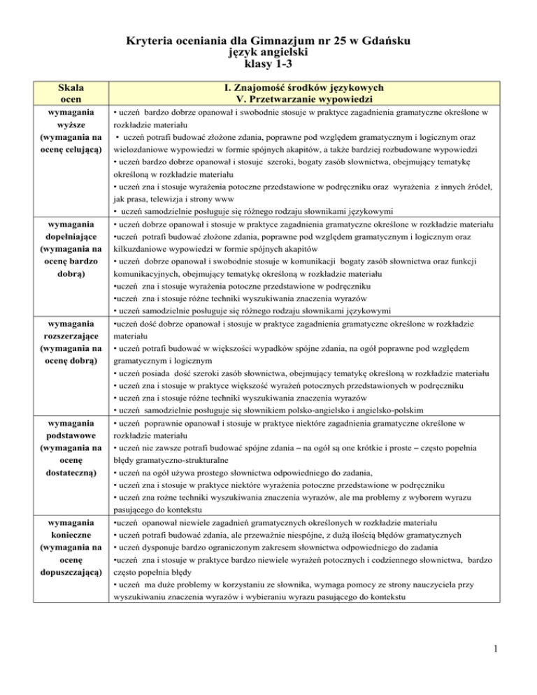 Kryteria oceniania dla Gimnazjum nr 25 w Gdańsku język angielski klasy 1-3 I. Znajomość środków językowych V. Przetwarzanie wypowiedzi Skala ocen wymagania wyższe (wymagania na ocenę celującą) • uczeń bardzo dobrze opanował i swobodnie stosuje w praktyce zagadnienia gramatyczne określone w rozkładzie materiału • uczeń potrafi budować złożone zdania, poprawne pod względem gramatycznym i logicznym oraz wielozdaniowe wypowiedzi w formie spójnych akapitów, a także bardziej rozbudowane wypowiedzi • uczeń bardzo dobrze opanował i stosuje szeroki, bogaty zasób słownictwa, obejmujący tematykę określoną w rozkładzie materiału • uczeń zna i stosuje wyrażenia potoczne przedstawione w podręczniku oraz wyrażenia z innych źródeł, jak prasa, telewizja i strony www • uczeń samodzielnie posługuje się różnego rodzaju słownikami językowymi wymagania dopełniające (wymagania na ocenę bardzo dobrą) • uczeń dobrze opanował i stosuje w praktyce zagadnienia gramatyczne określone w rozkładzie materiału •uczeń potrafi budować złożone zdania, poprawne pod względem gramatycznym i logicznym oraz kilkuzdaniowe wypowiedzi w formie spójnych akapitów • uczeń dobrze opanował i swobodnie stosuje w komunikacji bogaty zasób słownictwa oraz funkcji komunikacyjnych, obejmujący tematykę określoną w rozkładzie materiału •uczeń zna i stosuje wyrażenia potoczne przedstawione w podręczniku •uczeń zna i stosuje różne techniki wyszukiwania znaczenia wyrazów • uczeń samodzielnie posługuje się różnego rodzaju słownikami językowymi wymagania rozszerzające (wymagania na ocenę dobrą) •uczeń dość dobrze opanował i stosuje w praktyce zagadnienia gramatyczne określone w rozkładzie materiału • uczeń potrafi budować w większości wypadków spójne zdania, na ogół poprawne pod względem gramatycznym i logicznym • uczeń posiada dość szeroki zasób słownictwa, obejmujący tematykę określoną w rozkładzie materiału • uczeń zna i stosuje w praktyce większość wyrażeń potocznych przedstawionych w podręczniku • uczeń zna i stosuje różne techniki wyszukiwania znaczenia wyrazów • uczeń samodzielnie posługuje się słownikiem polsko-angielsko i angielsko-polskim wymagania podstawowe (wymagania na ocenę dostateczną) • uczeń poprawnie opanował i stosuje w praktyce niektóre zagadnienia gramatyczne określone w rozkładzie materiału • uczeń nie zawsze potrafi budować spójne zdania – na ogół są one krótkie i proste – często popełnia błędy gramatyczno-strukturalne • uczeń na ogół używa prostego słownictwa odpowiedniego do zadania, • uczeń zna i stosuje w praktyce niektóre wyrażenia potoczne przedstawione w podręczniku • uczeń zna rożne techniki wyszukiwania znaczenia wyrazów, ale ma problemy z wyborem wyrazu pasującego do kontekstu wymagania konieczne (wymagania na ocenę dopuszczającą) •uczeń opanował niewiele zagadnień gramatycznych określonych w rozkładzie materiału • uczeń potrafi budować zdania, ale przeważnie niespójne, z dużą ilością błędów gramatycznych • uczeń dysponuje bardzo ograniczonym zakresem słownictwa odpowiedniego do zadania •uczeń zna i stosuje w praktyce bardzo niewiele wyrażeń potocznych i codziennego słownictwa, bardzo często popełnia błędy • uczeń ma duże problemy w korzystaniu ze słownika, wymaga pomocy ze strony nauczyciela przy wyszukiwaniu znaczenia wyrazów i wybieraniu wyrazu pasującego do kontekstu 1 Skala ocen II. Rozumienie wypowiedzi ustnych wymagania wyższe (wymagania na ocenę celującą) wymagania dopełniające (wymagania na ocenę bardzo dobrą) • potrafi z łatwością wyodrębnić i zrozumieć ogólny sens różnorodnych tekstów i rozmów • potrafi zrozumieć kluczowe informacje w różnorodnych tekstach i rozmowach i wyłonić z nich błędy • potrafi wydobyć szczegółowe informacje i stosownie do nich zareagować, np. zrobić na ich podstawie notatkę, uszeregować zdarzenia, czy wypełnić tabelkę • potrafi z łatwością rozpoznać uczucia i reakcje mówiącego • potrafi zrozumieć i wyodrębnić ogólny sens różnorodnych tekstów i rozmów opartych na materiale kursowym • potrafi zrozumieć kluczowe informacje w różnorodnych tekstach i rozmowach i wyłonić z nich błędy • potrafi wydobyć szczegółowe informacje i stosownie do nich zareagować, np. zrobić na ich podstawie notatkę, uszeregować zdarzenia, czy wypełnić tabelkę • potrafi z łatwością rozpoznać uczucia i reakcje mówiącego • potrafi streścić komunikat, używając języka angielskiego i polskiego • potrafi zazwyczaj zrozumieć ogólny sens różnorodnych tekstów i rozmów • potrafi zrozumieć większość kluczowych informacji w różnorodnych tekstach i rozmowach • potrafi wydobyć większość potrzebnych informacji i stosownie do nich zareagować, np. zrobić na ich podstawie krótką notatkę, uszeregować zdarzenia, czy wypełnić tabelkę • potrafi rozpoznać uczucia i reakcje mówiącego • potrafi rozróżniać dźwięki, głoski i akcent w większości wyrazów i zdań • potrafi zrozumieć polecenia nauczyciela • potrafi czasami zrozumieć ogólny sens różnorodnych tekstów i rozmów • potrafi zrozumieć część kluczowych informacji w różnorodnych tekstach i rozmowach • potrafi wydobyć część potrzebnych informacji i stosownie do nich zareagować, np. dopasować różne elementy, uszeregować zdarzenia, czy wypełnić tabelkę • potrafi zazwyczaj rozpoznać uczucia i reakcje mówiącego • potrafi rozróżniać większość dźwięków i głosek, ale ma problemy z rozpoznaniem akcentu wyrazowego i zdaniowego • potrafi zazwyczaj zrozumieć polecenia nauczyciela • rzadko potrafi zrozumieć ogólny sens różnorodnych tekstów i rozmów • potrafi zrozumieć kilka kluczowych informacji w różnorodnych tekstach i rozmowach • potraf