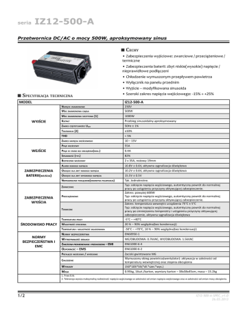 IZ12-500-A seria Przetwornica DC/AC o mocy 500W, aproksymowany sinus CECHY • Zabezpieczenia wyjściowe: zwarciowe / przeciążeniowe / termiczne • Zabezpieczenia baterii: zbyt niskie(wysokie) napięcie / nieprawidłowe podłączeni • Chłodzenie wymuszonym przepływem powietrza • Wyłącznik na panelu przednim • Wyjście – modyfikowana sinusoida SPECYFIKACJA TECHNICZNA MODEL WYJŚCIE WEJŚCIE ZABEZPIECZENIA BATERII(WEJŚCIA) IZ12-500-A NAPIĘCIE ZNAMIONOWE MOC ZNAMIONOWA CIĄGŁA 230V 500W MOC ZNAMIONOWA SZCZYTOWA [1] 1000W KSZTAŁT Przebieg sinusoidalny aproksymowany ZAKRES CZĘSTOTLIWOŚCI UWY 50Hz ± 1% TOLERANCJA [2] ±10% THD < 5% ZAKRES NAPIĘCIA WEJŚCIOWEGO 10 – 15V PRĄD WEJŚCIOWY 55A PRĄD W STANIE BEZ OBCIĄŻENIA(MAX.) 0.4A SPRAWNOŚĆ (TYP.) 82% BEZPIECZNIK WEJŚCIOWY 2 x 35A, nożowy 19mm ALARM NISKIEGO NAPIĘCIA 10.8V ± 0.6V, aktywna sygnalizacja dźwiękowa ODCIĘCIE DLA ZBYT NISKIEGO NAPIĘCIA 10.2V ± 0.6V, aktywna sygnalizacja dźwiękowa ODCIĘCIE DLA ZBYT WYSOKIEGO NAPIĘCIA 15.5V ± 0.5V NIEPRAWIDŁOWE PODŁĄCZENIE(ODWROTNA POLARYZACJA) TEMPERATURA PRACY Tak. Jednokrotne. Typ: odcięcie napięcia wyjściowego, automtyczny powrót do normalnej pracy po ustąpieniu przyczyny aktywującej zabezpieczenie. Zakres: powyżej 600W Typ: odcięcie napięcia wyjściowego, automtyczny powrót do normalnej pracy po ustąpieniu przyczyny aktywującej zabezpieczenie. Zakres: temperatura wewnętrz urządzenia 75°C ± 5°C Typ: odcięcie napięcia wyjściowego, automtyczny powrót do normalnej pracy po zmniejszeniu temperatry i ustąpieniu przyczyny aktywującej zabezpieczenie, aktywna sygnalizacja dźwiękowa -5°C – +40°C WILGOTNOŚĆ OTOCZENIA 20 % – 90% względna(bez kondensacji) TEMPERATURA I WILGOTNOŚĆ SKŁADOWANIA -30°C – +70°C, 10 % – 90% względna(bez kondensacji) NORMY BEZPIECZEŃSTWA WYTRZYMAŁOŚĆ IZOLACJI ZAKŁÓCENIA PROMIENIOWANE I PRZEWODZONE – EMI ODPORNOŚĆ – EMS EN60950-1 PRZYŁĄCZE WEJŚCIOWE / WYJŚCIOWE Zaciski gwintowane M6 Wymuszony obieg powietrza(wentylator): aktywacja w zależności od temperatury wewnętrznej oraz stopnia obciążenia 150*105*55(*dł.*szer.*wys.) ZWARCIOWE ZABEZPIECZENIA WYJŚCIA PRZECIĄŻENIOWE TERMICZNE ŚRODOWISKO PRACY NORMY BEZPIECZEŃSTWA I EMC • Szeroki zakres napięcia wejściowego: -15% ÷ +25% CHŁODZENIE WYMIARY MASA WE/OBUDOWA: 0.7kVAC, WY/OBUDOWA: 1.5kVAC EN61000-6-4 EN61000-6-2 0.95kg, 16szt./karton, wymiary karton – 38x38x45cm, masa – 15.2kg 1. Przez 0.4s 2. Tolerancja wyraża maksymalną rozbieżność napięcia wyjściowego w zależności od zmian napięcia wejściowego oraz w zależności od zmian mocy obciążenia. 1/2 IZ12-500-A-SPEC_v1.0 26.03.2013 seria IZ12-500-A Przetwornica DC/AC o mocy 500W, aproksymowany sinus WYMIARY I GABARYTY SYGNALIZACJA LED SYGNALIZACJA ZIELONA DIODA LED CZERWONA DIODA LED 2/2 0 – nie świeci Urządzenie nie załączone 1 - świeci Urzadzenie załączone 0 – nie świeci Praca poprawna 1 - świeci Nieprawidłowa praca(aktywacja zabezpieczenia) IZ12-500-A-SPEC_v1.0 26.03.2013