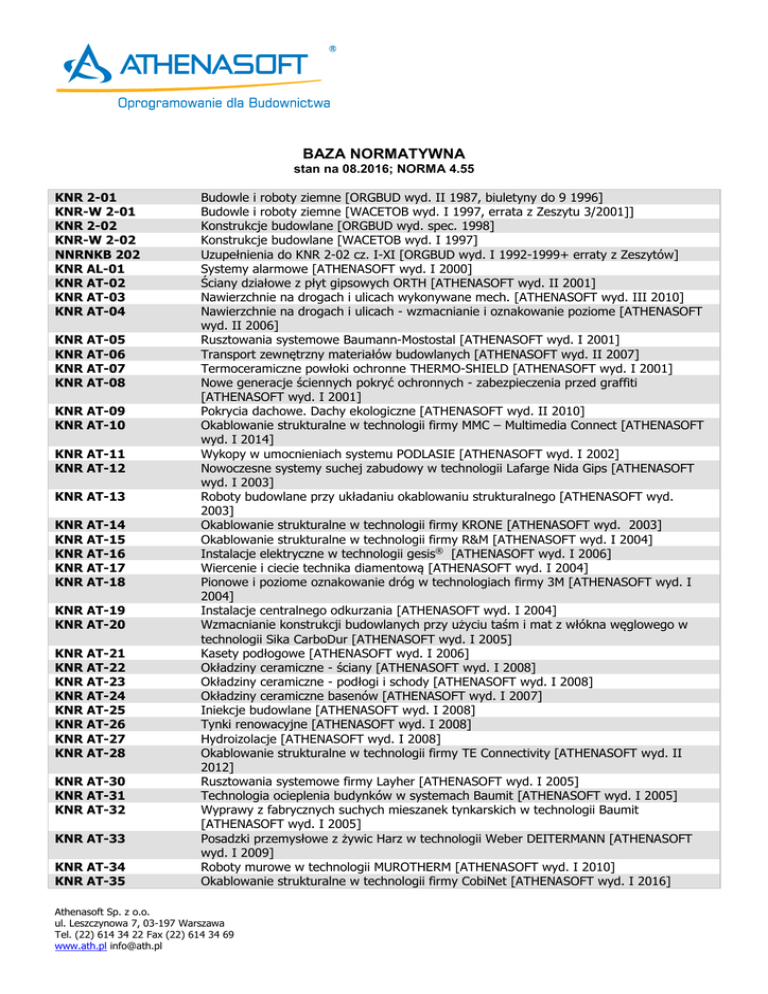 BAZA NORMATYWNA stan na 08.2016; NORMA 4.55 KNR 2-01 KNR-W 2-01 KNR 2-02 KNR-W 2-02 NNRNKB 202 KNR AL-01 KNR AT-02 KNR AT-03 KNR AT-04 KNR AT-05 KNR AT-06 KNR AT-07 KNR AT-08 KNR AT-09 KNR AT-10 KNR AT-11 KNR AT-12 KNR AT-13 KNR AT-14 KNR AT-15 KNR AT-16 KNR AT-17 KNR AT-18 KNR AT-19 KNR AT-20 KNR AT-21 KNR AT-22 KNR AT-23 KNR AT-24 KNR AT-25 KNR AT-26 KNR AT-27 KNR AT-28 KNR AT-30 KNR AT-31 KNR AT-32 KNR AT-33 KNR AT-34 KNR AT-35 Budowle i roboty ziemne [ORGBUD wyd. II 1987, biuletyny do 9 1996] Budowle i roboty ziemne [WACETOB wyd. I 1997, errata z Zeszytu 3/2001]] Konstrukcje budowlane [ORGBUD wyd. spec. 1998] Konstrukcje budowlane [WACETOB wyd. I 1997] Uzupełnienia do KNR 2-02 cz. I-XI [ORGBUD wyd. I 1992-1999+ erraty z Zeszytów] Systemy alarmowe [ATHENASOFT wyd. I 2000] Ściany działowe z płyt gipsowych ORTH [ATHENASOFT wyd. II 2001] Nawierzchnie na drogach i ulicach wykonywane mech. [ATHENASOFT wyd. III 2010] Nawierzchnie na drogach i ulicach - wzmacnianie i oznakowanie poziome [ATHENASOFT wyd. II 2006] Rusztowania systemowe Baumann-Mostostal [ATHENASOFT wyd. I 2001] Transport zewnętrzny materiałów budowlanych [ATHENASOFT wyd. II 2007] Termoceramiczne powłoki ochronne THERMO-SHIELD [ATHENASOFT wyd. I 2001] Nowe generacje ściennych pokryć ochronnych - zabezpieczenia przed graffiti [ATHENASOFT wyd. I 2001] Pokrycia dachowe. Dachy ekologiczne [ATHENASOFT wyd. II 2010] Okablowanie strukturalne w technologii firmy MMC – Multimedia Connect [ATHENASOFT wyd. I 2014] Wykopy w umocnieniach systemu PODLASIE [ATHENASOFT wyd. I 2002] Nowoczesne systemy suchej zabudowy w technologii Lafarge Nida Gips [ATHENASOFT wyd. I 2003] Roboty budowlane przy układaniu okablowaniu strukturalnego [ATHENASOFT wyd. 2003] Okablowanie strukturalne w technologii firmy KRONE [ATHENASOFT wyd. 2003] Okablowanie strukturalne w technologii firmy R&M [ATHENASOFT wyd. I 2004] Instalacje elektryczne w technologii gesis® [ATHENASOFT wyd. I 2006] Wiercenie i ciecie technika diamentową [ATHENASOFT wyd. I 2004] Pionowe i poziome oznakowanie dróg w technologiach firmy 3M [ATHENASOFT wyd. I 2004] Instalacje centralnego odkurzania [ATHENASOFT wyd. I 2004] Wzmacnianie konstrukcji budowlanych przy użyciu taśm i mat z włókna węglowego w technologii Sika CarboDur [ATHENASOFT wyd. I 2005] Kasety podłogowe [ATHENASOFT wyd. I 2006] Okładziny ceramiczne - ściany [ATHENASOFT wyd. I 2008] Okładziny ceramiczne - podłogi i schody [ATHENASOFT wyd. I 2008] Okładziny ceramiczne basenów [ATHENASOFT wyd. I 2007] Iniekcje budowlane [ATHENASOFT wyd. I 2008] Tynki renowacyjne [ATHENASOFT wyd. I 2008] Hydroizolacje [ATHENASOFT wyd. I 2008] Okablowanie strukturalne w technologii firmy TE Connectivity [ATHENASOFT wyd. II 2012] Rusztowania systemowe firmy Layher [ATHENASOFT wyd. I 2005] Technologia ocieplenia budynków w systemach Baumit [ATHENASOFT wyd. I 2005] Wyprawy z fabrycznych suchych mieszanek tynkarskich w technologii Baumit [ATHENASOFT wyd. I 2005] Posadzki przemysłowe z żywic Harz w technologii Weber DEITERMANN [ATHENASOFT wyd. I 2009] Roboty murowe w technologii MUROTHERM [ATHENASOFT wyd. I 2010] Okablowanie strukturalne w technologii firmy CobiNet [ATHENASOFT wyd. I 2016] Athenasoft Sp. z o.o. ul. Leszczynowa 7, 03-197 Warszawa Tel. (22) 614 34 22 Fax (22) 614 34 69 www.ath.pl [email protected] KNR AT-36 KNR AT-37 KNR AT-40 KNR AT-41 KNR AT-42 KNR AT-43 KNR AT-44 KNR AT-45 KNR AT-46 KNR AT-99 KNR W-01 KNR W-02 KNR 0-10 KNR 0-11 KNR 0-12 KNR 0-12II KNR 0-13 KNR 0-14 KNR 0-15 KNR 0-15II KNR 0-16 KNR 0-17 KNR 0-18 KNR 0-19 KNR 0-20 KNR 0-21 KNR 0-22 KNR 0-23 KNR 0-24 KNR 0-25 KNR 0-26 KNR 0-27 KNR 0-28 KNR 0-29 KNR 0-30 KNR 0-31 KNR 0-32 KNR 0-33 KNR 0-34 KNR 0-35 Iniekcje ciśnieniowe w konstrukcji oraz w gruncie [ATHENASOFT wyd. I 2016] Okablowanie strukturalne w technologii firmy Excel Networking [ATHENASOFT wyd. I 2016] Hydroizolacje i renowacje budynków w technologii Weber DEITERMANN [ATHENASOFT wyd. I 2010] Posadzki przemysłowe z cementowych zapraw samopoziomujących Weber DEITERMANN [ATHENASOFT wyd. I 2010] Okładziny ceramiczne w technologii Weber DEITERMANN [ATHENASOFT wyd. I 2010] Systemy suchej zabudowy w technologii RIGIPS [ATHENASOFT wyd. I 2011 + AT-43a 2014] Stropy w technologii KONBET [ATHENASOFT wyd. I 2012] Systemy kominowe SCHIEDEL [ATHENASOFT wyd. I 2014] Ściany działowe z bloczków gipsowych RIGIPS RIGIROC [ATHENASOFT wyd. I 2013] Roboty budowlane różne; Rozdział 01 Wzmacnianie betonowych ścian trójwarstwowych kotwami EJOT WSS; Rozdział 02 Tynki i wylewki perlitowe [ATHENASOFT wyd. I 20132015] Cementowe podkłady i posadzki w technologii WEBER [Saint-Gobain wyd. I 2013] Okładziny ceramiczne w technologii WEBER [Saint-Gobain wyd. I 2012] Zewnętrzne sieci ciepłownicze z rur preizolowanych [IGM wyd. I 1995] Nakłady na wykonanie nawierzchni z kostki brukowej "POLBRUK" [IGM wyd. II 2001] Układanie płytek z kamieni sztucznych na klej [IGM wyd. I 1996] Układanie płytek z kamieni sztucznych na klej [IGM wyd. III 2000] Instalacje wewnętrzne wodociągowe i kanalizacyjne z tworzyw sztucznych [IGM wyd. I 1996] Roboty z gipsu i prefabrykatów gipsowych [IGM wyd. I 1996] Pokrycia dachowe [IGM wyd. I 1996] Pokrycia dachowe wyd. III 1997 [IGM wyd. II 1997] Roboty murowe w technologii "YTONG" [IGM wyd. I 1997] System ocieplania ścian zewnętrznych budynków "CERESIT" [IGM wyd. I 1998] Okładziny ścian zewnętrznych z paneli [IGM wyd. I 1998] Stolarka - PCV, aluminium [IGM wyd. I 1998] Konstrukcje betonowe i żelbetowe monolityczne w deskowaniu "PERI" [IGM wyd. I 1998] Domy drewniane w technologii kanadyjskiej [IGM wyd. I 1998] Pokrycia dachowe z papy zgrzewalnej w technologii DKD [IGM wyd. I 1998] Systemy ocieplenia ścian zewnętrznych budynków ATLAS STOPTER, ATLAS ROKER [IGM wyd. I 1999] Ściany z płyt gipsowo-włóknowych FERMACELL [IGM wyd. I 1999] Roboty malarskie antykorozyjne i chemoodporne [IGM wyd. I 1999] System renowacji starego budownictwa wg technologii SCHOMBURG [IGM wyd. 