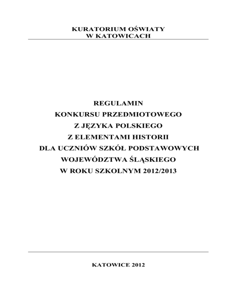 KURATORIUM OŚWIATY W KATOWICACH REGULAMIN KONKURSU PRZEDMIOTOWEGO Z JĘZYKA POLSKIEGO Z ELEMENTAMI HISTORII DLA UCZNIÓW SZKÓŁ PODSTAWOWYCH WOJEWÓDZTWA ŚLĄSKIEGO W ROKU SZKOLNYM 2012/2013 KATOWICE 2012 Wojewódzkie Konkursy Przedmiotowe dla uczniów szkół podstawowych i gimnazjów województwa śląskiego w roku szkolnym 2012/2013 REGULAMIN KONKURSU PRZEDMIOTOWEGO Z JĘZYKA POLSKIEGO Z ELEMENTAMI HISTORII DLA UCZNIÓW SZKÓŁ PODSTAWOWYCH WOJEWÓDZTWA ŚLĄSKIEGO W ROKU SZKOLNYM 2012/2013 I. PODSTAWA PRAWNA KONKURSU § 1. Śląski Kurator Oświaty, realizując zadanie określone w art. 31 ust. 1 pkt 7 ustawy z dnia 7 września 1991 roku o systemie oświaty (tj. Dz. U. z 2004 r. nr 256, poz. 2572 z późn. zm.), zgodnie z Rozporządzeniem Ministra Edukacji Narodowej i Sportu z dnia 29 stycznia 2002 roku w sprawie organizacji oraz sposobu przeprowadzania konkursów, turniejów i olimpiad (Dz. U. z 2002 r. nr 13, poz.125 z późn. zm.), organizuje Wojewódzki Konkurs Przedmiotowy z Języka Polskiego z Elementami Historii dla uczniów szkół podstawowych z terenu województwa śląskiego w roku szkolnym 2012/2013. II. ORGANIZACJA WOJEWÓDZKIEGO KONKURSU PRZEDMIOTOWEGO Z JĘZYKA POLSKIEGO Z ELEMENTAMI HISTORII DLA UCZNIÓW SZKÓŁ PODSTAWOWYCH WOJEWÓDZTWA ŚLĄSKIEGO W ROKU SZKOLNYM 2012/2013 § 2. Za organizację Wojewódzkiego Konkursu Przedmiotowego z Języka Polskiego z Elementami Historii dla uczniów szkół podstawowych woj. śląskiego w roku szkolnym 2012/2013 odpowiada Kuratorium Oświaty w Katowicach oraz – w zakresie ustalonym w odrębnej umowie – Dyrektor Regionalnego Ośrodka Doskonalenia „WOM” w Częstochowie, 42-202 Częstochowa, al. Jana Pawła II 126/130. § 3. Etapy Konkursu 1. Ustala się trzy etapy Konkursu: 1) etap szkolny, 2) etap rejonowy, 3) etap wojewódzki. § 4. Cele organizacji Konkursu 1. Rozwijanie humanistycznych zainteresowań uczniów szkół podstawowych. 2. Wdrażanie do samokształcenia i podejmowania odpowiedzialności za własny rozwój. 3. Stwarzanie uczestnikom Konkursu możliwości prezentacji uzdolnień i samorealizacji. 4. Kształtowanie postawy szacunku wobec kultury światowej i historii własnego narodu. 5. Promowanie uzdolnionych uczniów oraz nauczycieli osiągających wysokie wyniki w pracy z utalentowanymi wychowankami. Kuratorium Oświaty w Katowicach 2 Wojewódzkie Konkursy Przedmiotowe dla uczniów szkół podstawowych i gimnazjów województwa śląskiego w roku szkolnym 2012/2013 § 5. Zgłaszanie uczniów do udziału w Konkursie 1. Zgłoszenia szkoły do udziału w Konkursie dokonuje Dyrektor szkoły za pomocą arkusza zgłoszeniowego on-line, dostępnego na stronie internetowej: https://sites.google.com/a/wombb.edu.pl/wojewodzkie-konkursy-przedmiotowe/ 2. Link do powyższej strony zostanie zamieszczony na stronie internetowej organizatorów wymienionych w § 2 niniejszego Regulaminu, tj. RODN „WOM” w Częstochowie: www.womczest.edu.pl oraz Kuratorium Oświaty w Katowicach: www.kuratorium.katowice.pl 3. Zgłoszenie szkoły podstawowej do jednego lub dwóch konkursów odbywa się przez wypełnienie i wysłanie tylko jednego formularza on- line. 4. W celu zgłoszenia szkoły do Konkursu należy wykonać następujące czynności: 1) wejść na stronę https://sites.google.com/a/wombb.edu.pl/wojewodzkie-konkursyprzedmiotowe/, 2) otworzyć formularz on-line, wybierając odpowiedni dla Konkursu link, 3) wypełnić formularz – wymagane jest wypełnienie wszystkich pól wg podanych w formularzu wzorów, 4) w przedostatnim polu formularza wskazać, którego konkursu/konkursów dotyczy zgłoszenie (przy każdym konkursie konieczne jest dokonanie wyboru opcji TAK albo NIE), 5) w ostatnim polu wpisać kod autoryzacji, który zostanie przesłany do szkół pocztą elektroniczną z Wydziału Nadzoru nad Przedszkolami, Szkołami i Placówkami oraz Delegatur Kuratorium Oświaty w Katowicach, 6) wysłać formularz, wybierając przycisk: „prześlij”. 5. Zgłoszenia należy dokonać w nieprzekraczalnym terminie do dnia 5 października 2012 r. 6. Lista szkół zakwalifikowanych do udziału w Konkursach będzie dostępna na stronie internetowej placówki doskonalenia nauczycieli, o której mowa w ust. 2. Dyrektor szkoły jest zobowiązany do sprawdzenia, czy zgłoszona przez niego szkoła znajduje się w wykazie szkół zakwalifikowanych do udziału w Konkursie Przedmiotowym z Języka Polskiego z Elementami Historii oraz ewentualnego wyjaśnienia wątpliwości z koordynatorem konkursów w odpowiedniej placówce doskonalenia nauczycieli w terminie od 8 października 2012 r. do 12 października 2012 r. 7. Po upływie powyższego terminu listy szkół zostają ostatecznie zamknięte, dalsze zgłoszenia nie będą przyjmowane. 8. W przypadku, gdy w szkole, do której uczęszcza uczeń, nie organizuje się Konkursu, uczeń może do niego przystąpić w szkole wskazanej przez dyrektora szkoły. Kuratorium Oświaty w Katowicach 3 Wojewódzkie Konkursy Przedmiotowe dla uczniów szkół podstawowych i gimnazjów województwa śląskiego w roku szkolnym 2012/2013 § 6. Zakresy wiedzy i umiejętności oraz proponowanej bibliografii na poszczególne etapy Konkursu 1. 2. Wojewódzki Konkurs Przedmiotowy z Języka Polskiego z Elementami Historii dla uczniów szkół podstawowych obejmuje i poszerza treści podstawy programowej ww. przedmiotu. Szczegółowy zakres wiedzy i umiejętności wymagany na poszczególnych etapach Konkursu oraz wykaz proponowanych lektur zawiera ZAŁĄCZNIK NR 1 do niniejszego Regulaminu. § 7. Kryteria kwalifikacji uczestników Konkursu 1. Kryteria kwalifikacji uczestników Konkursu do poszczególnych etapów: 1) do I etapu – szkolnego przystępują uczniowie na zasadzie dobrowolności, 2) do II etapu – rejonowego kwalifikują się uczniowie - zwani dalej uczestnikami Konkursu, którzy w etapie szkolnym uzyskają co najmniej 80% punktów możliwych do zdobycia, 3) do III etapu – wojewódzkiego kwalifikują się 