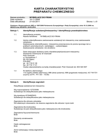 KARTA CHARAKTERYSTYKI PREPARATU CHEMICZNEGO Nazwa produktu: Data wydania: Data aktualizacji: WYBIELACZ DO FIRAN 10-11-2009 21-03-2011 Strona 1 z 9 Podstawa: Rozporządzenie (WE) nr 1907/2006 Parlamentu Europejskiego i Rady Europejskiej z dnia 18.12.2006 ws. REACH oraz 453/2010 z 20.05.2010. Sekcja 1. Identyfikacja substancji/mieszaniny i identyfikacja przedsiębiorstwa 1.1. Identyfikacja produktu Nazwa handlowa: WYBIELACZ DO FIRAN 1.2. Istotne zidentyfikowane zastosowanie substancji lub mieszaniny oraz zastosowanie odradzane Zastosowanie zidentyfikowane: mieszanina przeznaczona do prania ręcznego lub w pralkach automatycznych, wybielająco – usztywniająca Zastosowanie odradzane: nie określono 1.3. Dane dotyczące dostawcy karty charakterystyki/producent mieszaniny Wytwórnia Chemiczna 'dr Granosik' Piotr Granosik ul. Konwaliowa 7 95-100 Zgierz POLSKA tel. 42 719 01 39 fax. 42 716 17 21 Osoba odpowiedzialna za kartę charakterystyki: Piotr Granosik tel. 603 924 907 1.4 Nr telefonu alarmowego: 112 (ogólny telefon alarmowy); 998 (straż pożarna); 999 (pogotowie medyczne); 42 7161721 (czynny od Pn - Pt 7.00 – 15.00) Sekcja 2. Identyfikacja zagrożeń Klasyfikacja substancji lub mieszaniny Wg rozporządzenia 1272/2008: Substancja nie sklasyfikowana jako niebezpieczna Wg dyrektywy 67/548/EWG: Substancja nie sklasyfikowana jako niebezpieczna Zagrożenia dla zdrowia człowieka: We właściwym stosowaniu nie stwarza zagrożenia dla zdrowia i życia ludzi Zagrożenia dla środowiska: Substancja nie jest sklasyfikowana jako niebezpieczna dla środowiska Zagrożenia fizyczne/chemiczne: Brak Elementy oznakowania: Brak Hasło ostrzegawcze: Brak Zwrot wskazujący rodzaj zagrożenia: Brak KARTA CHARAKTERYSTYKI PREPARATU CHEMICZNEGO Nazwa produktu: Data wydania: Data aktualizacji: WYBIELACZ DO FIRAN 10-11-2009 21-03-2011 Strona 2 z 9 Zwroty określające warunki bezpiecznego stosowania: Brak Inne zagrożenia: Brak innych zagrożeń. Brak informacji na temat spełnienia kryteriów PBT lub vPvB zgodnie z załącznikiem XIII rozporządzenia REACH. Odpowiednie badania nie były przeprowadzone Sekcja 3. Skład / informacje o składnikach Substancje: Nie dotyczy Mieszaniny: 1. Nazwa produktu: CHLOREK SODU Numer CAS: 7647-14-5 Numer WE(EINECS): 231-598-3 2. Nazwa produktu: POCHODNA KWASU DIAMINOSTLBENODISULFONOWEGO Składniki nie są sklasyfikowane jako niebezpieczne Sekcja 4. Środki pierwszej pomocy 4.1. Zalecenia ogólne: Jak najszybciej przerwać ekspozycję na działanie preparatu – zdjąć zanieczyszczone ubranie, opróżnić jamę ustną. W przypadku narażenia na działanie preparatu, jeżeli nie występują niepokojące objawy nie jest wymagana natychmiastowa pomoc medyczna. 4.2. Narażenie inhalacyjne: W razie wystąpienia zawrotów lub nudności natychmiast zapewnić dostęp świeżego powietrza wyprowadzając poszkodowanego na zewnątrz. W przypadku wystąpienia dolegliwości skorzystać z pomocy lekarskiej. 4.3. Kontakt ze skórą: Zmyć skórę wodą z użyciem mydła, spłukać dokładnie czystą wodą. W przypadku wystąpienia objawów podrażnienia skontaktować się z lekarzem. 4.3. Kontakt z oczami: Upewnić się czy poszkodowany nie nosi szkieł kontaktowych. Natychmiast przemyć oczy dużą ilością czystej bieżącej wody przez ok. 15 minut, unikając zbyt silnego jej strumienia ze względu na możliwość uszkodzenia rogówki. Jeżeli wystąpią podrażnienia zwrócić się do lekarza. 4.4. Spożycie: Wypłukać usta czystą wodą, następnie podać czystą wodę do wypicia. Nie powodować wymiotów. Skontaktować się z lekarzem. KARTA CHARAKTERYSTYKI PREPARATU CHEMICZNEGO Nazwa produktu: Data wydania: Data aktualizacji: Sekcja 5. WYBIELACZ DO FIRAN 10-11-2009 21-03-2011 Strona 3 z 9 Postępowanie w przypadku pożaru 5.1. Środki gaśnicze zalecane: Woda, gaśnica śniegowa, pianowa lub proszkowa. 5.2. Środki gaśnicze nieodpowiednie: Do gaszenia pożarów nadają się wszystkie powszechnie stosowane środki. 5.3. Produkty spalania: Tlenki węgla, azotu i siarki. 5.4. Informacje dodatkowe: Nie dopuszczać do przedostawania się środków gaśniczych i innych materiałów do wód gruntowych. Pojemniki znajdujące się w strefie pożaru chłodzić rozproszonym strumieniem wody, o ile to możliwe usunąć je ze strefy zagrożenia. W przypadku pożaru w zamkniętym pomieszczeniu należy stosować odzież ochronną i aparat oddechowy na sprężone powietrze. Sekcja 6. Postępowanie w przypadku niezamierzonego uwolnienia do środowiska Indywidualne środki ostrożności, wyposażenie ochronne i procedury w sytuacjach awaryjnych: Dla osób nienależących do personelu udzielającego pomocy: zawiadomić o awarii odpowiednie służby. Usunąć z obszaru zagrożenia osoby niebiorące udziału w likwidacji awarii. Dla osób udzielających pomocy: Zadbać o odpowiednią wentylację, stosować indywidualne środki ochrony. Zapobiegać powstawaniu pyłu. Nie wdychać pyłu. Środki ostrożności w zakresie ochrony środowiska: Zapobiegać rozprzestrzenianiu się i usuwać poprzez zebranie mechaniczne do odpowiednio oznakowanych pojemników w celu utylizacji zgodnie z obowiązującymi przepisami. Odniesienia do innych sekcji: Postępowanie z odpadami – patrz sekcja 13 karty. Środki ochrony indywidualnej – patrz sekcja 8 karty. Sekcja 7. Postępowanie z substancjami i mieszaninami oraz ich magazynowanie Środki ostrożności dotyczące bezpiecznego postępowania: Zastosować odpowiednią wentylację. Unikać kontaktu z oczami. Unikać przedłużonego lub powtarzającego się kontaktu ze skórą. Unikać rozsypywania i powstawania pyłu. Pracować zgodnie z zasadami bezpieczeństwa i higieny: nie spożywać pokarmów i napojów, nie palić w miejscu pracy, myć ręce po użyciu, zdjąć zanieczyszczoną odzież i sprzęt ochronny przed wejściem do miejsc przeznaczonych do spożywania posiłków. Warunki bezpiecznego magazynowania łącznie z informacjami dotyczącymi wszelkich wzajemny