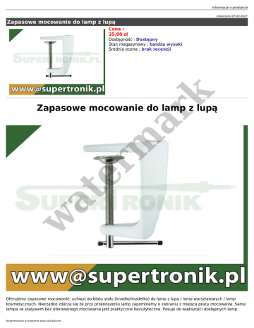 Informacje o produkcie Utworzono 07-03-2017 Zapasowe mocowanie do lamp z lupą Cena : 35,00 zł er m ar k Dostępność : Dostępny Stan magazynowy : bardzo wysoki Średnia ocena : brak recenzji w at Zapasowe mocowanie do lamp z lupą Oferujemy zapasowe mocowanie, uchwyt do blatu stołu (imadło/imadełko) do lamp z lupą / lamp warsztatowych / lamp kosmetycznych. Nierzadko zdarza się że przy przenoszeniu lamp zapominamy o zabraniu z miejsca pracy mocowania. Sama lampa ze statywem bez oferowanego mocowania jest praktycznie bezużyteczna. Pasuje do większości dostępnych lamp Wygenerowano w programie www.oscGold.com dostępnych na rynku. Standardowa szerokość otworu na trzpień lampy wynosi 13mm (1,3cm) i jest to najważniejszy parametr jaki należy wsiąść pod uwagę przy doborze wychwytu do posiadanej lampy. dane techniczne: ● ● ● ● ● ● ● zapasowe mocowanie uchwyt imadło średnica otoru na trzpień lampy: 13mm maksymalne rozwarcie szczęk: 65mm (maksymalna grubość blatu) sposób mocowania: do blatu stołu wykonanie: metalowy uchwyt kolor: biały waga: 0,31kg ● do lamp z lupą do lamp warsztatowych lamp kosmetycznych at ● w ● er m ar k zastosowanie: