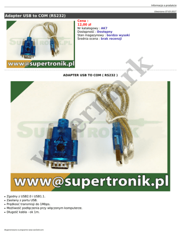 Informacje o produkcie Utworzono 07-03-2017 Adapter USB to COM (RS232) Cena : 12,00 zł er m ar k Nr katalogowy : AK7 Dostępność : Dostępny Stan magazynowy : bardzo wysoki Średnia ocena : brak recenzji w at ADAPTER USB TO COM ( RS232 ) ● ● ● ● ● Zgodny z USB2.0 i USB1.1. Zasilany z portu USB. Prędkosć transmisji do 1Mbps. Możliwość podłączenia przy włączonym komputerze. Długość kabla - ok 1m. Wygenerowano w programie www.oscGold.com er m ar k at w