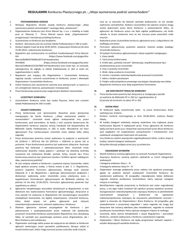 REGULAMIN Konkursu Plastycznego pt.: „Moja wymarzona podróż samochodem” I. 1. 2. 3. 4. 5. 6. 7. 8. 9. POSTANOWIENIA OGÓLNE Niniejszy Regulamin określa zasady konkursu plastycznego „Moja wymarzona podróż samochodem” zwanego dalej „Konkursem”. Organizatorem Konkursu jest firma Marvel Sp. z o.o. z siedzibą w Łodzi przy ul. Żelaznej 7. Firma Marvel zwana dalej „Organizatorem” przygotowuje i koordynuje przebieg Konkursu. Uczestnictwo w Konkursie jest bezpłatne. Konkurs skierowany jest do uczniów Szkoły Podstawowej nr 202 w Łodzi. Konkurs będzie trwał od dnia 20.05.2015r. (rozpoczęcie Konkursu) do dnia 15.06.2015r. (zakończenie Konkursu) Regulamin jest zamieszczony na profilach Facebookowych firmy Marvel: KIA (https://www.facebook.com/pages/KiaMarvel/828933740481267?ref=bookmarks) HYUNDAI (https://www.facebook.com/pages/HyundaiMarvel/1496461237267082?ref=bookmarks) oraz może być, na wniosek, udostępniony do wglądu w Szkole Podstawowej nr 202 w Łodzi (ul. Jugosłowiańska 2, Łódź). Regulamin jest wiążący dla Organizatora i Uczestników Konkursu, reguluje zasady i warunki uczestnictwa w Konkursie, prawa i obowiązki Organizatora i Uczestników Konkursu. Celem Konkursu jest wyróżnienie autorów prac plastycznych, w oparciu o ich umiejętności twórcze, pomysłowość i kreatywność. Prace Konkursowe powinny być oryginalnymi dziełami Uczestników. I. 1. UCZESTNICY KONKURSU Uczestnikiem Konkursu może być osoba fizyczna, która jest uczniem Szkoły Podstawowej Nr 202 w Łodzi. II. 1. ZASADY KONKURSU Pracą konkursową jest opracowanie dowolnej pracy plastycznej nawiązującej do tytułu Konkursu „„Moja wymarzona podróż – samochodem”. Uczestnik może zgłosić maksymalnie trzy prace konkursowe, pod warunkiem, że każda z nich zostanie dostarczona do Organizatora konkursu poprzez stronę Facebook lub bezpośrednio do Biblioteki Szkoły Podstawowej nr 202 w Łodzi. Niezależnie od ilości zgłoszonych Prac konkursowych Uczestnik może zdobyć tylko jedną nagrodę. Prace konkursowe powinny zostać wykonane na papierze o wymiarach A4 (210mm × 297mm) lub A3 (297mm × 420mm) w pionie lub w poziomie. Prace konkursowe powinny być wykonane odręcznie. Ilustracje powinny być kolorowe z zakomponowanym tłem. Uczestnik może wykorzystać dowolny rodzaj papieru i posłużyć się dowolną techniką rysowania lub malowania (kredki, pastele, farby, mazaki itp.) Praca konkursowa powinna być opatrzona tytułem i krótkim opisem oddającym ideę „wymarzonej podróży”. W celu wzięcia udziału w Konkursie i uzyskania statusu Uczestnika, rodzic bądź opiekun prawny osoby, o której mowa w pkt. II. 1. Regulaminu, powinni wypełnić Formularz zgłoszeniowy, którego wzór stanowi Załącznik nr 1 do Regulaminu i opatrując własnoręcznym podpisem i dostarczyć wykonaną przez Uczestnika pracę plastyczną wraz z wypełnionym Formularzem zgłoszeniowym do Biblioteki szkolnej nie później niż do dnia 15.06.2015r. Formularz zgłoszeniowy powinien być wypełniony w całości. Zgłoszenie niespełniające warunków określonych w Regulaminie, w tym dokonane bez wykorzystania Formularza zgłoszeniowego, doręczone w inny sposób niż wskazany w Regulaminie lub niezawierające wszystkich niezbędnych elementów, nie będzie rozpatrywane. Uczestnik konkursu, który złożył więcej niż jedno zgłoszenie pod różnymi nazwiskami/pseudonimami, zostanie wykluczony z Konkursu. Złożenie zgłoszenia stanowi przystąpienie do Konkursu i jest jednoznaczne z zaakceptowaniem przez rodziców lub opiekunów prawnych Uczestnika Konkursu postanowień Regulaminu oraz akceptacją faktu, że werdykt jury powołanego zarówno przez Organizatora, jak i Biuro Konkursu jest ostateczny. Organizator zastrzega sobie prawo do wyłączenia od udziału w Konkursie zgłoszeń zawierające prace uprzednio publikowane, biorące udział w innych konkursach, które mogą naruszać prawa autorskie osób trzecich 2. 3. 4. 5. 6. 7. 8. 9. oraz te, w stosunku do których zachodzi podejrzenie, że nie zostały wykonane samodzielnie. Rodzice Uczestników lub opiekun prawny mogą zostać poproszeni przez Biuro Konkursu o potwierdzenie faktu, że zgłoszona do Konkursu praca nie była nigdzie publikowana, nie brała udziału w innym konkursie oraz że nie narusza praw autorskich osób trzecich. Nadesłane przez Uczestników konkursu zgłoszenia wraz z załącznikami nie podlegają zwrotowi. Formularz zgłoszeniowy powinien zawierać również podpis każdego Uczestnika konkursu. W każdym Formularzu zgłoszeniowym należy wypełnić następująco: 1. Klasa (wiek) 2. Tytuł pracy konkursowej 3. Krótki opis „podróży marzeń” (destynacja, współtowarzysze itp.) przedstawionej przez Uczestnika 4. Imię i nazwisko Uczestnika 5. Wiek i datę urodzenia Uczestnika 6. Imiona i nazwiska rodziców/opiekunów prawnych Uczestnika 7. Adres z kodem pocztowym 8. Podpis rodzica/opiekuna prawnego wyrażające akceptację warunków Regulaminu Konkursu oraz datę wypełnienia Formularza. III. 1. JAK DOSTARCZYĆ PRACĘ NA KONKURS? Prace konkursowe powinny być doręczone w następujący sposób: a) osobiście do Biblioteki SP nr 202 (ul. Jugosłowiańska 2) b) pocztą lub kurierem na adres SP nr 202 IV. 1. OCENA PRAC W Konkursie będą uczestniczyły tylko te prace konkursowe, które spełniają ww. kryteria. Konkurs zostanie rozstrzygnięty w dniu 20.06.2015r. podczas Święta Szkoły. W każdej kategorii wiekowej zostaną wyłonione trzy najlepsze prace konkursowe (łącznie 9 najlepszych prac). Prace zgłoszone do Konkursu będą oceniane przez jury i ekspertów wyznaczonych przez Biuro Konkursu pod względem ich oryginalności, pomysłowości i kreatywności oraz osobistych umiejętności twórczych ich autorów. Jury Konkursu wyłoni zwycięzców nagród głównych (złoto, srebro, brąz) w każdej z dwóch kategorii wiekowych. Wszystkie decyzje podjęte przez jury są ostateczne. 2. 3. 4. 5. V. 1