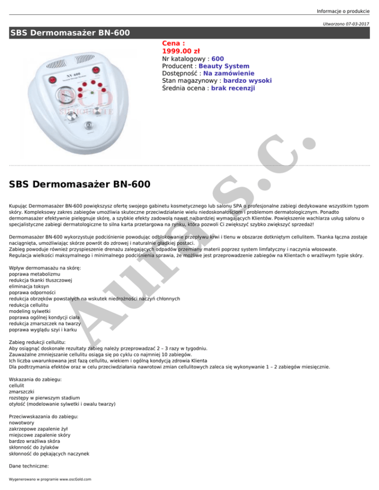 Informacje o produkcie Utworzono 07-03-2017 SBS Dermomasażer BN-600 Cena : 1999.00 zł SBS Dermomasażer BN-600 s. c. Nr katalogowy : 600 Producent : Beauty System Dostępność : Na zamówienie Stan magazynowy : bardzo wysoki Średnia ocena : brak recenzji Kupując Dermomasażer BN-600 powiększysz ofertę swojego gabinetu kosmetycznego lub salonu SPA o profesjonalne zabiegi dedykowane wszystkim typom skóry. Kompleksowy zakres zabiegów umożliwia skuteczne przeciwdziałanie wielu niedoskonałościom i problemom dermatologicznym. Ponadto dermomasażer efektywnie pielęgnuje skórę, a szybkie efekty zadowolą nawet najbardziej wymagających Klientów. Powiększenie wachlarza usług salonu o specjalistyczne zabiegi dermatologiczne to silna karta przetargowa na rynku, która pozwoli Ci zwiększyć szybko zwiększyć sprzedaż! Au r a Dermomasażer BN-600 wykorzystuje podciśnienie powodując odblokowanie przepływu krwi i tlenu w obszarze dotkniętym cellulitem. Tkanka łączna zostaje naciągnięta, umożliwiając skórze powrót do zdrowej i naturalnie gładkiej postaci. Zabieg powoduje również przyspieszenie drenażu zalegających odpadów przemiany materii poprzez system limfatyczny i naczynia włosowate. Regulacja wielkości maksymalnego i minimalnego podciśnienia sprawia, że możliwe jest przeprowadzenie zabiegów na Klientach o wrażliwym typie skóry. Wpływ dermomasażu na skórę: poprawa metabolizmu redukcja tkanki tłuszczowej eliminacja toksyn poprawa odporności redukcja obrzęków powstałych na wskutek niedrożności naczyń chłonnych redukcja cellulitu modeling sylwetki poprawa ogólnej kondycji ciała redukcja zmarszczek na twarzy poprawa wyglądu szyi i karku Zabieg redukcji cellulitu: Aby osiągnąć doskonałe rezultaty zabieg należy przeprowadzać 2 – 3 razy w tygodniu. Zauważalne zmniejszanie cellulitu osiąga się po cyklu co najmniej 10 zabiegów. Ich liczba uwarunkowana jest fazą cellulitu, wiekiem i ogólną kondycją zdrowia Klienta Dla podtrzymania efektów oraz w celu przeciwdziałania nawrotowi zmian cellulitowych zaleca się wykonywanie 1 – 2 zabiegów miesięcznie. Wskazania do zabiegu: cellulit zmarszczki rozstępy w pierwszym stadium otyłość (modelowanie sylwetki i owalu twarzy) Przeciwwskazania do zabiegu: nowotwory zakrzepowe zapalenie żył miejscowe zapalenie skóry bardzo wrażliwa skóra skłonność do żylaków skłonność do pękających naczynek Dane techniczne: Wygenerowano w programie www.oscGold.com Au r a s. c. moc pompy: 65cmHg zasilanie: 220V pobór mocy: 65W waga: 7kg wymiary urządzenia: 30x29x14.5 cm wymiary opakowania: 37x36x29 cm gwarancja: 2 lata