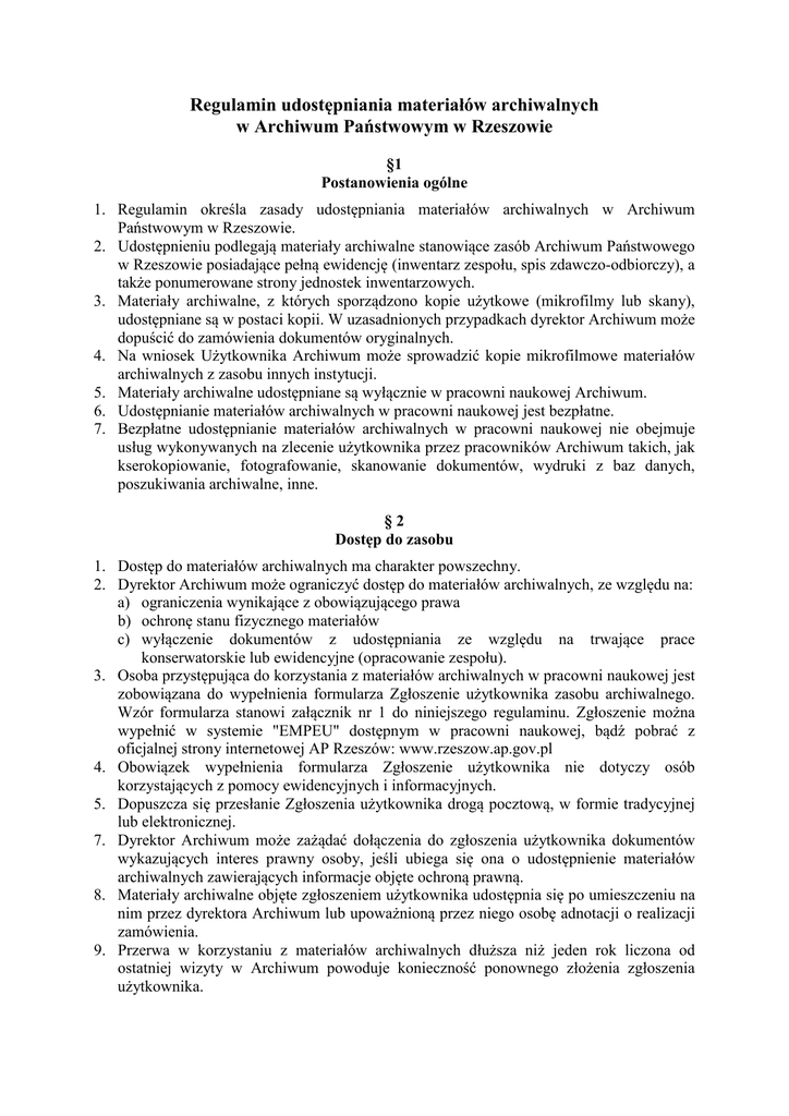 Regulamin udostępniania materiałów archiwalnych w Archiwum Państwowym w Rzeszowie §1 Postanowienia ogólne 1. Regulamin określa zasady udostępniania materiałów archiwalnych w Archiwum Państwowym w Rzeszowie. 2. Udostępnieniu podlegają materiały archiwalne stanowiące zasób Archiwum Państwowego w Rzeszowie posiadające pełną ewidencję (inwentarz zespołu, spis zdawczo-odbiorczy), a także ponumerowane strony jednostek inwentarzowych. 3. Materiały archiwalne, z których sporządzono kopie użytkowe (mikrofilmy lub skany), udostępniane są w postaci kopii. W uzasadnionych przypadkach dyrektor Archiwum może dopuścić do zamówienia dokumentów oryginalnych. 4. Na wniosek Użytkownika Archiwum może sprowadzić kopie mikrofilmowe materiałów archiwalnych z zasobu innych instytucji. 5. Materiały archiwalne udostępniane są wyłącznie w pracowni naukowej Archiwum. 6. Udostępnianie materiałów archiwalnych w pracowni naukowej jest bezpłatne. 7. Bezpłatne udostępnianie materiałów archiwalnych w pracowni naukowej nie obejmuje usług wykonywanych na zlecenie użytkownika przez pracowników Archiwum takich, jak kserokopiowanie, fotografowanie, skanowanie dokumentów, wydruki z baz danych, poszukiwania archiwalne, inne. §2 Dostęp do zasobu 1. Dostęp do materiałów archiwalnych ma charakter powszechny. 2. Dyrektor Archiwum może ograniczyć dostęp do materiałów archiwalnych, ze względu na: a) ograniczenia wynikające z obowiązującego prawa b) ochronę stanu fizycznego materiałów c) wyłączenie dokumentów z udostępniania ze względu na trwające prace konserwatorskie lub ewidencyjne (opracowanie zespołu). 3. Osoba przystępująca do korzystania z materiałów archiwalnych w pracowni naukowej jest zobowiązana do wypełnienia formularza Zgłoszenie użytkownika zasobu archiwalnego. Wzór formularza stanowi załącznik nr 1 do niniejszego regulaminu. Zgłoszenie można wypełnić w systemie "EMPEU" dostępnym w pracowni naukowej, bądź pobrać z oficjalnej strony internetowej AP Rzeszów: www.rzeszow.ap.gov.pl 4. Obowiązek wypełnienia formularza Zgłoszenie użytkownika nie dotyczy osób korzystających z pomocy ewidencyjnych i informacyjnych. 5. Dopuszcza się przesłanie Zgłoszenia użytkownika drogą pocztową, w formie tradycyjnej lub elektronicznej. 7. Dyrektor Archiwum może zażądać dołączenia do zgłoszenia użytkownika dokumentów wykazujących interes prawny osoby, jeśli ubiega się ona o udostępnienie materiałów archiwalnych zawierających informacje objęte ochroną prawną. 8. Materiały archiwalne objęte zgłoszeniem użytkownika udostępnia się po umieszczeniu na nim przez dyrektora Archiwum lub upoważnioną przez niego osobę adnotacji o realizacji zamówienia. 9. Przerwa w korzystaniu z materiałów archiwalnych dłuższa niż jeden rok liczona od ostatniej wizyty w Archiwum powoduje konieczność ponownego złożenia zgłoszenia użytkownika. §3 Zamawianie materiałów archiwalnych 1. Pracownicy archiwum państwowego odpowiedzialni za udostępnianie zasobu archiwalnego są obowiązani udzielać użytkownikom wyjaśnień dotyczących zasad udostępniania zasobu archiwalnego oraz informacji o środkach ewidencyjnych oraz innych archiwalnych pomocach informacyjno-wyszukiwawczych. Dyżurnemu i innym pracownikom pracującym w pracowni naukowej nie wolno odczytywać, tłumaczyć ani interpretować zapisów dokumentów archiwalnych. 2. Informacje o materiałach archiwalnych niezbędne do złożenia zamówień wyszukiwane są przez użytkowników zasobu samodzielnie na podstawie posiadanych przez archiwum środków informacyjnych. 3. Materiały archiwalne lub ich reprodukcje udostępniane są na podstawie zamówienia. Zamówienia wypełnia się w systemie komputerowym „EMPEU” dostępnym na stanowiskach w pracowni naukowej. 4. Dopuszcza się złożenie zamówienia pocztą tradycyjną lub elektroniczną w sposób podany na stronie internetowej Archiwum w zakładce dotyczącej udostępniania materiałów archiwalnych. 5. Zamówienie wysyłane pocztą musi zawierać imię i nazwisko użytkownika, numer zespołu, dokładne sygnatury zamawianych jednostek inwentarzowych. Brak tych informacji spowoduje odrzucenie zamówienia. 6. Archiwalia udostępnia się następnego dnia po złożeniu zamówienia. W szczególnych przypadkach zamówienia złożone do godz. 12.00 może być zrealizowane w dniu zgłoszenia. 7. Materiały archiwalne wymagające specjalnego przygotowania (np. paginacji) będą udostępniane nie później niż 3 dni od daty złożenia zamówienia. 8. Użytkownik może zamówić maksymalnie 15 jednostek archiwalnych na jeden dzień, zaś w odniesieniu do akt luźnych, kartografii, ikonografii, ksiąg ludności i ksiąg notarialnych liczba ta nie może przekraczać 5 jednostek archiwalnych. W uzasadnionych przypadkach liczba ta może być zwiększona. Decyzje w tej sprawie podejmuje dyżurny pracowni po uzgodnieniu z magazynem akt. §4 Korzystanie z materiałów archiwalnych 1. Zamówione materiały archiwalne wydawane są użytkownikowi przez dyżurnego pracowni naukowej. 2. Jednostki archiwalne szczególnie cenne udostępnia się użytkownikowi pojedynczo, pod stałym nadzorem obsługi pracowni naukowej. 3. W przypadku kiedy użytkownik przerywa pracę nad udostępnionymi mu archiwaliami i na krótki czas opuszcza pracownię naukową jest on zobowiązany do każdorazowego zgłoszenia tego u dyżurnego pracownika, 4. Po każdorazowym zakończeniu pracy korzystający z materiałów archiwalnych w pracowni naukowej zwraca je dyżurującemu pracownikowi, z dyspozycją ich zwrotu do magazynu lub zachowania w depozycie pracowni naukowej do dalszego korzystania. 5. Jeżeli przerwa w korzystaniu z akt znajdujących się w podręcznym depozycie przekroczy dwa tygodnie, są one zwracane do magazynu bez dyspozycji użytkownika. Podjęcie pracy nad nimi wymaga złożenia ponownego zamówienia. 6. Ze względu na wymogi bezpieczeństw