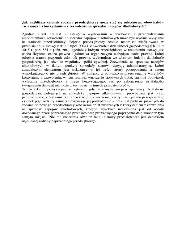 Jak najbliższy członek rodziny przedsiębiorcy może stać się sukcesorem obowiązków związanych z korzystaniem z zezwolenia na sprzedaż napojów alkoholowych? Zgodnie z art. 18 ust. 2 ustawy o wychowaniu w trzeźwości i przeciwdziałaniu alkoholizmowi, zezwolenie na sprzedaż napojów alkoholowych może być wydane wyłącznie na wniosek przedsiębiorcy. Pojęcie przedsiębiorcy zostało natomiast zdefiniowane w przepisie art. 4 ustawy z dnia 2 lipca 2004 r. o swobodzie działalności gospodarczej (Dz. U. z 2015 r, poz. 584 z późn. zm.), zgodnie z którym przedsiębiorcą w rozumieniu ustawy jest osoba fizyczna, osoba prawna i jednostka organizacyjna niebędąca osobą prawną, której odrębna ustawa przyznaje zdolność prawną, wykonująca we własnym imieniu działalność gospodarczą, jak również wspólnicy spółki cywilnej. Zezwolenie na sprzedaż napojów alkoholowych w danym punkcie sprzedaży stanowi decyzję administracyjną, której zasadniczym elementem jest wskazanie w jej treści strony postępowania, a zatem wnioskującego o nie przedsiębiorcy. W związku z powyższym przestrzeganie warunków korzystania z zezwolenia, w tym również wnoszenie stosownych opłat, stanowi obowiązek wyłącznie przedsiębiorcy z niego korzystającego, zaś po zakończeniu działalności (wygaszeniu decyzji) nie może przechodzić na innych przedsiębiorców. W związku z powyższym, w sytuacji, gdy w danym miejscu sprzedaży działalność gospodarcza, polegająca na sprzedaży napojów alkoholowych, prowadzona jest przez przedsiębiorcę, który zamierza zaprzestać jej prowadzenia, a w tym samym miejscu sprzedaży członek jego rodziny zamierza rozpocząć jej prowadzenie – brak jest podstaw prawnych do żądania od nowego przedsiębiorcy wnoszenia opłat związanych z korzystaniem z zezwolenia na sprzedaż napojów alkoholowych, których wysokość uzależniona jest od obrotu dokonanego przez poprzedniego przedsiębiorcę prowadzącego poprzednio działalność w tym samym miejscu. Nie ma znaczenia również fakt, iż nowy przedsiębiorca jest członkiem najbliższej rodziny poprzedniego przedsiębiorcy.