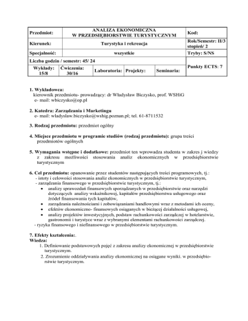 Przedmiot: ANALIZA EKONOMICZNA W PRZEDSIĘBIORSTWIE TURYSTYCZNYM Kierunek: Turystyka i rekreacja Specjalność: Kod: Rok/Semestr: II/3 stopień/ 2 Tryby: S/NS wszystkie Liczba godzin / semestr: 45/ 24 Wykłady: 15/8 Ćwiczenia: 30/16 Laboratoria: Projekty: Seminaria: Punkty ECTS: 7 1. Wykładowca: kierownik przedmiotu- prowadzący: dr Władysław Biczysko, prof. WSHiG e- mail: [email protected] 2. Katedra: Zarządzania i Marketingu e- mail: [email protected]; tel. 61-8711532 3. Rodzaj przedmiotu: przedmiot ogólny 4. Miejsce przedmiotu w programie studiów (rodzaj przedmiotu): grupa treści przedmiotów ogólnych 5. Wymagania wstępne i dodatkowe: przedmiot ten wprowadza studenta w zakres j wiedzy z zakresu możliwości stosowania analiz ekonomicznych w przedsiębiorstwie turystycznym 6. Cel przedmiotu: opanowanie przez studentów następujących treści programowych, tj.: - istoty i celowości stosowania analiz ekonomicznych w przedsiębiorstwie turystycznym, - zarządzania finansowego w przedsiębiorstwie turystycznym, tj.: analizy sprawozdań finansowych sporządzanych w przedsiębiorstwie oraz narzędzi dotyczących analizy wskaźnikowej, kapitałów przedsiębiorstwa usługowego oraz źródeł finansowania tych kapitałów, zarządzania należnościami i zobowiązaniami handlowymi wraz z metodami ich oceny, efektów ekonomiczno- finansowych osiąganych w bieżącej działalności usługowej, analizy projektów inwestycyjnych, podstaw rachunkowości zarządczej w hotelarstwie, gastronomii i turystyce wraz z wybranymi elementami rachunkowości zarządczej. - ryzyka finansowego i niefinansowego w przedsiębiorstwie turystycznym. 7. Efekty kształcenia:. Wiedza: 1. Definiowanie podstawowych pojęć z zakresu analizy ekonomicznej w przedsiębiorstwie turystycznym. 2. Zrozumienie oddziaływania analizy ekonomicznej na osiągane wyniki. w przedsiębiorstwie turystycznym. Umiejętności: 1. Dotyczące analizowania sytuacji gospodarczej przedsiębiorstwa turystycznego, stawiania pytań, dokonywania syntezy, wyciągania wniosków, krytycznej oceny, interpretacji danych statystycznych i wydarzeń gospodarczych, 2. Dotyczące podejmowania decyzji gospodarczych w oparciu o posiadany zakres informacji, wykorzystania metod badawczych, samokształcenia. Inne kompetencje (personalne i społeczne): 1. Wyrobienie zdolności do aktywnych postaw, przedsiębiorczości, samodzielności i krytycyzmu gospodarczego i niezależnego myślenia w przedsiębiorstwie turystycznym. 2. Uzmysłowienie studentom konieczności posiadania wiedzy z zakresu analiz ekonomicznych niezbędnych do zarządzania w przedsiębiorstwie turystycznym w warunkach istniejącej konkurencji rynkowej. 8. Metody dydaktyczne: Wykład, wykład z dyskusją (dyskusja dydaktyczna), ćwiczenia, zajęcia praktyczne, seminarium- kolokwia zaliczeniowe, egzamin pisemny/ustny. W ramach przedmiotu zwraca się szczególną uwagę na wszelkie formy angażujące i aktywizujące studenta w proces dydaktyczny. W szczególności są to prace w grupach otwartych bądź zamkniętych przy zastosowaniu zróżnicowanych danych wprowadzających a następnie będzie dokonywana prezentacja osiągniętych wyników wraz z ich oceną i wnioskowaniem. Wszelkie prace projektowo- ćwiczeniowe realizowane są oddzielnie przez każdego studenta z uwzględnieniem zróżnicowanych danych wejściowych, które posiadają element samodzielności, i podlegające ocenie przez wykładowcę. 9. Forma i warunki zaliczenia przedmiotu, a także formę i warunki zaliczenia poszczególnych form zajęć wchodzących w zakres danego przedmiotu: metody ocenykolokwium pisemne, zaliczenie projektu, egzamin pisemny a) Student w trakcie semestru : zalicza partie materiału w formie pisemnego kolokwium, złożonego z części teoretyczno- problemowej oraz części teoretyczno- praktycznej; przewiduje się 2 kolokwia; zobowiązany jest do sporządzenia projektu z zakresu analizy ekonomiczno- finansowej dowolnego podmiotu gospodarczego branży hotelarsko- gastronomicznej lub turystycznej; będzie oceniany w ramach ćwiczeń– prezentowanie dotychczas zdobytej wiedzy z przedmiotu oraz umiejętności praktycznych; b) Nie zaliczenie odpowiednich partii materiału (kolokwia) na ocenę pozytywną, umożliwia się studentowi poprawę tej oceny w okresie 1 miesiąca; c) Minimum ocen cząstkowych w semestrze ustala się na 3 oceny pod warunkiem obowiązkowego zaliczenia wszystkich kolokwiów i prac seminaryjnych; d) Podstawą zaliczenia przedmiotu jest uzyskanie minimum oceny dostatecznej; e) Skala ocen: niedostateczny – poniżej 61% treści nauczania według wymogów i oczekiwań; dostateczny – od 61%; wyższe oceny z + lub – odpowiednio co 5% w górę, np. ocena: dobry – od 81%; f) Student, w przypadku nieobecności usprawiedliwionych (praktyki krajowe i zagraniczne, zobowiązany jest do zaliczenia prac tematycznych oraz zdania zaległego przedmiotu w ustalonym czasie i w uzgodnieniu z prowadzącym zajęcia. Obowiązkiem wykładowcy jest udzielenie studentowi wszelkich wskazówek w zakresie dostępnej literatury oraz konsultacji w czasie pełnionych dyżurów. 10. Elementy składowe oceny końcowej: Kolokwium I- 25% Kolokwium II – 25% Egzamin pisemny/ ustny 50% Projekt – ocena oddzielna 11. Całkowity nakład pracy studenta potrzebny do osiągnięcia efektów w godzinach: Czas na lektury i przygotowanie się do zajęć- 20 Czas na przygotowanie się do 2 kolokwiów – 2 x 15 Czas na przygotowanie się do egzaminu- 20 Razem 70 godzin 12. Treści merytoryczne przedmiotu: 1. Istota, funkcje i rodzaje analizy ekonomicznej 2. Istota i kierunki wykorzystania analizy techniczno-ekonomicznej 3. Analiza porównawcza i przyczynowa w badaniach ekonomicznych. 4. Analiza wstępna sprawozdań finansowych (bilans, rachunek zysków i strat, cash flow). 5. Analiza wskaźnikowa. 6. Metody oceny przedsięwzięć inwestycyjnych. 7. Podstawy ekonomicznej analizy rynku. 8.. Ryzyko działalności gospodarczej 
