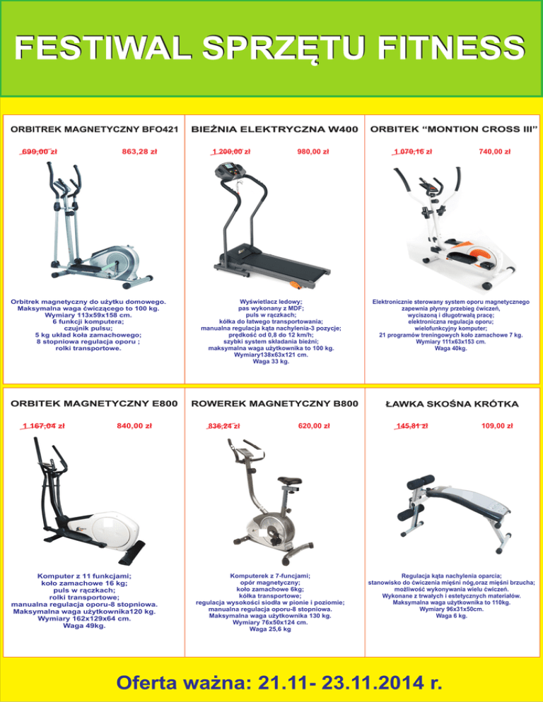 FESTIWAL SPRZÊTU FITNESS ORBITREK MAGNETYCZNY BFO421 699,00 z³ 863,28 z³ Orbitrek magnetyczny do u¿ytku domowego. Maksymalna waga æwicz¹cego to 100 kg. Wymiary 113x59x158 cm. 6 funkcji komputera; czujnik pulsu; 5 kg uk³ad ko³a zamachowego; 8 stopniowa regulacja oporu ; rolki transportowe. ORBITEK MAGNETYCZNY E800 1 167,04 z³ 840,00 z³ Komputer z 11 funkcjami; ko³o zamachowe 16 kg; puls w r¹czkach; rolki transportowe; manualna regulacja oporu-8 stopniowa. Maksymalna waga u¿ytkownika120 kg. Wymiary 162x129x64 cm. Waga 49kg. BIE¯NIA ELEKTRYCZNA W400 1 200,00 z³ 980,00 z³ Wyœwietlacz ledowy; pas wykonany z MDF; puls w r¹czkach; kó³ka do ³atwego transportowania; manualna regulacja k¹ta nachylenia-3 pozycje; prêdkoœæ od 0,8 do 12 km/h; szybki system sk³adania bie¿ni; maksymalna waga u¿ytkownika to 100 kg. Wymiary138x63x121 cm. Waga 33 kg. ROWEREK MAGNETYCZNY B800 836,24 z³ 620,00 z³ Komputerek z 7-funcjami; opór magnetyczny; ko³o zamachowe 6kg; kó³ka transportowe; regulacja wysokoœci siod³a w pionie i poziomie; manualna regulacja oporu-8 stopniowa. Maksymalna waga u¿ytkownika 130 kg. Wymiary 76x50x124 cm. Waga 25,6 kg ORBITEK “MONTION CROSS III” 1 070,16 z³ 740,00 z³ Elektronicznie sterowany system oporu magnetycznego zapewnia p³ynny przebieg æwiczeñ, wyciszon¹ i d³ugotrwa³¹ pracê; elektroniczna regulacja oporu; wielofunkcyjny komputer; 21 programów treningowych ko³o zamachowe 7 kg. Wymiary 111x63x153 cm. Waga 40kg. £AWKA SKOŒNA KRÓTKA 145,81 z³ 109,00 z³ Regulacja k¹ta nachylenia oparcia; stanowisko do æwiczenia miêœni nóg,oraz miêœni brzucha; mo¿liwoœæ wykonywania wielu æwiczeñ. Wykonane z trwa³ych i estetycznych materia³ów. Maksymalna waga u¿ytkownika to 110kg. Wymiary 96x31x50cm. Waga 6 kg. Oferta wa¿na: 21.11- 23.11.2014 r.