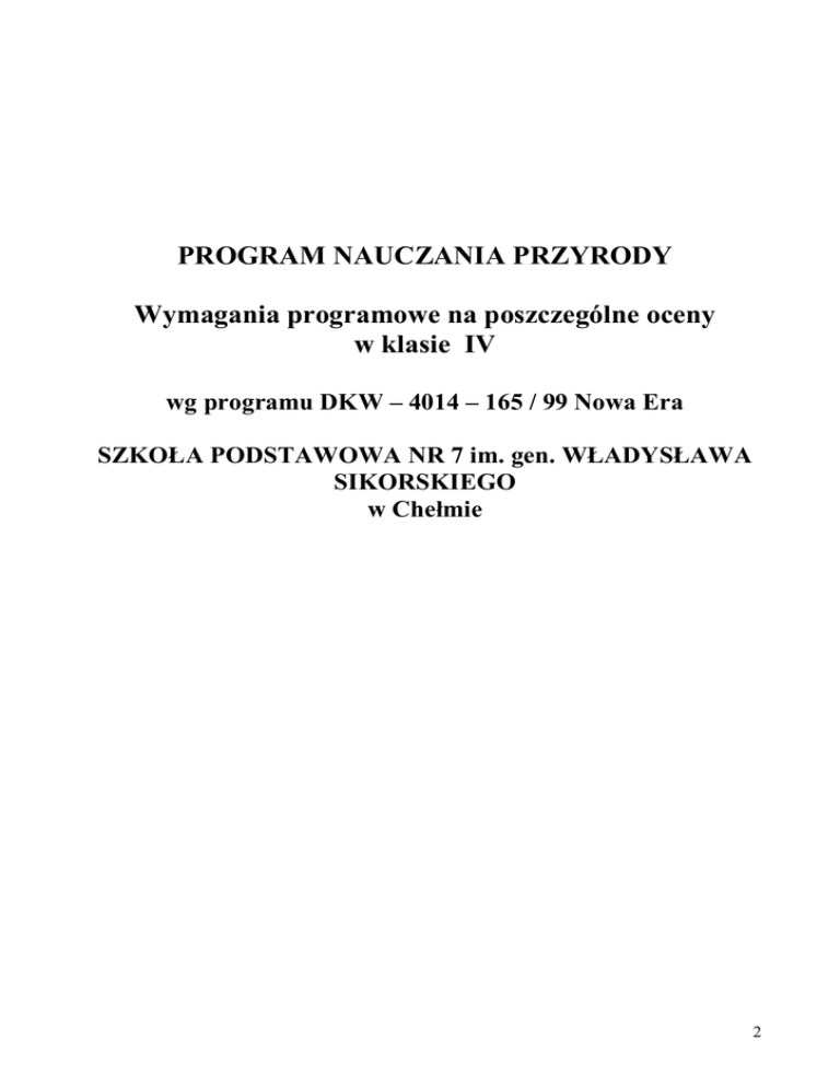 PROGRAM NAUCZANIA PRZYRODY Wymagania programowe na