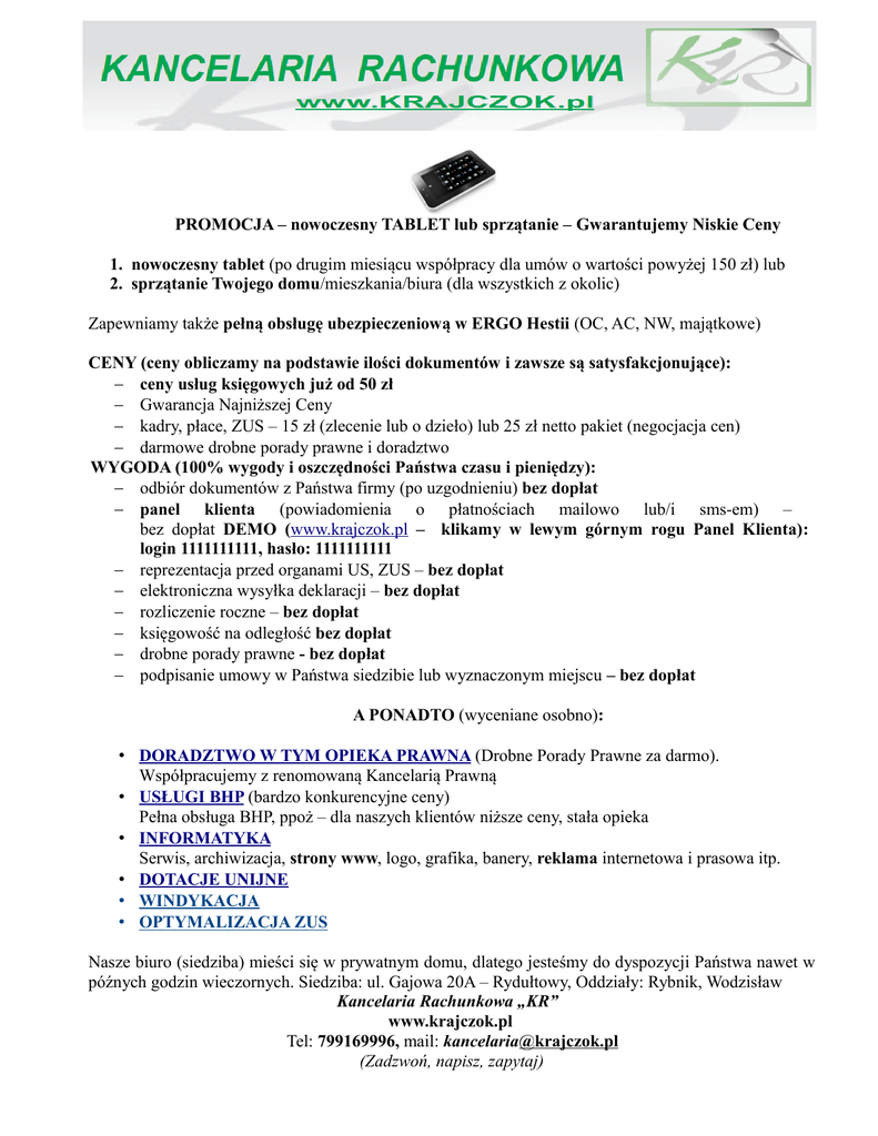 PROMOCJA – nowoczesny TABLET lub sprzątanie – Gwarantujemy Niskie Ceny 1. nowoczesny tablet (po drugim miesiącu współpracy dla umów o wartości powyżej 150 zł) lub 2. sprzątanie Twojego domu/mieszkania/biura (dla wszystkich z okolic) Zapewniamy także pełną obsługę ubezpieczeniową w ERGO Hestii (OC, AC, NW, majątkowe) CENY (ceny obliczamy na podstawie ilości dokumentów i zawsze są satysfakcjonujące): − ceny usług księgowych już od 50 zł − Gwarancja Najniższej Ceny − kadry, płace, ZUS – 15 zł (zlecenie lub o dzieło) lub 25 zł netto pakiet (negocjacja cen) − darmowe drobne porady prawne i doradztwo WYGODA (100% wygody i oszczędności Państwa czasu i pieniędzy): − odbiór dokumentów z Państwa firmy (po uzgodnieniu) bez dopłat − panel klienta (powiadomienia o płatnościach mailowo lub/i sms-em) – bez dopłat DEMO (www.krajczok.pl – klikamy w lewym górnym rogu Panel Klienta): login 1111111111, hasło: 1111111111 − reprezentacja przed organami US, ZUS – bez dopłat − elektroniczna wysyłka deklaracji – bez dopłat − rozliczenie roczne – bez dopłat − księgowość na odległość bez dopłat − drobne porady prawne - bez dopłat − podpisanie umowy w Państwa siedzibie lub wyznaczonym miejscu – bez dopłat A PONADTO (wyceniane osobno): • DORADZTWO W TYM OPIEKA PRAWNA (Drobne Porady Prawne za darmo). Współpracujemy z renomowaną Kancelarią Prawną • USŁUGI BHP (bardzo konkurencyjne ceny) Pełna obsługa BHP, ppoż – dla naszych klientów niższe ceny, stała opieka • INFORMATYKA Serwis, archiwizacja, strony www, logo, grafika, banery, reklama internetowa i prasowa itp. • DOTACJE UNIJNE • WINDYKACJA • OPTYMALIZACJA ZUS Nasze biuro (siedziba) mieści się w prywatnym domu, dlatego jesteśmy do dyspozycji Państwa nawet w późnych godzin wieczornych. Siedziba: ul. Gajowa 20A – Rydułtowy, Oddziały: Rybnik, Wodzisław Kancelaria Rachunkowa „KR” www.krajczok.pl Tel: 799169996, mail: [email protected] (Zadzwoń, napisz, zapytaj)