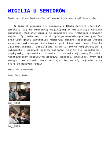 WIGILIA U SENIORÓW Seniorzy z Klubu Seniora „Feniks” spotkali się przy wigilijnym stole. W dniu 17 grudnia br. seniorzy z Klubu Seniora „Feniks”, spotkali się na wieczerzy wigilijnej w restauracji Karczmy Lubuskiej. Modlitwy wigilijne prowadził ks. Proboszcz Sławomir Kupiec. Życzenia seniorom złożyła przewodnicząca Henryka Żuk oraz wójt gminy Bartłomiej Kucharyk. Nastrój potęgował występ zespołu wokalnego koleżanek pod kierownictwem Kamila Dziembowskiego. Gościliśmy Anię i Bolka Wójtowiczów z Bobowicka – naszych byłych kolegów. Łamiąc się opłatkiem – popłynęły życzenia zdrowia i wszelkiej pomyślności. Kosztowaliśmy tradycyjne potrawy: pierogi, krokiety, ryby pod różnymi postaciami. Mamy nadzieję, że nastrój tej wieczerzy trafi do naszych rodzin. tekst: Tosia Tarnowska foto: Piotr Jeske img_8098 img_8099 img_8102 img_8103 img_8105 img_8108 img_8110 img_8113 img_8117 img_8119 img_8120 img_8123 img_8126 img_8129 img_8130 img_8134 img_8135 img_8142 img_8147 img_8152 img_8160 img_8168 img_8169 img_8170 img_8174 img_8176 img_8177 img_8184 img_8195 img_8197 img_8198 img_8199 img_8203 WIGILIA Z MIESZKAŃCAMI Mieszkańcy Gminy Przytoczna, kolejny już rok, spotkali się na wspólnej Wigilli. Mieszkańcy Gminy Przytoczna, kolejny już rok, spotkali się na wspólnej Wigilli. Uroczystość rozpoczął wójt gminy, który serdecznie podziękował mieszkańcom za tak liczne przybycie. Podkreślił, że tego rodzaju spotkania, mają na celu kontynuację niezwykłego klimatu świąt bożonarodzeniowych, które w ostatnich dniach spędzaliśmy w gronie najbliższej rodziny a dziś w klimacie wspólnie śpiewanych kolęd, przeżywamy go ponownie w gronie „gminnej rodziny”. Ks. Proboszcz Sławomir Kupiec, współorganizator spotkania, odczytał fragment Pisma Świętego, po czym ks. dziekan Józef Tomiak, podkreślił znaczenie rodziny i szczęścia jakim jest budowanie jej więzi w naszym codziennym życiu. Po wspólnych życzeniach, niedzielne popołudnie urozmaiciła kapela góralska ZBYRCOG, która w aranżacji instrumentalnej wykonała koncert pastorałek i kolęd. Wszyscy uczestnicy mieli ogromną przyjemność skosztować tradycyjnych – wigilijnych potraw: niezapomnianego smaku barszczu przygotowanego przez panią Marysię i Anię z przedszkola w Przytocznej, jak również wyśmienitego wędzonego karpia z gospodarstwa rybackiego pana Jerzego Bielaka. Każdy zainteresowany, miał również możliwość odwiedzenia stoiska promocyjnego miesięcznika „Pojezierze”, w którym można przeczytać bardzo dużo informacji na temat tego co dzieje się w naszym regionie, jak również naszej gminie. Organizacja spotkania była możliwa dzięki wsparciu finansowemu Europejskiego Funduszu Rybackiego. foto: Piotr Jeske th_img_1128 th_img_1132 th_img_1135 th_img_1136 th_img_1137 th_img_1138 th_img_1139 th_img_1140 th_img_1141 th_img_1144 th_img_1149 th_img_1152 th_img_1156 th_img_1157 th_img_1161 th_img_1162 th_img_1164 th_img_1169 th_img_1170 th_img_1171 th_img_1173 th_img_1174 th_img_1177 th_img_1178 th_img_1182 th_img_1185 th_img_1188 th_img_1189 th_img_1191 th_img_1192 th_img_1195 th_img_1197 th_img_1198 th_img_1204 th_img_1206 th_img_1207 th_img_1211 th_img_1213 th_img_1216 th_img_1220 th_img_1223 th_img_1227 WRĘCZENIE MEDALI Mieszkańcy Gminy Przytoczna zostali wyróżnieni medalami „Za Zasługi Dla Obronności Kraju” nadanymi przez Ministra Obrony Narodowej. Wręczenie medali Mieszkańcy Gminy Przytoczna zostali wyróżnieni medalami „Za Zasługi Dla Obronności Kraju” nadanymi przez Ministra Obrony Narodowej. Uroczystość miała miejsce w sali narad podczas sesji Rady Gminy w dniu 28 listopada 2013r. oraz podczas osobistej wizyty wójta Bartłomieja Kucharyka u rodzin w miejscowościach: Strychy i Stryszewo. Medale „ Za Zasługi Dla Obronności Kraju” przyznawane są rodzicom, których synowie wzorowo pełnili służbę wojskową oraz poprzez działalność na rzecz ojczyzny przyczynili się do jej rozwoju, umocnienia oraz bezpieczeństwa. Odznaczeniem została uhonorowana Pani Janina Gorgiel, której srebrny medal wraz z legitymacją wręczył Wojskowy Komendant Uzupełnień z Gorzowa Wlkp. ppłk Lucjan Jopkiewicz podczas sesji oraz Państwo Brygida i Marian Hercyg, Danuta i Edward Mleczak, którym medale i legitymacje zostały wręczone osobiście przez wójta. img_7514 img_7515 img_7517 img_7519 img_8058 img_8061 img_8064 img_8069 img_8070 img_8074 img_8077 img_8081 img_8083 img_8084 img_8087 img_8089 img_8091 5-6 LATKI W TEATRZE Grupa „Biedronek” i „Skrzatów” 12 grudnia 2013r. gościła w Teatrze im J. Osterwy w Gorzowie Wlkp. na spektaklu „Calineczka” opartym na motywach ponadczasowej baśni Andersena 5-6 latki w teatrze. Grupa „Biedronek” i „Skrzatów” 12 grudnia 2013r. gościła w Teatrze im J. Osterwy w Gorzowie Wlkp. na spektaklu „Calineczka” opartym na motywach ponadczasowej baśni Andersena. Po obejrzeniu musicalu Przedszkolaki zwiedziły kulisy teatru poznając min. pracownie teatralne oraz rekwizyty i urządzenia techniczne. Dyrektor Zdzisława Flens oraz Pani Iwona Estrich i Halina Hibner dziękują Państwu Joannie i Zbigniewowi Dudek oraz Pani Joannie Baranowskiej za wsparcie finansowe na pokrycie kosztów autokaru. źródło: Przedszkole „Kasztanowa Kraina” dsc_0298 dsc_0299 dsc_0302 dsc_0303 dsc_0304 dsc_0305 dsc_0308 dsc_0309 dsc_0310 dsc_0312 dsc_0313 ZIMOWY KONKURS FOTOGRAFICZNY - ZMIANA TERMINU Ze względu na niesprzyjające warunki atmosferyczne, a mianowicie (braku śniegu), postanowiono przedłużyć termin nadsyłania zdjęć dot. zimowego konkursu pt.: „Zimowe uroki naszej gminy” REGULAMIN Gminny Ośrodek Kultury i Rada Sołecka w Przytocznej organizuje gminny konkurs fotograficzny pn.: „Zimowe uroki naszej gminy” Serdecznie zapraszamy wszystkie dzieci z naszej gminy do wzięcia udziału w konkursie fotograficznym. Każdy może przesłać 3 zdjęcia. ZDJĘCIE POWIN