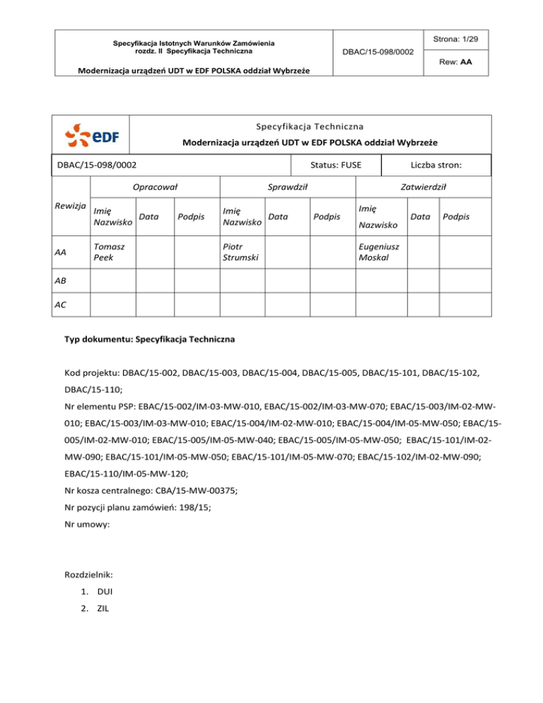 Strona: 1/29 Specyfikacja Istotnych Warunków Zamówienia rozdz. II Specyfikacja Techniczna DBAC/15-098/0002 Rew: AA Modernizacja urządzeń UDT w EDF POLSKA oddział Wybrzeże Specyfikacja Techniczna Modernizacja urządzeń UDT w EDF POLSKA oddział Wybrzeże DBAC/15-098/0002 Status: FUSE Opracował Rewizja AA Imię Data Nazwisko Sprawdził Podpis Tomasz Peek Imię Data Nazwisko Piotr Strumski Liczba stron: Zatwierdził Imię Podpis Data Podpis Nazwisko Eugeniusz Moskal AB AC Typ dokumentu: Specyfikacja Techniczna Kod projektu: DBAC/15-002, DBAC/15-003, DBAC/15-004, DBAC/15-005, DBAC/15-101, DBAC/15-102, DBAC/15-110; Nr elementu PSP: EBAC/15-002/IM-03-MW-010, EBAC/15-002/IM-03-MW-070; EBAC/15-003/IM-02-MW010; EBAC/15-003/IM-03-MW-010; EBAC/15-004/IM-02-MW-010; EBAC/15-004/IM-05-MW-050; EBAC/15005/IM-02-MW-010; EBAC/15-005/IM-05-MW-040; EBAC/15-005/IM-05-MW-050; EBAC/15-101/IM-02MW-090; EBAC/15-101/IM-05-MW-050; EBAC/15-101/IM-05-MW-070; EBAC/15-102/IM-02-MW-090; EBAC/15-110/IM-05-MW-120; Nr kosza centralnego: CBA/15-MW-00375; Nr pozycji planu zamówień: 198/15; Nr umowy: Rozdzielnik: 1. DUI 2. ZIL Specyfikacja Istotnych Warunków Zamówienia rozdz. II Specyfikacja Techniczna Strona: 2/29 DBAC/15-098/0002 Rew: AA Modernizacja urządzeń UDT w EDF POLSKA oddział Wybrzeże Spis treści: I. PRZEDMIOT ZAMÓWIENIA......................................................................................................... 3 1. CEL ZADANIA ................................................................................................................................. 3 2. OPIS UWARUNKOWAŃ WYNIKAJĄCYCH ZE STANU ISTNIEJĄCEGO – OGÓLNYCH I BRANŻOWYCH ........... 3 3. OGÓLNY OPIS PRZEDMIOTU ZAMÓWIENIA / ZAKRES ........................................................................... 3 4. LOKALIZACJA PRZEDMIOTU ZAMÓWIENIA ......................................................................................... 4 5. GRANICE ZAMÓWIENIA .................................................................................................................... 4 II. WYMAGANIA SZCZEGÓŁOWE DOTYCZĄCE REALIZACJI ROBÓT .................................... 4 1. ORGANIZACJA ROBÓT REMONTOWO – MONTAŻOWYCH ..................................................................... 4 2. WYMAGANIA SZCZEGÓŁOWE DLA REALIZACJI PRAC ......................................................................... 5 3. WYMAGANIA DLA PERSONELU KLUCZOWEGO ................................................................................. 20 4. RUCH PRÓBNY ............................................................................................................................. 20 5. ODBIORY ROBÓT .......................................................................................................................... 21 6. DOKUMENTACJA POWYKONAWCZA I KOŃCOWE DOKUMENTY BUDOWY............................................. 22 7. ZARZĄDZANIE ZADANIEM .............................................................................................................. 22 I. WYMAGANIA OGÓLNE DOTYCZĄCE REALIZACJI ROBÓT .................................................. 24 1. WYMAGANIA OGÓLNE ................................................................................................................... 24 II. WYMAGANIA OGÓLNE DOTYCZĄCE PROJEKTOWANIA WYKONAWCZEGO ................ 29 1. WYMAGANIA OGÓLNE ................................................................................................................... 29 2. OPINIOWANIE DOKUMENTACJI WYKONAWCZEJ ............................................................................... 29 Specyfikacja Istotnych Warunków Zamówienia rozdz. II Specyfikacja Techniczna Strona: 3/29 DBAC/15-098/0002 Rew: AA Modernizacja urządzeń UDT w EDF POLSKA oddział Wybrzeże I. PRZEDMIOT ZAMÓWIENIA 1. Cel zadania Celem zadania jest m.in. przygotowanie urządzeń oraz uczestnictwo w rewizji wewnętrznej, wymaganej przez UDT, wskazanych obiektów - w Elektrociepłowni Gdańskiej (Gdańsk, ul. Wiślna 6) i Elektrociepłowni Gdyńskiej (Gdynia, ul Pucka 118). 2. 2.1. Opis uwarunkowań wynikających ze stanu istniejącego – ogólnych i branżowych Opis ogólny stanu istniejącego: Nie dotyczy 2.2. Opis dla branży maszynowej: W chwili obecnej wszystkie urządzenia są użytkowane są w procesach technologicznych. 2.3. Opis dla branży kotłowej: Nie dotyczy 2.4. Opis dla branży elektrycznej, AKPIA: Nie dotyczy 2.5. Opis dla branży poza blokowej: Nie dotyczy 2.6. Opis dla branży budowlanej: Nie dotyczy 2.7. Opis dla branży oczyszczania spalin: Nie dotyczy 2.8. Inne uwarunkowania wynikające ze stanu istniejącego: Nie dotyczy 3. Ogólny opis przedmiotu zamówienia / zakres Do zadań Wykonawcy należy m.in. przygotowanie do rewizji wewnętrznej i próby ciśnieniowej urządzeń zgodnie z wymaganiami UDT, które przedstawiono w pkt II. 2 „Wymagania szczegółowe dla realizacji prac” oraz wykonanie prac pomocniczych. Strona: 4/29 Specyfikacja Istotnych Warunków Zamówienia rozdz. II Specyfikacja Techniczna DBAC/15-098/0002 Rew: AA Modernizacja urządzeń UDT w EDF POLSKA oddział Wybrzeże 4. Lokalizacja przedmiotu zamówienia Elektrociepłownia Gdyńska – ul. Pucka 118, Gdynia Elektrociepłownia Gdańska – ul. Swojska 6, 80-555 Gdańsk 5. Granice zamówienia 5.1. Granice zakresu projektowania Nie dotyczy 5.2. Granice zakresu realizacji zadania Urządzenia podlegające rewizji UDT na terenie Elektrociepłowni Gdańskiej oraz Elektrociepłowni Gdyńskiej ST CZĘŚĆ I - SZCZEGÓŁOWA II. 1. WYMAGANIA SZCZEGÓŁOWE DOTYCZĄCE REALIZACJI ROBÓT Organizacja robót remontowo – montażowych 1.1. Wykonawca jest odpowiedzialny za Koordynowanie na terenie Zamawiającego wykonywanych przez siebie prac, z pracami wykonywanymi przez innych Wykonawców w porozumieniu z Przedstawicielem Zamawiającego. 1.2. Dostęp zwłaszcza do suwnicy pomostowej usytuowanej na maszynowni będzie ograniczony 