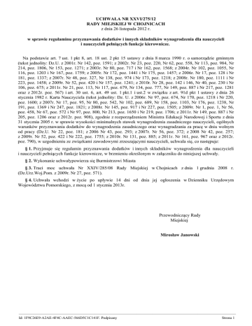 UCHWAŁA NR XXVI/275/12 RADY MIEJSKIEJ W CHOJNICACH z dnia 26 listopada 2012 r. w sprawie regulaminu przyznawania dodatków i innych składników wynagrodzenia dla nauczycieli i nauczycieli pełniących funkcje kierownicze. Na podstawie art. 7 ust. 1 pkt 8, art. 18 ust. 2 pkt 15 ustawy z dnia 8 marca 1990 r. o samorządzie gminnym (tekst jednolity: Dz.U. z 2001r. Nr 142, poz. 1591; z 2002r. Nr 23, poz. 220, Nr 62, poz. 558, Nr 113, poz. 984, Nr 214, poz. 1806, Nr 153, poz. 1271; z 2003r. Nr 80, poz. 717 i Nr 162, poz. 1568; z 2004r. Nr 102, poz. 1055, Nr 116, poz. 1203 i Nr 167, poz. 1759; z 2005r. Nr 172, poz. 1441 i Nr 175, poz. 1457; z 2006r. Nr 17, poz. 128 i Nr 181, poz. 1337; z 2007r. Nr 48, poz. 327, Nr 138, poz. 974 i Nr 173, poz. 1218; z 2008r. Nr 180, poz. 1111 i Nr 223, poz. 1458; z 2009r. Nr 52, poz. 420 i Nr 157, poz. 1241; z 2010r. Nr 28, poz. 142 i 146, Nr 40, poz. 230 i Nr 106, poz. 675; z 2011r. Nr 21, poz. 113, Nr 117, poz. 679, Nr 134, poz. 777, Nr 149, poz. 887 i Nr 217, poz. 1281 oraz z 2012r. poz. 567) i art. 30 ust. 6, art. 49 ust. 1 pkt.1 i ust.2 w związku z art. 91d pkt 1 ustawy z dnia 26 stycznia 1982 r. Karta Nauczyciela (tekst jednolity: Dz. U. z 2006r. Nr 97, poz. 674, Nr 170, poz. 1218 i Nr 220, poz. 1600; z 2007r. Nr 17, poz. 95, Nr 80, poz. 542, Nr 102, poz. 689, Nr 158, poz. 1103, Nr 176, poz. 1238, Nr 191, poz. 1369 i Nr 247, poz. 1821; z 2008r. Nr 145, poz. 917 i Nr 227, poz. 1505; z 2009r. Nr 1, poz. 1, Nr 56, poz. 458, Nr 67, poz. 572 i Nr 97, poz. 800, Nr 213, poz. 1650 i Nr 219, poz. 1706; z 2011r. Nr 149, poz. 887 i Nr 205, poz. 1206 oraz z 2012r. poz. 908), zgodnie z rozporządzeniem Ministra Edukacji Narodowej i Sportu z dnia 31 stycznia 2005 r. w sprawie wysokości minimalnych stawek wynagrodzenia zasadniczego nauczycieli, ogólnych warunków przyznawania dodatków do wynagrodzenia zasadniczego oraz wynagradzania za pracę w dniu wolnym od pracy (Dz.U. Nr 22, poz. 181; z 2006 Nr 43, poz. 293; z 2007r. Nr 56, poz. 372; z 2008 Nr 42, poz. 257; z 2009r. Nr 52, poz. 422 i Nr 222, poz. 1755; z 2010r. Nr 131, poz. 885; z 2011r. Nr 161, poz. 967 oraz z 2012r. poz. 790), w uzgodnieniu ze związkami zawodowymi zrzeszającymi nauczycieli, uchwala się, co następuje: § 1. Przyjmuje się regulamin przyznawania dodatków i innych składników wynagrodzenia dla nauczycieli i nauczycieli pełniących funkcje kierownicze, w brzmieniu określonym w załączniku do niniejszej uchwały. § 2. Wykonanie uchwałypowierza się Burmistrzowi Miasta § 3. Traci moc uchwała Nr XXIV/285/08 Rady Miejskiej w Chojnicach z dnia 1 grudnia 2008 r. (Dz.Urz.Woj.Pom. z 2009r. Nr 27, poz. 571). § 4. Uchwała wchodzi w życie po upływie 14 dni od dnia jej ogłoszenia w Dzienniku Urzędowym Województwa Pomorskiego, z mocą od 1 stycznia 2013r. Przewodniczący Rady Miejskiej Mirosław Janowski ————————————————————————————————————————————————————————— Id: 1F9C26E9-A2AE-4F4C-AAEC-566D5C1C141F. Podpisany Strona 1 Załącznik do Uchwały Nr XXVI/275/12 Rady Miejskiej w Chojnicach z dnia 26 listopada 2012 r. Rozdział 1. Postanowienia ogólne § 1. Ilekroć w poniższych przepisach jest mowa bez bliższego określenia o: 1) tygodniowym obowiązującym wymiarze godzin, należy przez to rozumieć tygodniowy obowiązkowy wymiar godzin o którym mowa w art. 42 ust.3 lub art. 42 ust. 7 ustawy z dnia 26 stycznia 1982 (tekst jednolity: Dz.U 2006 r. Nr 97, poz.674 z późn. zmian.); 2) osobistej minimalnej płacy zasadniczej, należy przez to rozumieć tabelę zaszeregowań oraz osobistych minimalnych stawek wynagrodzenia zasadniczego, określonych aktualnym rozporządzeniem Ministra Edukacji Narodowej. Rozdział 2. Dodatek motywacyjny dla nauczycieli i nauczycieli pełniących funkcje kierownicze i szczegółowe warunki przyznawania § 2. Zasady ogólne: 1) w budżecie na rok budżetowy zabezpiecza się środki w wysokości wynikającej z pomnożenia 4% osobistego miesięcznego minimalnego wynagrodzenia zasadniczego nauczycieli (w przeliczeniu na etaty) przez 12 miesięcy; 2) dodatek motywacyjny dla nauczycieli przyznaje się na okres sześciu miesięcy; 3) dodatek motywacyjny dla dyrektorów i wicedyrektorów przyznaje się na okres jak w pkt. 2; 4) dodatek motywacyjny przysługuje po uzyskaniu stopnia nauczyciela kontraktowego; 5) przyjmuje się, że stawki dodatku motywacyjnego nie mogą wynosić mniej niż: a) 2,1% minimalnej stawki wynagrodzenia zasadniczego nauczyciela mianowanego z tytułem zawodowym magistra z przygotowaniem pedagogicznym - dla nauczycieli szkół, b) 4,2 % minimalnej stawki wynagrodzenia zasadniczego nauczyciela mianowanego z tytułem zawodowym magistra z przygotowaniem pedagogicznym - dla dyrektorów szkół; 6) prawo do dodatku motywacyjnego mają nauczyciele którzy w danej placówce przepracowali co najmniej 12 miesięcy, 7) przyznając dodatek motywacyjny dyrektor ocenia okres poprzedni; 8) nie mają prawa do dodatku motywacyjnego nauczyciele których nieobecność w pracy w poprzednim okresie na który przyznano dodatek motywacyjny wyniosła łącznie więcej niż 30 dni roboczych; 9) dodatek motywacyjny ulega proporcjonalnemu zmniejszeniu za każdy dzień usprawiedliwionej nieobecności w pracy. Dodatek motywacyjny wypłaca się comiesięcznie; 10) wysokość dodatków motywacyjnych dla nauczycieli i wicedyrektorów oraz ich liczbę przyznaje dyrektor szkoły, uwzględniając kryteria określone w § 3, po zasięgnięciu opinii związków zawodowych; 11) dodatek dla dyrektorów przyznaje Burmistrz Miasta; 12) listę osób, którym przyznano dodatek motywacyjny podaje się do wiadomości rady pedagogicznej. § 3. Kryteria przyznawania dodatku motywacyjnego dla nauczycieli i wicedyrektorów: 1) osiągnięcia w realizowanym procesie dydaktycznym, a w szczególności: a) osiągnięcia edukacyjne, oceniane z uwzględnieniem możliwości uczniów oraz