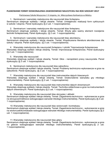 30.11.2016 PLANOWANE FORMY DOSKONALENIA ZAWODOWEGO NAUCZYCIELI NA ROK SZKOLNY 2017 Państwowa Szkoła Muzyczna I i II stopnia, im. Mieczysława Karłowicza w Mielcu 1. Seminarium i warsztaty metodyczne dla nauczycieli klas fortepianu. Seminarium obejmuje wykłady i lekcje otwarte. Temat: Umiejętność realizacji form cyklicznych w szkole I stopnia. Panel dyskusyjny (§ 2 ust. 1 rozporządzenia). 2. Seminarium i warsztaty metodyczne dla nauczycieli klas fortepianu. Seminarium obejmuje wykłady i lekcje otwarte. Temat: Etiudy jako ważny element rozwijania techniki fortepianowej. Panel dyskusyjny. (§ 2 ust. 1 rozporządzenia). 3. Seminarium i warsztaty metodyczne dla nauczycieli klas akordeonu. Seminarium obejmuje wykłady i lekcje otwarte. Temat: Współczesna literatura akordeonowa dla szkoły I stopnia. Panel dyskusyjny. (§ 2 ust. 1 rozporządzenia). 4. Warsztaty metodyczne dla nauczycieli fortepianu i rytmiki "Improwizacja fortepianowa Warsztaty obejmują wykład i lekcje otwartą. Temat: Improwizacja fortepianowa. Panel dyskusyjny (§ 2 ust. 1 rozporządzenia). 5. Warsztaty dla nauczycieli Warsztaty obejmują wykład i lekcje otwartą. Temat: Głos - narzędziem pracy nauczyciela. Panel dyskusyjny (§ 2 ust. 1 rozporządzenia: 6. Seminarium metodyczne dla nauczycieli klas saksofonu Seminarium obejmuje wykład i lekcje otwartą. Temat: Problemy techniczno-wykonawcze w grze na saksofonie. Panel dyskusyjny. (§ 2 ust. 1 rozporządzenia): 7. Warsztaty metodyczne dla nauczycieli klas instrumentów dętych blaszanych Warsztaty obejmują wykład i lekcje otwartą. Temat: Doskonalenie warsztatu gry młodego instrumentalisty. Panel dyskusyjny (§ 2 ust. 1 rozporządzenia): 8. Warsztaty metodyczne dla nauczycieli klas instrumentów dętych drewnianych Warsztaty obejmują wykłady i lekcje otwarte. Temat: Technika oddechowa w grze na instrumentach dętych drewnianych. Panel dyskusyjny (§ 2 ust. 1 rozporządzenia): 9. Warsztaty metodyczne dla nauczycieli klas skrzypiec i altówki Seminarium obejmuje wykład i lekcje otwartą. Temat: Zagadnienia techniczno - wykonawcze w grze na skrzypcach/altówce wzbogacające warsztat młodego instrumentalisty. Panel dyskusyjny.(§ 2 ust. 1 rozporządzenia). 10. Warsztaty metodyczne dla nauczycieli klas wiolonczeli i kontrabasu Seminarium obejmuje wykład i lekcje otwartą. Temat: Zagadnienia techniczno - wykonawcze w grze na wiolonczeli/kontrabasie wzbogacające warsztat młodego instrumentalisty. Panel dyskusyjny.(§ 2 ust. 1 rozporządzenia). 11. Warsztaty metodyczne dla nauczycieli klas gitary Seminarium obejmuje wykład i lekcje otwartą. Temat: Zagadnienia techniczno - wykonawcze w grze na gitarze wzbogacające warsztat młodego instrumentalisty. Panel dyskusyjny.(§ 2 ust. 1 rozporządzenia).