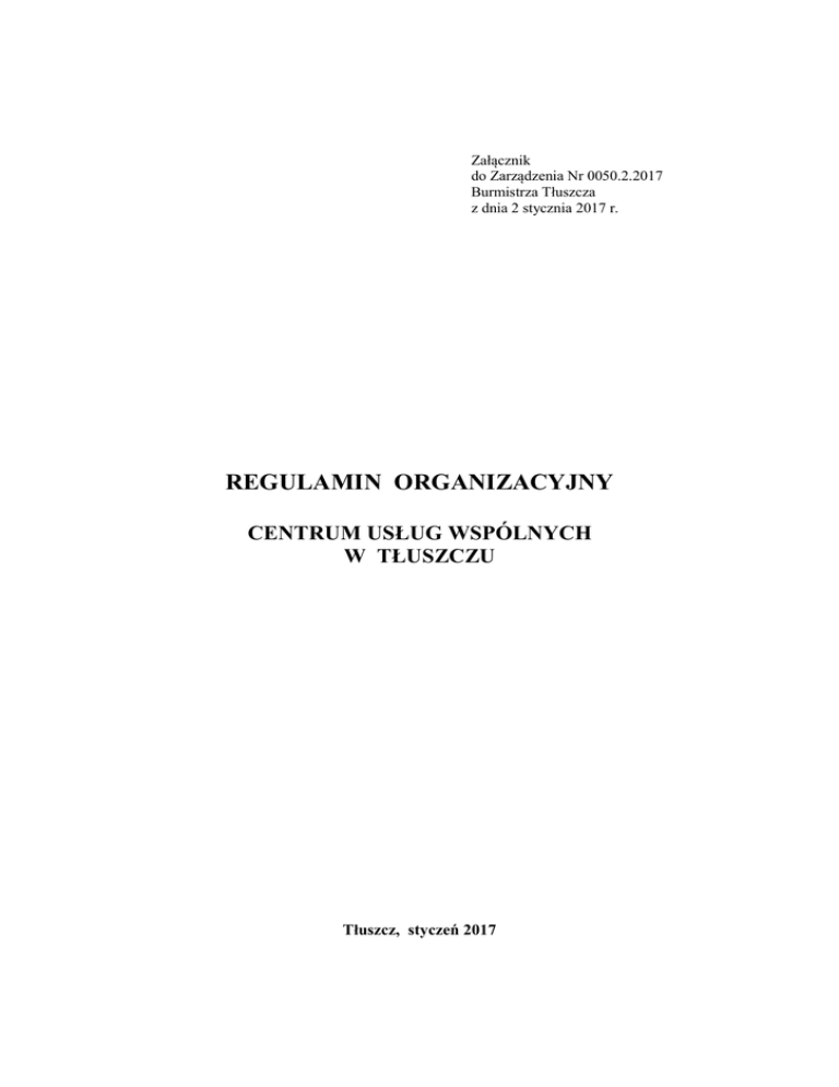 Załącznik do Zarządzenia Nr 0050.2.2017 Burmistrza Tłuszcza z dnia 2 stycznia 2017 r. REGULAMIN ORGANIZACYJNY CENTRUM USŁUG WSPÓLNYCH W TŁUSZCZU Tłuszcz, styczeń 2017 Rozdział I Postanowienia ogólne §1 Regulamin organizacyjny określa strukturę organizacyjną oraz zasady funkcjonowania Centrum Usług Wspólnych w Tłuszczu. §2 Centrum działa na podstawie: 1. Uchwały Nr XIV.207.2016 Rady Miejskiej w Tłuszczu z dnia 13 września 2016 r.; 2. Statutu Centrum; 3. Niniejszego Regulaminu. §3 1. Centrum jest pracodawcą dla dyrektora i zatrudnionych w nim pracowników w rozumieniu przepisów Kodeksu Pracy. 2. Siedzibą Centrum jest Urząd Miejski w Tłuszczu przy ul. Warszawskiej 10. 3. Praca Centrum odbywa się w dniach roboczych w godzinach pracy Urzędu Miejskiego. 4. W korespondencji Centrum posługuje się oznakowaniem akt o symbolu „CUW”. R o z d z i a ł II Zakres działania Centrum §4 Centrum przy prowadzeniu wspólnej obsługi dla jednostek obsługiwanych nie może naruszać kompetencji dyrektorów tych jednostek w granicach ustalonych przepisami prawa, w tym kompetencji dyrektorów do dysponowania środkami publicznymi oraz zaciągania zobowiązań, a także sporządzania i zatwierdzania planu finansowego oraz przeniesień wydatków w tym planie. §5 1. Centrum ma prawo żądania od jednostek obsługiwanych informacji oraz wglądu w dokumentację w zakresie niezbędnym do wykonywania zadań w ramach wspólnej obsługi tych jednostek. 2. Jednostki obsługiwane mają prawo żądania od Centrum informacji oraz wglądu w dokumentację w zakresie zadań wykonywanych przez jednostkę obsługującą w ramach wspólnej obsługi. §6 Centrum jest uprawnione do przetwarzania danych osobowych przetwarzanych przez jednostki obsługiwane w zakresie i celu niezbędnym do wykonywania zadań w ramach wspólnej obsługi tych jednostek. R o z d z i a ł III Struktura organizacyjna §7 1. Całokształtem działalności Centrum kieruje dyrektor. 2. Dyrektora Centrum zatrudnia i zwalnia Burmistrz Tłuszcza. 3. Dyrektor jest kierownikiem zakładu pracy w rozumieniu Kodeksu Pracy i wykonuje wszystkie czynności wynikające ze stosunku pracy wobec pracowników Centrum. 4. W czasie nieobecności dyrektora placówką kieruje upoważniona przez niego osoba. 5. Struktura organizacyjna Centrum: 1) Dyrektor, 2) Główny Księgowy, 3) stanowisko ds. księgowości (3 etaty), 4) stanowisko ds. płac, 5) stanowisko ds. pracowniczych, 6) stanowisko ds. administracyjnych, 7) kierowca samochodu. R o z d z i a ł IV Zakresy działania stanowisk §8 1. Do obowiązków dyrektora w szczególności należy: 1) kierowanie całokształtem działalności Centrum w sposób gwarantujący realizację planowych zadań określonych Statutem i Regulaminem organizacyjnym Centrum; 2) nadzór nad realizacją zadań nałożonych na Centrum, gospodarowanie majątkiem Centrum; 3) dysponowanie środkami finansowymi Centrum oraz współpraca z dyrektorami placówek w tym zakresie; 4) nadzór nad prawidłową realizacją jednostkowych planów obsługiwanych jednostek; 5) analiza i przygotowanie do zatwierdzenia projektów organizacyjnych oraz aneksów; 6) organizacja postępowań egzaminacyjnych na stopień nauczyciela mianowanego; 7) przygotowywanie dokumentów do oceny pracy dyrektorów; 8) przygotowanie odpowiedniej dokumentacji dla wyłonienia kandydata na stanowisko dyrektora; 9) opracowanie i przekazywanie Burmistrzowi Tłuszcza informacji o stanie realizacji zadań oświatowych za poprzedni rok szkolny zgodnie z ustawą o systemie oświaty; 10) wykonywanie zadań z zakresu pomocy zdrowotnej dla nauczycieli; 11) współdziałanie z nadzorem pedagogicznym oraz instytucjami wspomagającymi oświatę; 12) podejmowanie czynności organizacyjnych sieci placówek publicznych na terenie gminy; 13) prowadzenie spraw związanych z tworzeniem, likwidacją szkół i placówek oświatowych; 14) prowadzenie ewidencji szkół i placówek niepublicznych; 15) koordynowanie spraw związanych z udzielaniem i rozliczaniem dotacji niepublicznym placówkom oraz rozliczeń w tym zakresie między Gminą Tłuszcz a innymi gminami; 16) opracowywanie projektów uchwał i zarządzeń w zakresie oświaty; 17) nadzór nad prowadzeniem kasy zapomogowo pożyczkowej i ZFM; 18) realizacja innych zadań zleconych przez organy nadzorujące. 2. W celu realizacji swoich zadań dyrektor Centrum podpisuje zarządzenia wewnętrzne, polecenia, in instrukcje, regulaminy, pisma kierowane do zwierzchnich władz. 3. Dyrektor jest bezpośrednim przełożonym Głównego Księgowego, samodzielnego stanowiska ds. pracowniczych, samodzielnego stanowiska ds. administracyjnych oraz kierowcy. §9 1. Główny Księgowy wykonuje zadania w oparciu o zakres czynności, uprawnień i odpowiedzialności na podstawie obowiązujących aktów prawnych. 2. Do podstawowych obowiązków Głównego Księgowego należy: 1) prowadzenie rachunkowości Centrum oraz jednostek obsługiwanych zgodnie z obowiązującymi przepisami oraz organizowanie sporządzania, przyjmowania, obiegu i kontrolowania dokumentów, w sposób zapewniający właściwy przebieg operacji gospodarczych; 2) koordynowanie pracy podległych pracowników; 3) prawidłowe i terminowe dokonywanie rozliczeń finansowych; 4) nadzorowanie całokształtu prac z zakresu rachunkowości wykonywanych przez pracowników księgowości; 5) prowadzenie spraw finansowych Centrum i obsługiwanych jednostek w zakresie: − wykonywania dyspozycji środkami pieniężnymi; − przestrzegania rozliczeń pieniężnych; − terminowego ściągania należności i dochodzenia roszczeń spornych oraz zapłaty zobowiązań; 6) dokonywanie wstępnej kontroli: − zgodności operacji gospodarczych i finansowych z planem finansowym; − kompletności i rzetelności dokumentów dotyczących operacji gospodarczych i finansowych; 7) analiza wykorzystania środków finansowych znajdujących się w budżecie Centrum oraz budżetach jednostek obsługiwa