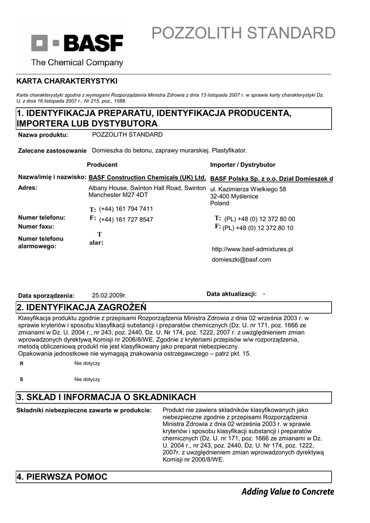 POZZOLITH STANDARD KARTA CHARAKTERYSTYKI Karta charakterystyki zgodna z wymogami Rozporządzenia Ministra Zdrowia z dnia 13 listopada 2007 r. w sprawie karty charakterystyki Dz. U. z dnia 16 listopada 2007 r., Nr 215, poz., 1588. 1. IDENTYFIKACJA PREPARATU, IDENTYFIKACJA PRODUCENTA, IMPORTERA LUB DYSTYBUTORA POZZOLITH STANDARD Nazwa produktu: Zalecane zastosowanie Domieszka do betonu, zaprawy murarskiej. Plastyfikator. Producent Importer / Dystrybutor Nazwa/imię i nazwisko: BASF Construction Chemicals (UK) Ltd. BASF Polska Sp. z o.o. Dział Domieszek do Betonu Adres: Albany House, Swinton Hall Road, Swinton ul. Kazimierza Wielkiego 58 Manchester M27 4DT 32-400 Myślenice Poland T: (+44) 161 794 7411 Numer telefonu: F: (+44) 161 727 8547 T: (PL) +48 (0) 12 372 80 00 F: (PL) +48 (0) 12 372 80 10 Numer faxu: T alar: Numer telefonu alarmowego: http://www.basf-admixtures.pl [email protected] Data sporządzenia: Data aktualizacji: - 25.02.2009r. 2. IDENTYFIKACJA ZAGROŻEŃ Klasyfikacja produktu zgodnie z przepisami Rozporządzenia Ministra Zdrowia z dnia 02 września 2003 r. w sprawie kryteriów i sposobu klasyfikacji substancji i preparatów chemicznych (Dz. U. nr 171, poz. 1666 ze zmianami w Dz. U. 2004 r., nr 243, poz. 2440, Dz. U. Nr 174, poz. 1222, 2007 r. z uwzględnieniem zmian wprowadzonych dyrektywą Komisji nr 2006/8/WE. Zgodnie z kryteriami przepisów w/w rozporządzenia, metodą obliczeniową produkt nie jest klasyfikowany jako preparat niebezpieczny. Opakowania jednostkowe nie wymagają znakowania ostrzegawczego – patrz pkt. 15. R Nie dotyczy S Nie dotyczy 3. SKŁAD I INFORMACJA O SKŁADNIKACH Składniki niebezpieczne zawarte w produkcie: 4. PIERWSZA POMOC Produkt nie zawiera składników klasyfikowanych jako niebezpieczne zgodnie z przepisami Rozporządzenia Ministra Zdrowia z dnia 02 września 2003 r. w sprawie kryteriów i sposobu klasyfikacji substancji i preparatów chemicznych (Dz. U. nr 171, poz. 1666 ze zmianami w Dz. U. 2004 r., nr 243, poz. 2440, Dz. U. Nr 174, poz. 1222, 2007r. z uwzględnieniem zmian wprowadzonych dyrektywą Komisji nr 2006/8/WE. POZZOLITH STANDARD KARTA CHARAKTERYSTYKI Uwagi ogólne: Nie ma specjalnych zaleceń. Narażenie inhalacyjne: Małoprawdobodobne. W przypadku narażenia wyprowadzic osobę narażoną na świeże powietrze. Skonsultować się zlekarzem w razie pogorszenia. Kontakt ze skórą: Niezwłocznie umyć wodą i mydłem i dokładnie spłukać. Skonsultować się zlekarzem w razie pogorszenia. Kontakt z oczami: Usunąć soczewki kontaktowe. Przemywać dużą ilością czystej, świeżej wody przez co najmniej 10 - 15 minut, trzymając powieki otwarte. Skonsultować się zlekarzem w razie pogorszenia. Połknięcie: Nie wywoływać wymiotów!!! Nie podawać osobie nieprzytomnej płynów. Dokładnie przepłukać usta. Szybko podać osobie narażonej dużą ilość wody do picia w celu zmiejszenia działania połkniętych chemikaliów.Skonsultować się zlekarzem. Zabiezpieczyć odpoczynek i świeże powietrze. 5. POSTĘPOWANIE W PRZYPADKU POŻARU Zalecane śrdoki gaśnicze: Dwutlenek węgla (CO2), proszki gaśnicze lub woda. Przy dużym pożarze stosować silny strumień wody lub pianę gaśniczą odporną na alkohol. Gaśnica śniegowa, proszkowa. Nieodpowiednie śrdoki gaśnicze: - Szczególne zagrożenia ze strony produktów spalania i wydzielających się gazów: - Specjalne wyposażenie Dodatkowe wyposażenie przeciwpożarowe nie jest wymagane. ochronne strażaków: Inne uwagi: Zawiadomić otoczenie o pożarze, usunąć z obszaru zagrożenia wszystkie osoby nie biorące udziału w likwidowaniu pożaru. Zagrożone pożarem pojemniki chłodzić rozpylona wodą. 6. POSTĘPOWANIE W PRZYPADKU NIEZAMIERZONEGO UWOLNIENIA DO ŚRODOWISKA Indywidualne środki ostrożności: Stosować odzież ochronną. Przy uszkodzeniu opakowania i wycieku produkt przelać do szczelnych opakowań. Osób postronnych nie dopuszczać do pracy. Środki ostrożności w zakresie ochrony środowiska: Nie pozwolić na wprowadzenie do systemu odwadniającego. Zapobiegać wsiąkaniu do gruntu i przenikaniu do wód gruntowych i powierzchniowych. Produkt zebrać przy pomocy materiału absorbującego, np. piasku, ziemi, Metody oczyszczania/usuwania: wermikulitu, ziemi okrzemkowej i umieścić w pojemniku w celu usunięcia zgodnie z przepisami (Patrz punkt 13). Nie uwalnia materiałów niebezpiecznych. 7. POSTĘPOWANIE Z PREPARATEM I JEGO MAGAZYNOWANIE POZZOLITH STANDARD KARTA CHARAKTERYSTYKI Postępowanie z preparatem: Pojemniki należy szczelnie zamykać. Przestrzegać zasad i przepisów BHP w zakresie postępowania z chemikaliami. Magazynowanie: Wymagania odnośnie pomieszczeń magazynowych i pojemników (kontenerów). Nie ma specjalnych wymagań. Nie mniej jednak należy przestrzegać przepisów odnośnie składowania produktów grożących skażeniem wód gruntowych. Składowanie w zbiorczych magazynach: Nie ma wymagań. Inne warunki magazynowania i składowania: Chronić przed mrozem i zanieczyszczeniem. Zalecana temperatura składowania: Przy normalnym przechowywaniu ÷ 20°C. 8. KONTROLA NARAŻENIA I ŚRODKI OCHRONY INDYWIDUALNEJ Dodatkowe zalecenia w zakresie środków inżynieryjnych: Rozporządzenie MPiPS z dnia 29 listopada 2002r w sprawie dopuszczalnych stężeń czynników szkodliwych dla zdrowia w środowisku pracy (Dz. U. Nr 217/2002r, poz. 1833): W preparacie nie występują substancje wymienione w rozporządzeniU Parametry kontroli narażenia: Produkt nie zawiera żadnych istotnych składników, dla których wymagana jest kontrola narażenia na stanowisku pracy. Zalecane procedury monitoringu: PN ISO 4225/Ak:1999 Jakość powietrza – Zagadnienia ogólne – Terminologia (arkusz krajowy). PN Z-04008-7:2002 Ochrona czystości powietrza. Pobieranie próbek. Zasady pobierania próbek powietrza w środowisku pracy i interpretacji wyników. Powietrze na stanowiskach pracy – Wytyczne oceny narażenia inhalacyjnego na czynniki chemiczne przez porównanie z war