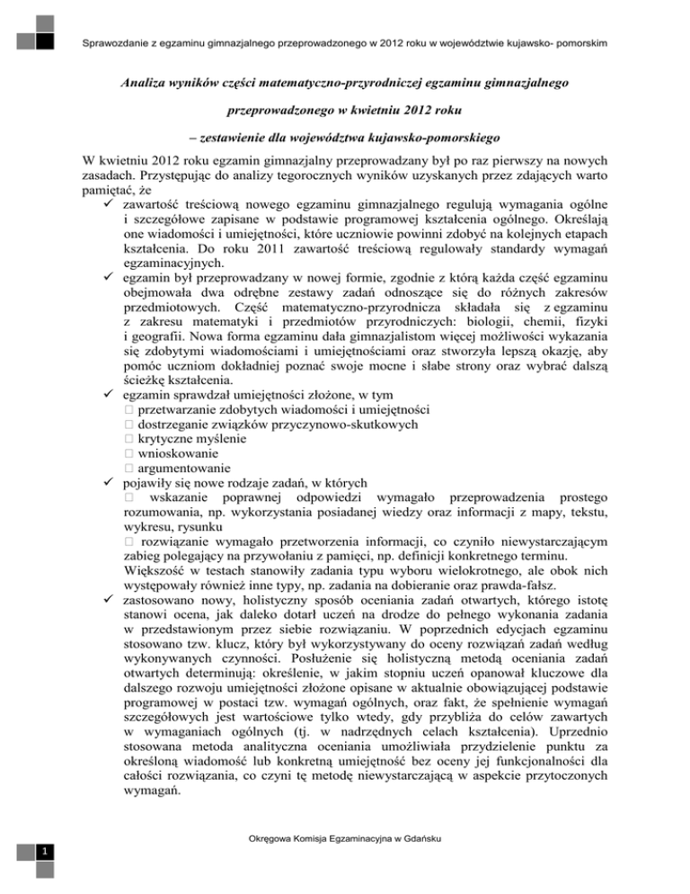 Sprawozdanie z egzaminu gimnazjalnego przeprowadzonego w 2012 roku w województwie kujawsko- pomorskim Analiza wyników części matematyczno-przyrodniczej egzaminu gimnazjalnego przeprowadzonego w kwietniu 2012 roku – zestawienie dla województwa kujawsko-pomorskiego W kwietniu 2012 roku egzamin gimnazjalny przeprowadzany był po raz pierwszy na nowych zasadach. Przystępując do analizy tegorocznych wyników uzyskanych przez zdających warto pamiętać, Ŝe zawartość treściową nowego egzaminu gimnazjalnego regulują wymagania ogólne i szczegółowe zapisane w podstawie programowej kształcenia ogólnego. Określają one wiadomości i umiejętności, które uczniowie powinni zdobyć na kolejnych etapach kształcenia. Do roku 2011 zawartość treściową regulowały standardy wymagań egzaminacyjnych. egzamin był przeprowadzany w nowej formie, zgodnie z którą kaŜda część egzaminu obejmowała dwa odrębne zestawy zadań odnoszące się do róŜnych zakresów przedmiotowych. Część matematyczno-przyrodnicza składała się z egzaminu z zakresu matematyki i przedmiotów przyrodniczych: biologii, chemii, fizyki i geografii. Nowa forma egzaminu dała gimnazjalistom więcej moŜliwości wykazania się zdobytymi wiadomościami i umiejętnościami oraz stworzyła lepszą okazję, aby pomóc uczniom dokładniej poznać swoje mocne i słabe strony oraz wybrać dalszą ścieŜkę kształcenia. egzamin sprawdzał umiejętności złoŜone, w tym ‒ przetwarzanie zdobytych wiadomości i umiejętności ‒ dostrzeganie związków przyczynowo-skutkowych ‒ krytyczne myślenie ‒ wnioskowanie ‒ argumentowanie pojawiły się nowe rodzaje zadań, w których ‒ wskazanie poprawnej odpowiedzi wymagało przeprowadzenia prostego rozumowania, np. wykorzystania posiadanej wiedzy oraz informacji z mapy, tekstu, wykresu, rysunku ‒ rozwiązanie wymagało przetworzenia informacji, co czyniło niewystarczającym zabieg polegający na przywołaniu z pamięci, np. definicji konkretnego terminu. Większość w testach stanowiły zadania typu wyboru wielokrotnego, ale obok nich występowały równieŜ inne typy, np. zadania na dobieranie oraz prawda-fałsz. zastosowano nowy, holistyczny sposób oceniania zadań otwartych, którego istotę stanowi ocena, jak daleko dotarł uczeń na drodze do pełnego wykonania zadania w przedstawionym przez siebie rozwiązaniu. W poprzednich edycjach egzaminu stosowano tzw. klucz, który był wykorzystywany do oceny rozwiązań zadań według wykonywanych czynności. PosłuŜenie się holistyczną metodą oceniania zadań otwartych determinują: określenie, w jakim stopniu uczeń opanował kluczowe dla dalszego rozwoju umiejętności złoŜone opisane w aktualnie obowiązującej podstawie programowej w postaci tzw. wymagań ogólnych, oraz fakt, Ŝe spełnienie wymagań szczegółowych jest wartościowe tylko wtedy, gdy przybliŜa do celów zawartych w wymaganiach ogólnych (tj. w nadrzędnych celach kształcenia). Uprzednio stosowana metoda analityczna oceniania umoŜliwiała przydzielenie punktu za określoną wiadomość lub konkretną umiejętność bez oceny jej funkcjonalności dla całości rozwiązania, co czyni tę metodę niewystarczającą w aspekcie przytoczonych wymagań. Okręgowa Komisja Egzaminacyjna w Gdańsku 1 Sprawozdanie z egzaminu gimnazjalnego przeprowadzonego w 2012 roku w województwie kujawsko- pomorskim Egzamin gimnazjalny w 2012 r. cechuje wiele zmian w porównaniu do edycji egzaminu gimnazjalnego w poprzednich latach, stąd niezasadne jest porównywanie jego wyników z wynikami egzaminu w poprzednich latach. Wyniki egzaminu ujawniły, które umiejętności zostały przez gimnazjalistów opanowane lepiej, a które gorzej. Wskazanie tych umiejętności oraz wnioski z analizy wyników poszczególnych zadań mogą stanowić dla nauczycieli cenną pomoc przy planowaniu pracy z kolejnymi rocznikami gimnazjalistów, zwłaszcza wtedy, gdy poprze je analiza wyników uzyskanych przez uczniów danej szkoły. PoniŜej zamieszczam podstawowe dane statystyczne dotyczące części matematyczno-przyrodniczej egzaminu gimnazjalnego przeprowadzonego w kwietniu 2012 roku na terenie województwa kujawsko-pomorskiego oraz analizę przykładowych zadań ilustrujących umiejętności opanowane dobrze przez gimnazjalistów z województwa kujawsko-pomorskiego i umiejętności opanowane przez nich w najmniejszym stopniu. Informacje zostały zestawione oddzielnie dla kaŜdego z zakresów przedmiotowych objętych tą częścią egzaminu, przy czym naleŜy zauwaŜyć, Ŝe dla gimnazjalistów oba zestawy okazały się trudne. Matematyka W województwie kujawsko-pomorskim do testu z zakresu matematyki przystąpiło łącznie 22 942 uczniów trzeciej klasy gimnazjum. Około 96,1% z nich rozwiązywało zestawy standardowe, w tym uczniowie z róŜnych przyczyn korzystający z dostosowania warunków egzaminacyjnych. Zestaw standardowy zawierał dwadzieścia trzy zadania, w tym dwadzieścia zadań zamkniętych. Wśród zadań zamkniętych dominowały zadania wyboru wielokrotnego, w których uczeń wybierał jedną z podanych odpowiedzi. Cztery zadania miały inną formę: w trzech uczeń musiał ocenić prawdziwość podanych stwierdzeń, a w jednym miał wybrać poprawną odpowiedź oraz odpowiedni argument uzasadniający ją. Zadania otwarte wymagały od gimnazjalisty samodzielnego sformułowania rozwiązania. Zadania w zestawie sprawdzały, w jakim stopniu gimnazjaliści spełniają wymagania ogólne i szczegółowe z zakresu matematyki określone w podstawie programowej kształcenia ogólnego dla III etapu edukacyjnego. Niektóre zadania – w myśl zasady kumulatywności przyjętej w podstawie – ‒ odnosiły się do wymagań przypisanych do II etapu edukacyjnego. Za rozwiązanie wszystkich zadań z tego arkusza uczniowie trzeciej klasy gimnazjum ze szkół zlokalizowanych na terenie województwa kujawsko-pomorskiego uzyskali średnio 46% punktów (średnia krajo