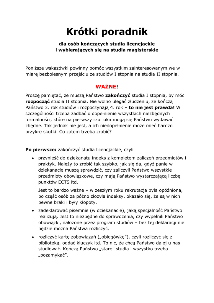 Krótki poradnik dla osób kończących studia licencjackie i wybierających się na studia magisterskie Poniższe wskazówki powinny pomóc wszystkim zainteresowanym we w miarę bezbolesnym przejściu ze studiów I stopnia na studia II stopnia. WAŻNE! Proszę pamiętać, że muszą Państwo zakończyć studia I stopnia, by móc rozpocząć studia II stopnia. Nie wolno ulegać złudzeniu, że kończą Państwo 3. rok studiów i rozpoczynają 4. rok – to nie jest prawda! W szczególności trzeba zadbać o dopełnienie wszystkich niezbędnych formalności, które na pierwszy rzut oka mogą się Państwu wydawać zbędne. Tak jednak nie jest, a ich niedopełnienie może mieć bardzo przykre skutki. Co zatem trzeba zrobić? Po pierwsze: zakończyć studia licencjackie, czyli przynieść do dziekanatu indeks z kompletem zaliczeń przedmiotów i praktyk. Należy to zrobić tak szybko, jak się da, gdyż panie w dziekanacie muszą sprawdzić, czy zaliczyli Państwo wszystkie przedmioty obowiązkowe, czy mają Państwo wystarczającą liczbę punktów ECTS itd. Jest to bardzo ważne – w zeszłym roku rekrutacja była opóźniona, bo część osób za późno złożyła indeksy, okazało się, że są w nich pewne braki i były kłopoty. zadeklarować pisemnie (w dziekanacie), jaką specjalność Państwo realizują. Jest to niezbędne do sprawdzenia, czy wypełnili Państwo obowiązki, nałożone przez program studiów – bez tej deklaracji nie będzie można Państwa rozliczyć. rozliczyć kartę zobowiązań („obiegówkę”), czyli rozliczyć się z biblioteką, oddać kluczyk itd. To nic, że chcą Państwo dalej u nas studiować. Kończą Państwo „stare” studia i wszystko trzeba „pozamykać”. Po drugie: zrekrutować się na studia magisterskie, czyli zarejestrować się w IRCE i wypełnić odpowiedni formularz. IRKA jest otworzona do 13 września. wnieść opłatę rekrutacyjną w wysokości 80 PLN (także do 13 września). zdać egzamin licencjacki w czerwcu lub we wrześniu (lub mieć zdany tenże egzamin – nie wcześniej niż 16 miesięcy przed zamknięciem IRKI). dostarczyć komplet dokumentów do dziekanatu: kwestionariusz osobowy, wydrukowany z systemu rejestracji elektronicznej i podpisany przez kandydata (chodzi o kwestionariusz wygenerowany podczas tej rejestracji, a nie np. sprzed roku), fotokopię dowodu osobistego lub innego dowodu tożsamości, dwie fotografie, zgodne z wymaganiami stosowanymi przy wydawaniu dowodów osobistych (35 mm x 45 mm). Proszę pamiętać, że fakt, iż w tym momencie dziekanat ma Państwa „papiery” niczego nie zmienia – trzeba złożyć nowy komplet dokumentów (bo zaczynają Państwo nowe studia). Powodzenia! Jan Kraszewski