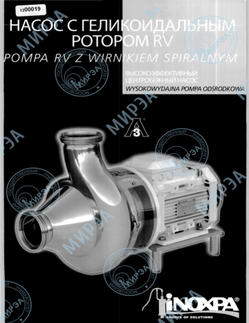 HACOC С ГЕЛИ РОТОРОМ RV 'ОМРА RVZ WIRNIKIEM SPIRALNYM ВЫСОКОЭФФЕКТИВНЫЙ WYSOKOWYDAJNA POMPA ODSRODKOWA SOURCE OF SOLUTIONS • "Моё личное обязательство и обязательство всей команды INOXPA состоит в предоставлении лучшего сервиса и комплескных решений, наиболее соответствующих вашим потребностям." Candi Granes, Генеральный директор "Zarowno moje osobiste zaangazowanie jak I kunszt cafego zespolu firmy INOXPA, gwarantujq mozliwie najlepszq obsluge oraz najlepsze rozwiqzania dostosowane do Pahstwa potrzeb" Candi Granes, General Manager pw ПЦИИ двутехнологи h> задачу. офици. предо 1Я ДЛЯ П| СЕРТИФИЦИРОВАННОЕ КАЧЕСТВО >именяем строгие I, FDA, ATEX, ГОСТ к каждому PRODUCENCIZ ENTUZJAZMEM Jestesmy przekonani, iz wszystkie produkty pochodzqce z oferty naszej firmy w polqczeniu z zaangazowaniem zespolu w jej rozwoj techniczny, zapewniajq naszym klientom najrzetelniejszq obslugq. Nasze motto firmowe oparte jest na regule: Ту potrzebujesz uzytecznej i efektywnej technologii spelniajqcej Twoje wymagania, a my traktujemy ten fakt jako wyzwanie, starajqc sie znalezt najbardziej optymalne rozwiqzanie. Naszym punktem wyjicia sq nie tylko wspaniale surowce, z ktorych powstajq produkty posiadajqce oficjalne certyfikaty, ale takze systemy i przebadane technologie - godne najwyzszego zaufania. Szeroki horyzont naszej oferty pozwala na przystosowanie danego produktu do procesow produkcyjnych naszych klientow. Ta determinacja do przystosowania kryje sie za znakiem firmowym, ktory bez wqtpienia posiada aspiracje, by stac s/? rzetelnym partnerem dla Paiistwa firmy. POSWIADCZONA JAKOSC Zgodnie z postanowieniem podwyzszania jakosci naszych produktow do najwyzszego poziomu, pracujemy zgodnie ze standardowymi wymogami oraz normami ustanowionymi certyfikatami ISO 9001, СЕ, ЗА, EHEDG, GOST, FDA czy ATEX. Ф cetim ATEX PED ( ( Насос RV - центробежный насос высокой эффективности. Лучший выбор для перекачивания больших объёмов при низком давлении (петли рециркуляции, линии возврата и т.д.), более эффективный по сравнению со стандартным центробежным насосом. Благодаря геликоидальному дизайну его крыльчатки, возможно перекачивание деликатных пищевых продуктов, не повреждая их, особенно твёрдых веществ в суспензии (с пропорцией от 40 % до 60 %). Идеален для перекачки кусочков фруктов или цельных фруктов, оливок, шампиньонов, долек апельсинов, стручковых, овощей, рыбы, и т.д., не повреждая продукт. Pompa RV jest wysokowydajna. pompa. odsrodkowa.. Stanowi ona najlepszy wybdr do przepompowywania duzych iloici ptynu przy niskiej wysokoSci podnoszenia (obwody recyrkulacyjne, przeptywy wsteczne, itp.). Oferuje znacznie lepsze osia.gi, niz standardowa pomba odsrodkowa. Dzieki srubowej konstrukcji wirnika, umozliwia przepompowywanie delikatnych produktOw spozywczych nie niszcza.c przy tym ich struktury - zwtaszcza ciat statych zawieszonych w wodzie (proporcje 40% do 60%). Pompa RV jest idealna do ttoczenia kawatkbw owocow lub nawet catych owocbw, oliwek, pieczarek, cza.stek pomarariczy, warzyw strqczkowych, warzyw, ryb, itp., nie powoduja.c uszkodzenia produktu. Ю м 3 /ч. Он вклк. кимми включениями. для раб щевыми нержавекн в оливковой ч фр 1елью упр зователем ч радиоуправляемым дистанционным пуль Модель RV 150 SP Model RV 150 SP RV-SP Pompa RV-SP, to pompa wyposazona w spiralny wirnik о wysokiej wydajnosci, dochodz^cej nawet do 3O0m3/h. Dysponuje opcjq samozasysania, umozliwiajax^ zasysanie na sucho cieczy zawieraja.cych zawiesiny. Wyprodukowana jest w catosci ze stali nierdzewnej typu AISI 316L oraz zaprojektowana do pracy z wysokojakosciowymi produktami spozywczymi. Pompa ta moze bye wykorzystywana w przemysle konserwowym do ttoczenia ciat statych (kukurydzy, zielonego groszku, pieczarek, itp.) zawieszonych w wodzie, przy produkcji oliwek (oliwki zawieszone w wodzie, wt^cznie z odmian^ „Gordal") oraz do ttoczenia owocow lub kawalkow owocow zawieszonych w wodzie. Bardzo delikatnie obchodzi sie z produktem. Pompa RV-SP jest mobilnym i solidnym urza.dzeniem, wyposazonym w przemiennik czestotliwosci oraz w panel sterowania elektrycznego wykonanego ze stali nierdzewnej. Opcjonalnie moze zostac dostarczona z systemem zdalnego sterowania wraz z pilotem. ОПЦИИ И МОДЕЛИ • Санитарный дизайн с зеркальной полировкой или промышленный с электрошлифованной поверхностью. • Присоединения SMS, Clamp, Macon, Garolla, FIL, RJT. • Панель управления СЕ с 10м кабеля и штепсельной вилкой. • Тележка из нержавеющей стали. • Дистанционное управления. Кожух. • Двигатель с преобразователем частоты. WYKONANIA OPCJONALNE • Wersja sanitarna о lustrzanie polerowanej powierzchni lub powierzchni przemystowej polerowanej elektrolitycznie. • Przyta.cza typu SMS, Clamp, Macon, Garolla, FIL, RJT. Tablica sterownicza CE z przewodem о dlugosci 10moraz wtyczka.. Wozek wykonany ze stali nierdzewnej. • Pilot zdalnego sterowania. Ostona. • Silnik z przemiennik