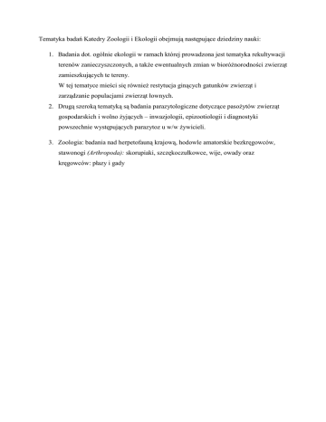 Tematyka badań Katedry Zoologii i Ekologii obejmują następujące dziedziny nauki: 1. Badania dot. ogólnie ekologii w ramach której prowadzona jest tematyka rekultywacji terenów zanieczyszczonych, a także ewentualnych zmian w bioróżnorodności zwierząt zamieszkujących te tereny. W tej tematyce mieści się również restytucja ginących gatunków zwierząt i zarządzanie populacjami zwierząt łownych. 2. Drugą szeroką tematyką są badania parazytologiczne dotyczące pasożytów zwierząt gospodarskich i wolno żyjących – inwazjologii, epizootiologii i diagnostyki powszechnie występujących parazytoz u w/w żywicieli. 3. Zoologia: badania nad herpetofauną krajową, hodowle amatorskie bezkręgowców, stawonogi (Arthropoda): skorupiaki, szczękoczułkowce, wije, owady oraz kręgowców: płazy i gady Opiekunami prac dyplomowych mogą być: 1. Prof. dr hab. Maria Rościszewska Dziedzina: Fauna bezkręgowców terenów zanieczyszczonych 2. Dr hab. Zbigniew Bonczar, prof. UR Dziedzina: Funkcjonowanie populacji zwierząt w różnych ekosystemach Przykładowe tematy prac: 1. Funkcjonowanie miejskiej populacji (grzywacza, pustułki, puszczyka krukowatych) w aglomeracji krakowskiej. 2. Środowiskowe uwarunkowania funkcjonowania populacji jarząbka w lasach górskich 3. Dr Irena Grześ Dziedzina: Entomologia środowiskowa: odpowiedź owadów (mrówki, chrząszcze) na zanieczyszczenia, różnorodność gatunkowa na terenach zanieczyszczonych i zdegradowanych, biologia i ekologia owadów społecznych. Przykładowe tematy prac: 1. Zmiany morfologiczne u owadów jako wskaźnik zanieczyszczenia. 2. Unikanie skażonego pokarmu u bezkręgowców: przykłady, mechanizm, i znaczenie w tolerancji metali ciężkich. 3. Mechanizmy tolerancji zanieczyszczeń metalami ciężkimi u owadów. 4. Dlaczego różnorodność gatunkowa owadów może być większa na terenach skażonych niż na terenach czystych? 5. Hipoteza średnich zaburzeń i jej znaczenie w badaniach ekotoksykologicznych. 4. Dr Paweł Nosal Dziedzina: Zoologia ze szczególnym uwzględnieniem parazytologii. Przykładowe tematy prac: 1. Parazytofauna zwierząt z hodowli amatorskich 2. Parazytofauna dzików zasiedlających różne ekosystemy 3. Dynamika zarażenia królików w różnych warunkach chowu 4. Gzowate jako pasożyty zwierząt hodowlanych 5. Parazytofauna parzystokopytnych utrzymywanych w ogrodach zoologicznych. 5. Dr Marta Skalska Dziedzina: Parazytologia środowiskowa: zależność stanu i dynamiki zarażenia bydła, owiec i kóz oraz przeżuwaczy wolno żyjących od warunków chowu, wieku, płci, rasy oraz systemu chowu, charakterystyka i znaczenie pasożytów najczęściej występujących u przeżuwaczy. Przykładowe tematy prac: 1. Zarażenie pasożytami przewodu pokarmowego owiec w obiekcie A w sezonie pastwiskowym (rok). 2. Dynamika zarażenia pasożytami przewodu pokarmowego kóz w chowie pastwiskowym. 3. Biologia i znaczenie tasiemców z rodzaju Moniezia w chowie bydła. Biologiczne adaptacje Protostrongylidae do pasożytowania 6. Dr Sławomir Kornaś Dziedzina: Zoologia ze szczególnym uwzględnieniem parazytologii. Przykładowe tematy prac: 1. Występowanie endopasożytów u kotów i psów z różnych środowisk 2. Endopasożyty koni w świetle badań koproskopowych i sekcyjnych 3. Parazytofauna zająca szaraka (Lepus europaeus) 4. Pasożytnicze muchówki (Diptera) jeleniowatych (Cervidae) 5. Bioróżnorodność pająków z rodziny ptasznikowatych (Theraphosidae) 6. Wpływ czynników fizyko-chemicznych na rozwój larwalny płazów z rodziny Dendrobatidae ] 7. Charakterystyka wybranych gatunków jaszczurek z rodziny Gekkonidae