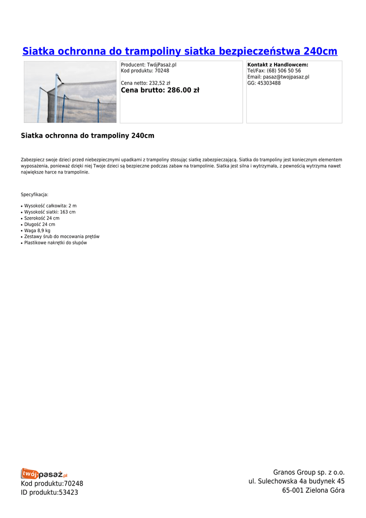 Siatka ochronna do trampoliny siatka bezpieczeństwa 240cm Producent: TwójPasaż.pl Kod produktu: 70248 Cena netto: 232,52 zł Kontakt z Handlowcem: Tel/Fax: (68) 506 50 56 Email: [email protected] GG: 45303488 Cena brutto: 286.00 zł Siatka ochronna do trampoliny 240cm Zabezpiecz swoje dzieci przed niebezpiecznymi upadkami z trampoliny stosując siatkę zabezpieczającą. Siatka do trampoliny jest koniecznym elementem wyposażenia, ponieważ dzięki niej Twoje dzieci są bezpieczne podczas zabaw na trampolinie. Siatka jest silna i wytrzymała, z pewnością wytrzyma nawet największe harce na trampolinie. Specyfikacja: ● ● ● ● ● ● ● Wysokość całkowita: 2 m Wysokość siatki: 163 cm Szerokość 24 cm Długość 24 cm Waga 8,9 kg Zestawy śrub do mocowania prętów Plastikowe nakrętki do słupów Kod produktu:70248 ID produktu:53423 Granos Group sp. z o.o. ul. Sulechowska 4a budynek 45 65-001 Zielona Góra