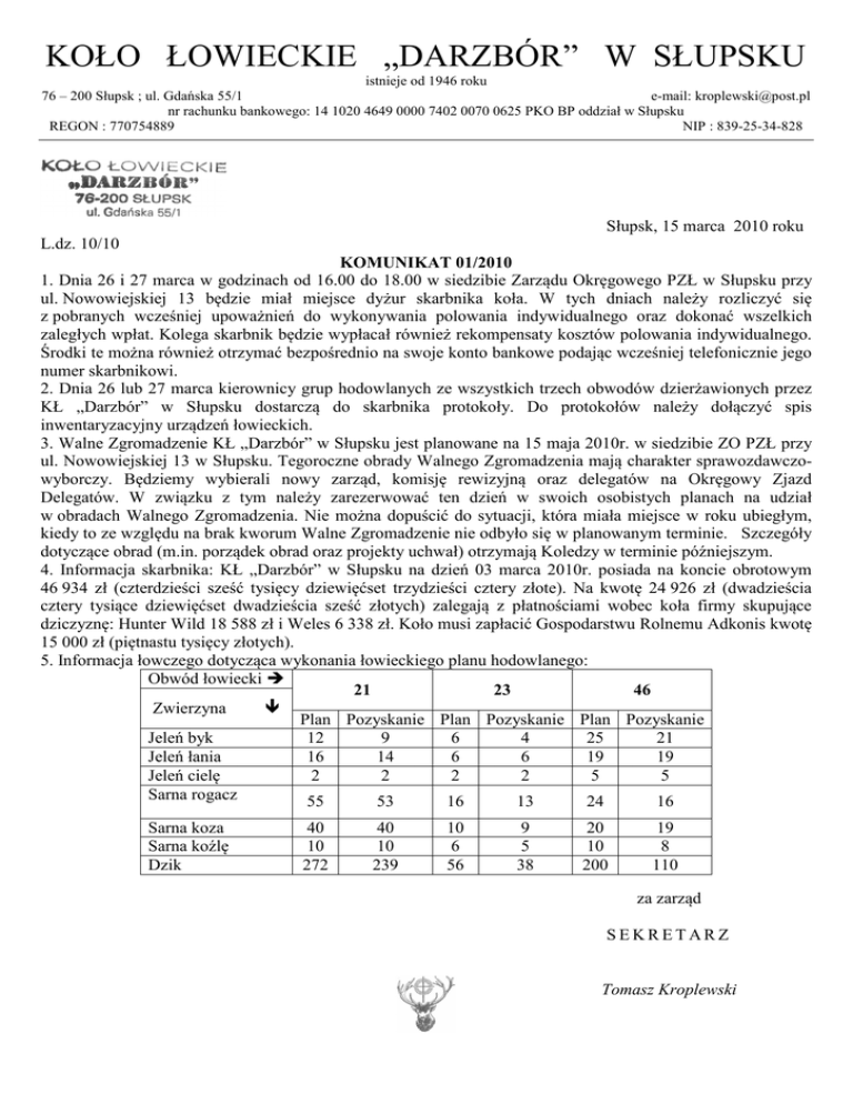 KOŁO ŁOWIECKIE „DARZBÓR” W SŁUPSKU istnieje od 1946 roku 76 – 200 Słupsk ; ul. Gdańska 55/1 e-mail: [email protected] nr rachunku bankowego: 14 1020 4649 0000 7402 0070 0625 PKO BP oddział w Słupsku REGON : 770754889 NIP : 839-25-34-828 Słupsk, 15 marca 2010 roku L.dz. 10/10 KOMUIKAT 01/2010 1. Dnia 26 i 27 marca w godzinach od 16.00 do 18.00 w siedzibie Zarządu Okręgowego PZŁ w Słupsku przy ul. Nowowiejskiej 13 będzie miał miejsce dyżur skarbnika koła. W tych dniach należy rozliczyć się z pobranych wcześniej upoważnień do wykonywania polowania indywidualnego oraz dokonać wszelkich zaległych wpłat. Kolega skarbnik będzie wypłacał również rekompensaty kosztów polowania indywidualnego. Środki te można również otrzymać bezpośrednio na swoje konto bankowe podając wcześniej telefonicznie jego numer skarbnikowi. 2. Dnia 26 lub 27 marca kierownicy grup hodowlanych ze wszystkich trzech obwodów dzierżawionych przez KŁ „Darzbór” w Słupsku dostarczą do skarbnika protokoły. Do protokołów należy dołączyć spis inwentaryzacyjny urządzeń łowieckich. 3. Walne Zgromadzenie KŁ „Darzbór” w Słupsku jest planowane na 15 maja 2010r. w siedzibie ZO PZŁ przy ul. Nowowiejskiej 13 w Słupsku. Tegoroczne obrady Walnego Zgromadzenia mają charakter sprawozdawczowyborczy. Będziemy wybierali nowy zarząd, komisję rewizyjną oraz delegatów na Okręgowy Zjazd Delegatów. W związku z tym należy zarezerwować ten dzień w swoich osobistych planach na udział w obradach Walnego Zgromadzenia. Nie można dopuścić do sytuacji, która miała miejsce w roku ubiegłym, kiedy to ze względu na brak kworum Walne Zgromadzenie nie odbyło się w planowanym terminie. Szczegóły dotyczące obrad (m.in. porządek obrad oraz projekty uchwał) otrzymają Koledzy w terminie późniejszym. 4. Informacja skarbnika: KŁ „Darzbór” w Słupsku na dzień 03 marca 2010r. posiada na koncie obrotowym 46 934 zł (czterdzieści sześć tysięcy dziewięćset trzydzieści cztery złote). Na kwotę 24 926 zł (dwadzieścia cztery tysiące dziewięćset dwadzieścia sześć złotych) zalegają z płatnościami wobec koła firmy skupujące dziczyznę: Hunter Wild 18 588 zł i Weles 6 338 zł. Koło musi zapłacić Gospodarstwu Rolnemu Adkonis kwotę 15 000 zł (piętnastu tysięcy złotych). 5. Informacja łowczego dotycząca wykonania łowieckiego planu hodowlanego: Obwód łowiecki 21 23 46 Zwierzyna Plan Pozyskanie Plan Pozyskanie Plan Pozyskanie Jeleń byk 12 9 6 4 25 21 Jeleń łania 16 14 6 6 19 19 Jeleń cielę 2 2 2 2 5 5 Sarna rogacz 55 53 16 13 24 16 Sarna koza Sarna koźlę Dzik 40 10 272 40 10 239 10 6 56 9 5 38 20 10 200 19 8 110 za zarząd SEKRETARZ Tomasz Kroplewski
