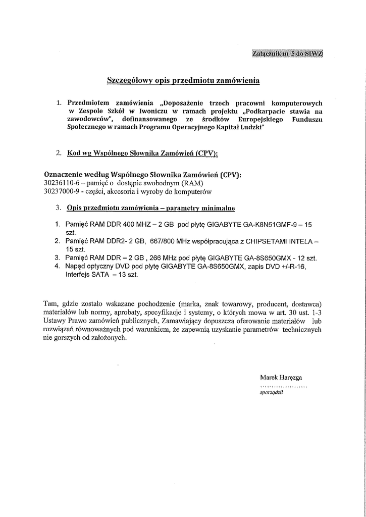 Szczegółowy 1. opis przedmiotu zamówienia Przedmiotem zamówienia „Doposażenie trzech pracowni komputerowych w Zespole Szkół w Iwoniczu w ramach projektu „Podkarpacie stawia na zawodowców", dofinansowanego ze środków Europejskiego Funduszu Społecznego w ramach Programu Operacyjnego Kapitał Ludzki" 2. Kod wg Wspólnego Słownika Zamówień (CPV): Oznaczenie według Wspólnego Słownika Zamówień (CPV): 30236110-6-pamięć o dostępie swobodnym (RAM) 30237000-9 - części, akcesoria i wyroby do komputerów 3. Opis przedmiotu zamówienia - parametry minimalne 1. Pamięć RAM DDR 400 MHZ - 2 GB pod płytę GIGABYTE GA-K8N51 GMF-9 - 15 szt. 2. Pamięć RAM DDR2- 2 GB, 667/800 MHz współpracująca z CHIPSETAMI INTELA- 15 szt. 3. 4. Pamięć RAM DDR - 2 GB, 266 MHz pod płytę GIGABYTE GA-8S650GMX- 12 szt. Napęd optyczny DVD pod płytę GIGABYTE GA-8S650GMX, zapis DVD +/-R-16, Intertejs SATA - 13 szt. Tam, gdzie zostało wskazane pochodzenie (marka, znale towarowy, producent, dostawca) materiałów lub normy, aprobaty, specyfikacje i systemy, o których mowa w art. 30 ust. 1-3 Ustawy Prawo zamówień publicznych, Zamawiający dopuszcza oferowanie materiałów lub rozwiązań równoważnych pod warnnkiem, że zapewnią uzyskanie parametrów technicznych nie gorszych od założonych. Marek Haręzga sporządził